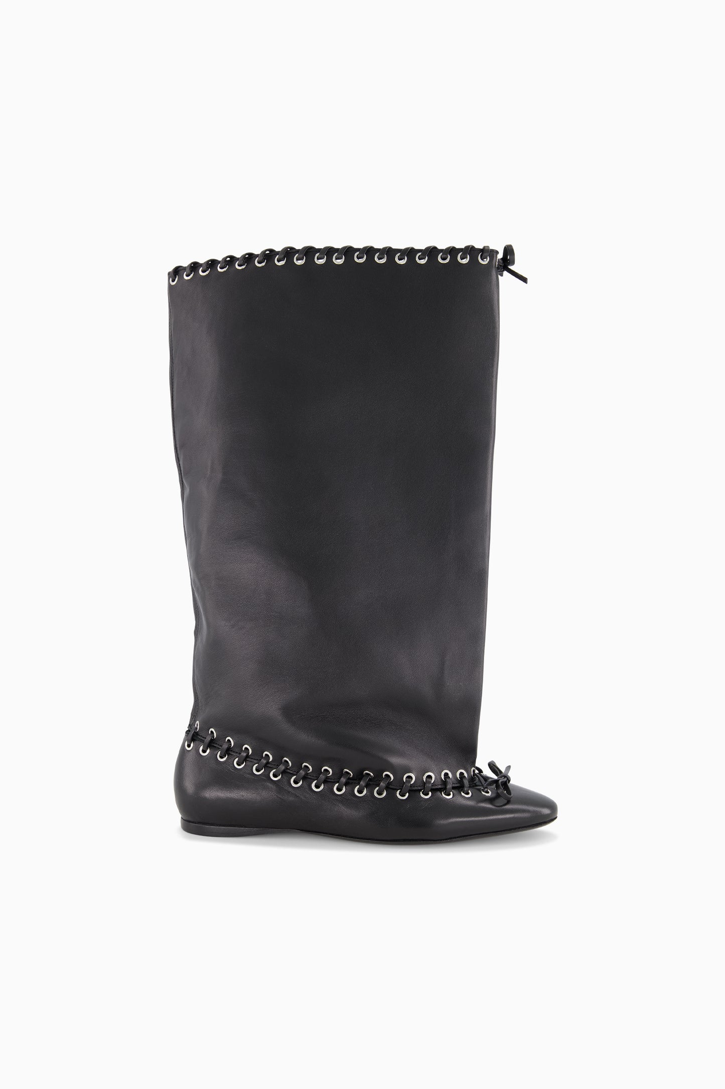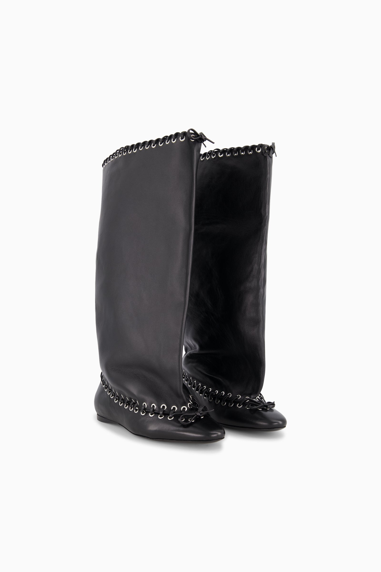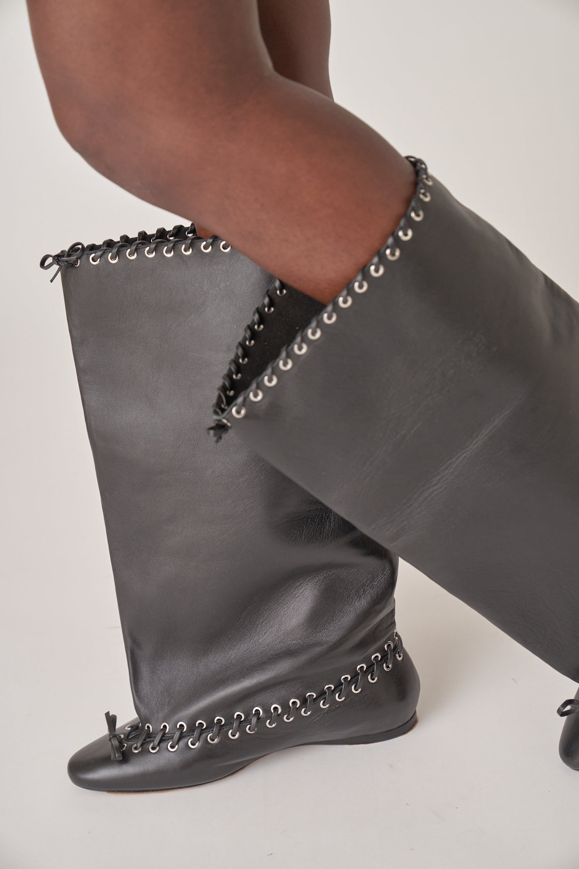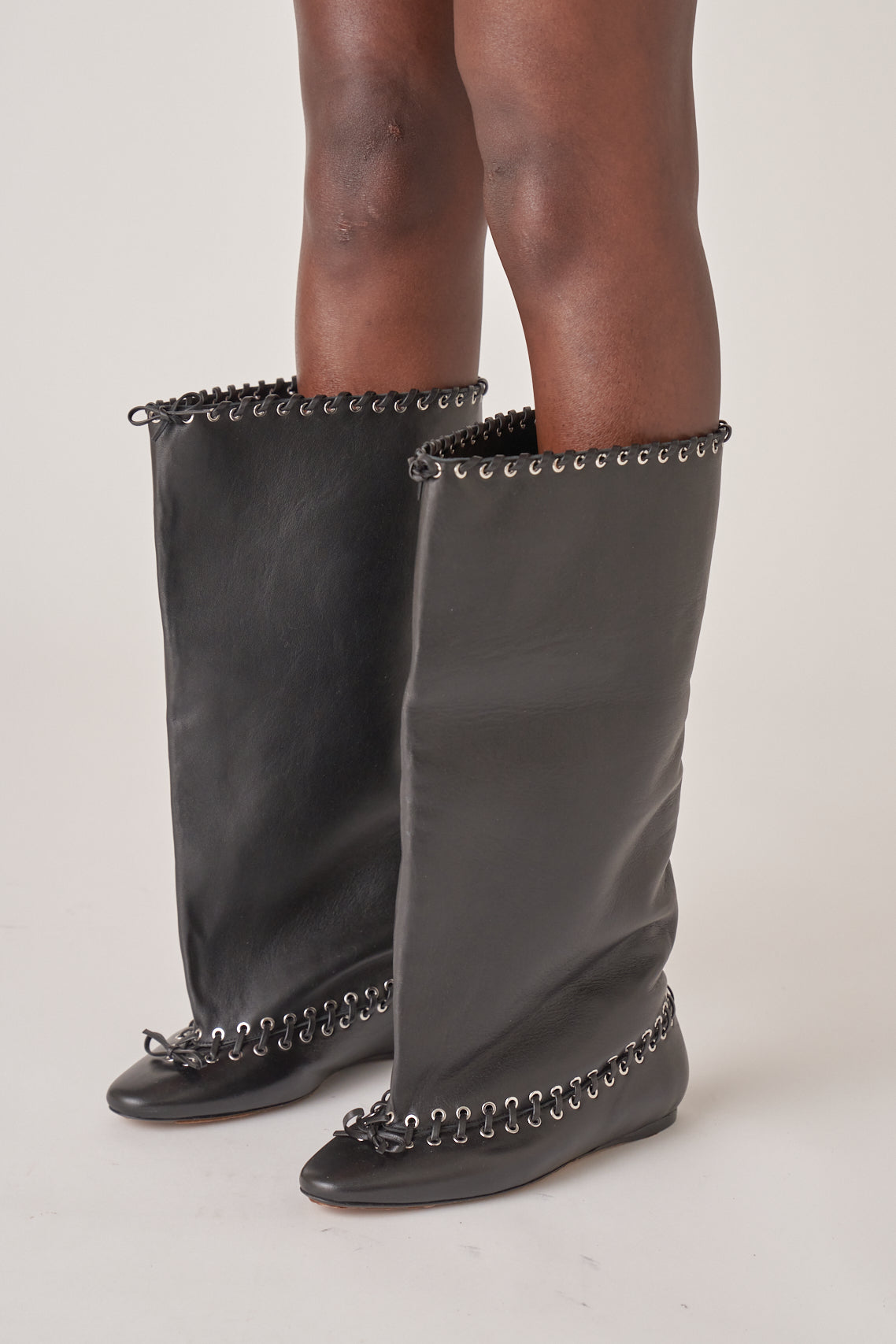 Mid-calf crinkled nappa leather boots in black. Lace-up detailing throughout. Bow accent at vamp and collar.