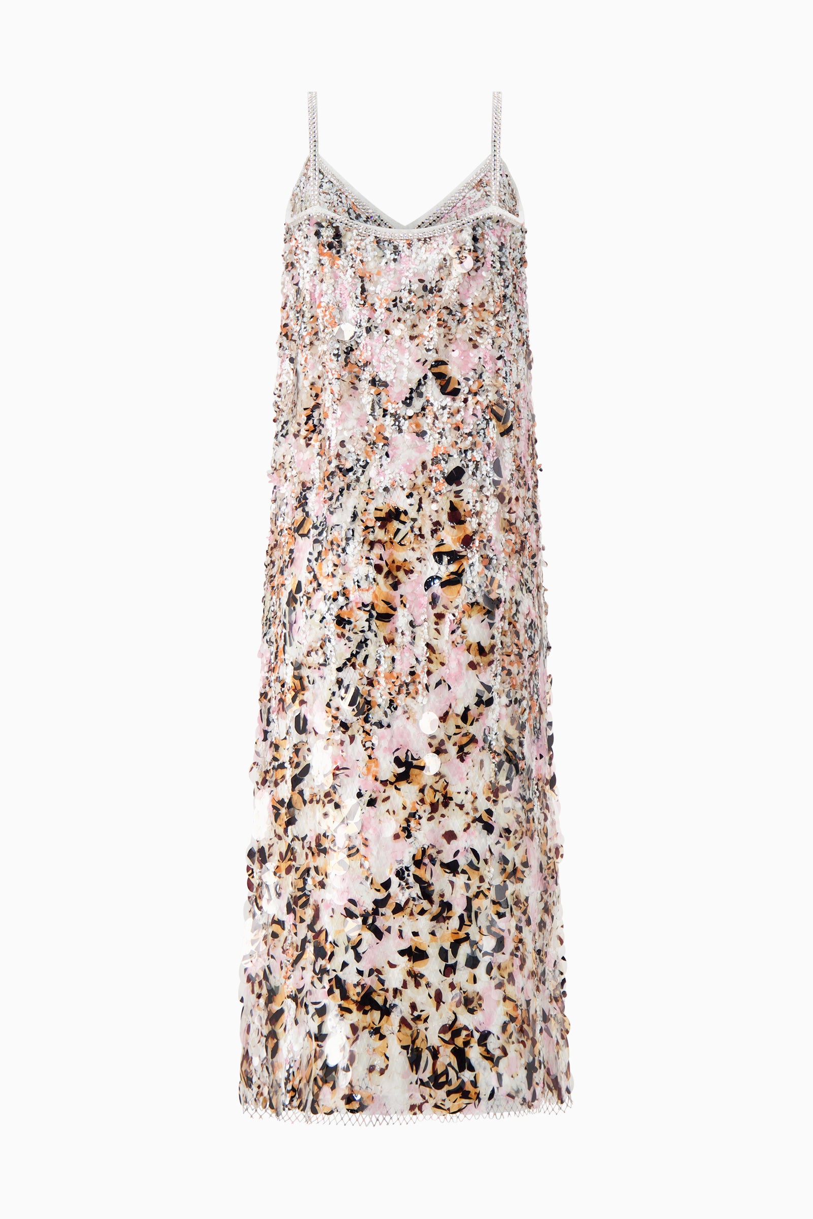 Midi-length dress embroidered with sequins. Neckline, straps, and front bow decorated with stones. Thin straps. Lace trim.