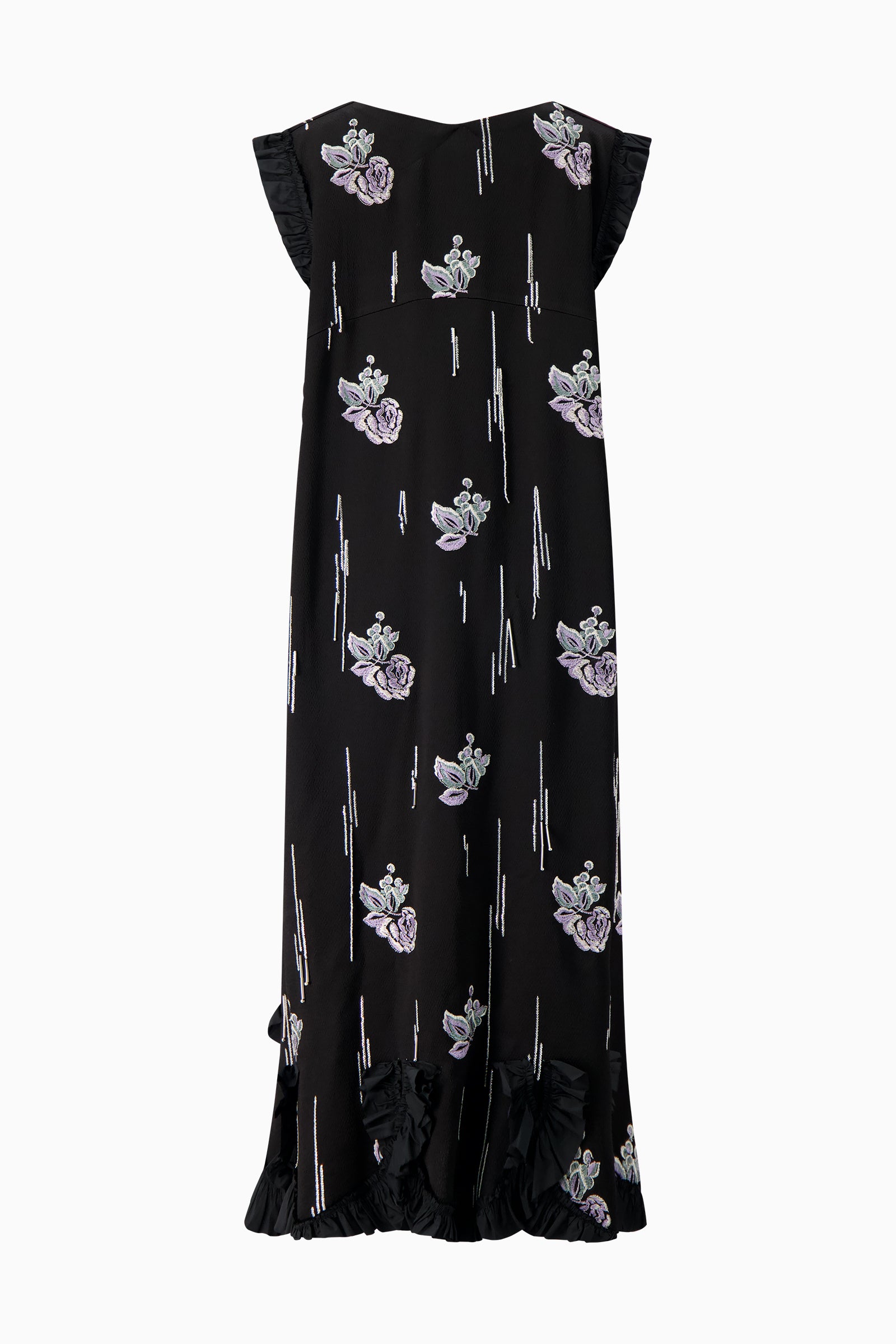 Sleeveless maxi dress with all-over floral embroidery. Designed with a V-neckline, ruffled trim at the shoulders and hem, and softly flared silhouette.