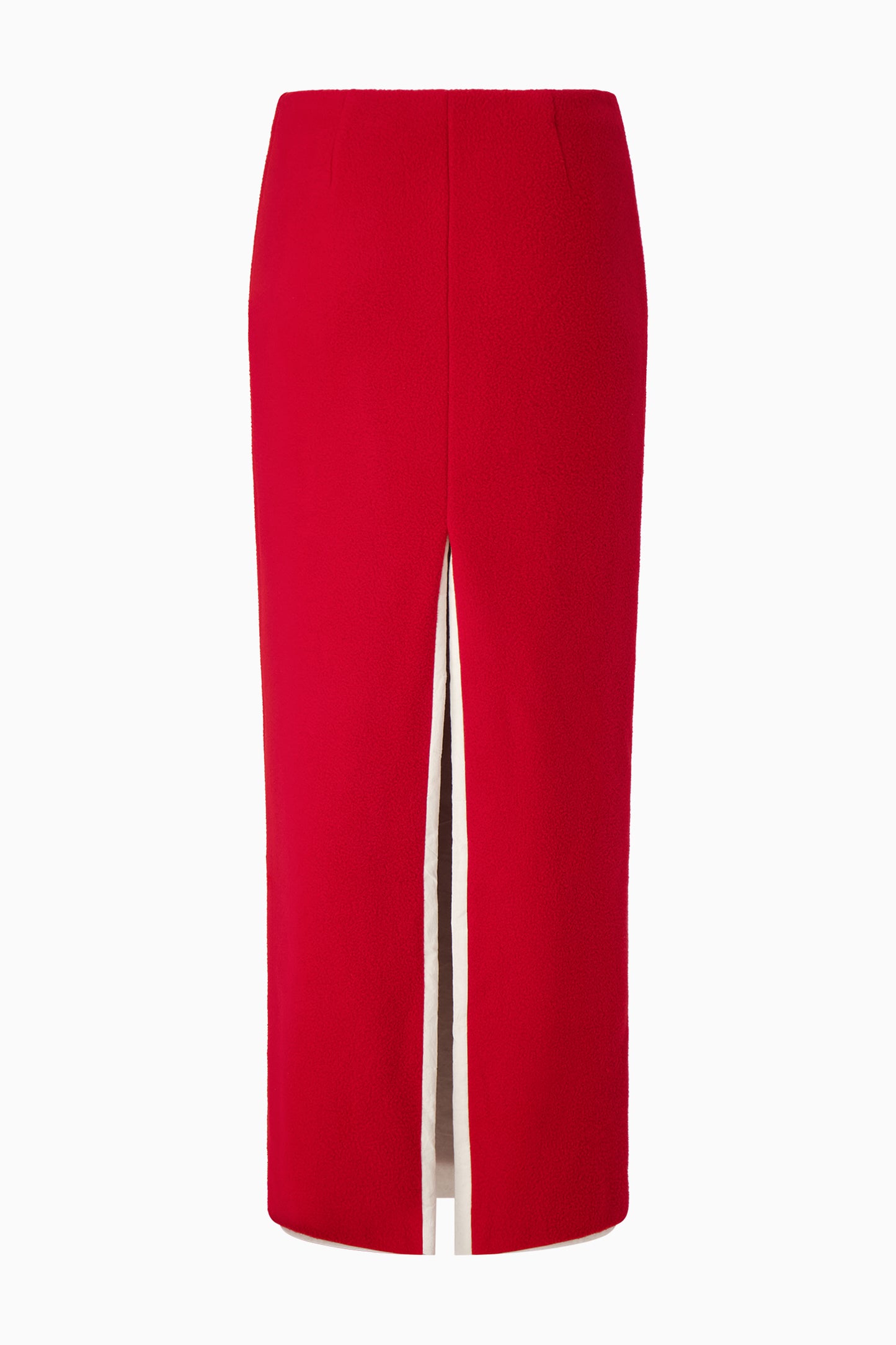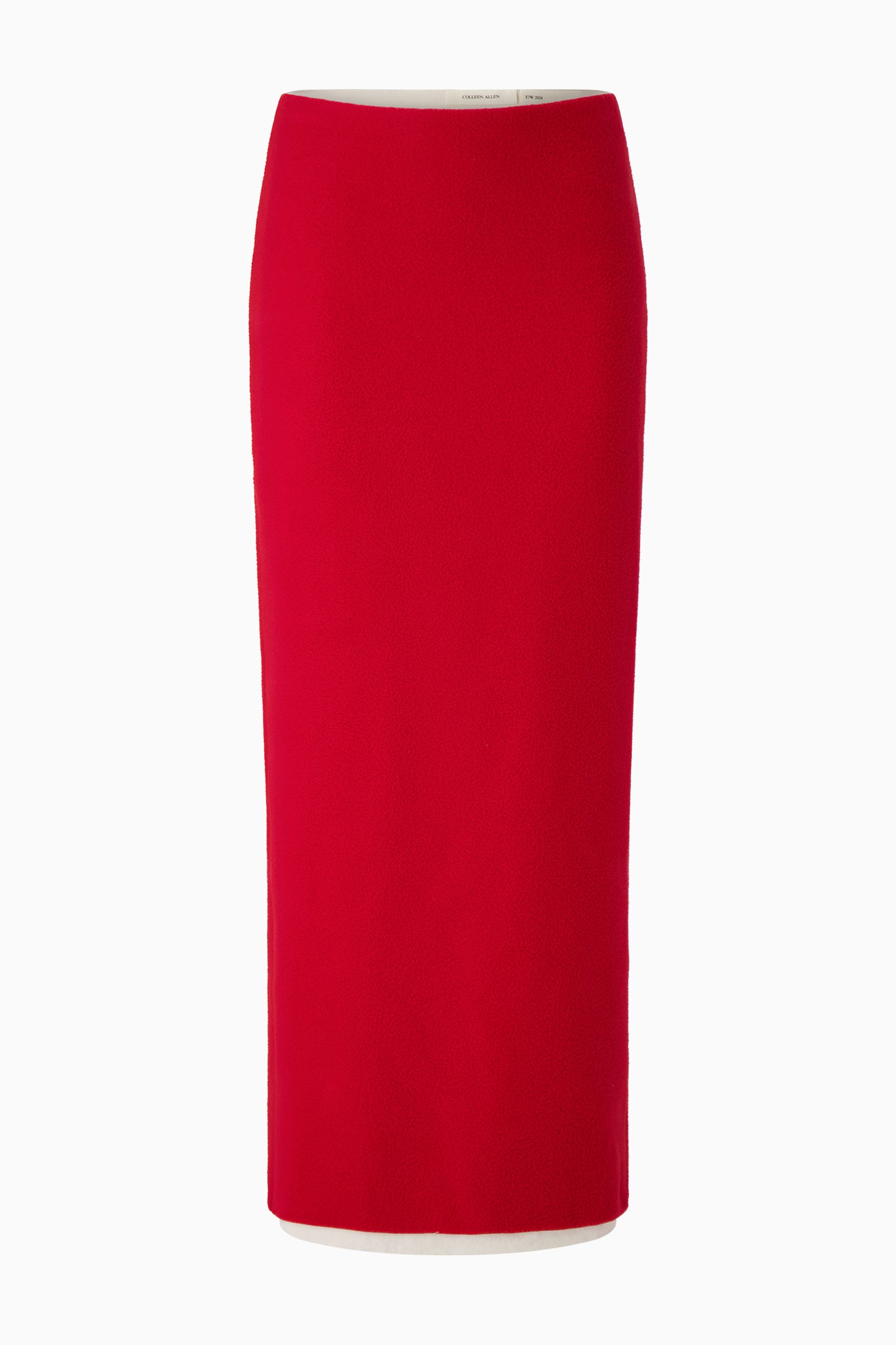 Polyester fleece maxi skirt. Raw edge at hem. Zip closure at back. Central vent at back hem. Exposed crinkled cotton calico lining.