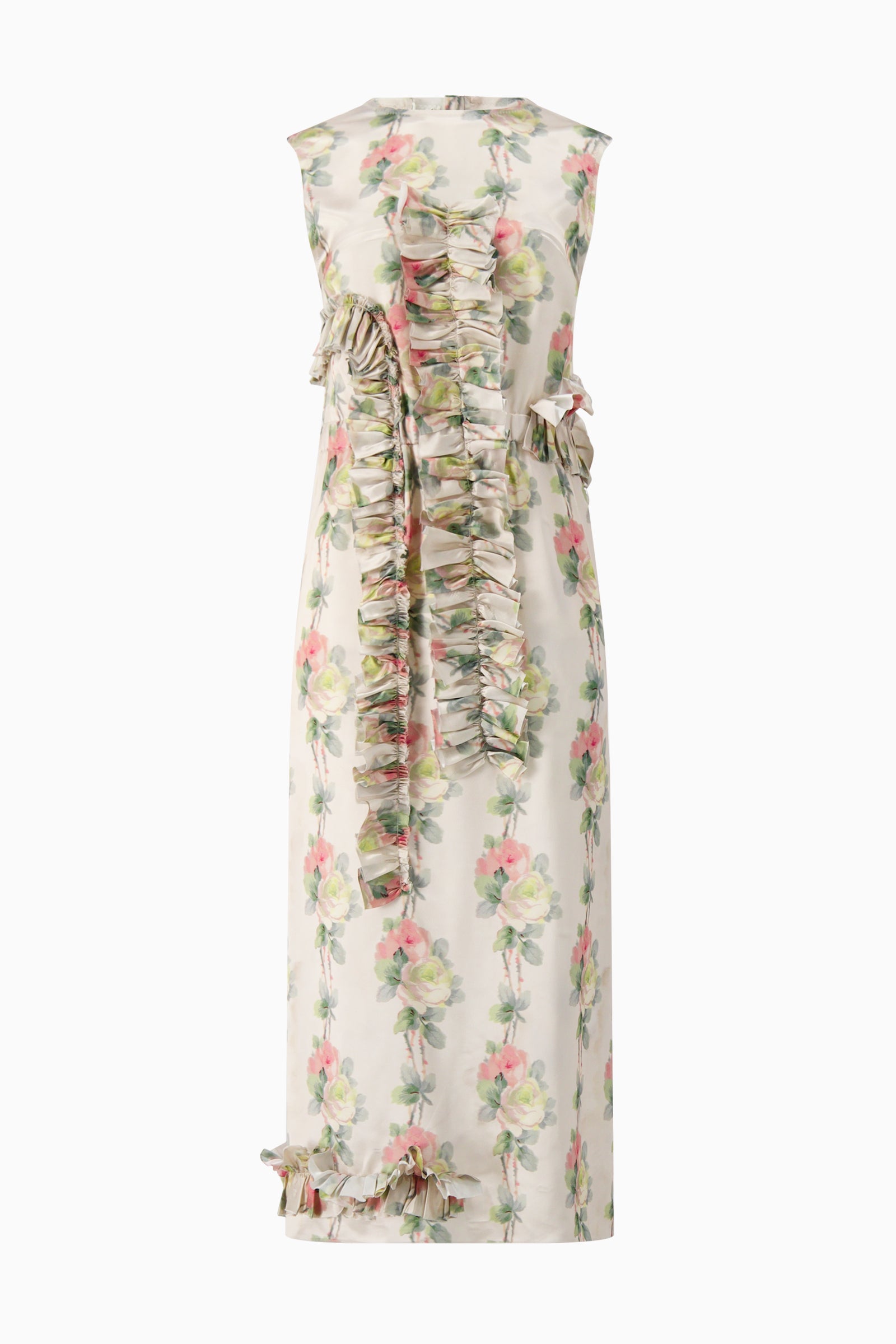 Sleeveless midi dress in a lightweight, floral printed fabric. Straight silhouette with high neckline and soft structure. Ruffled trim runs vertically through front and along hem. Subtle gathers at the waist.
