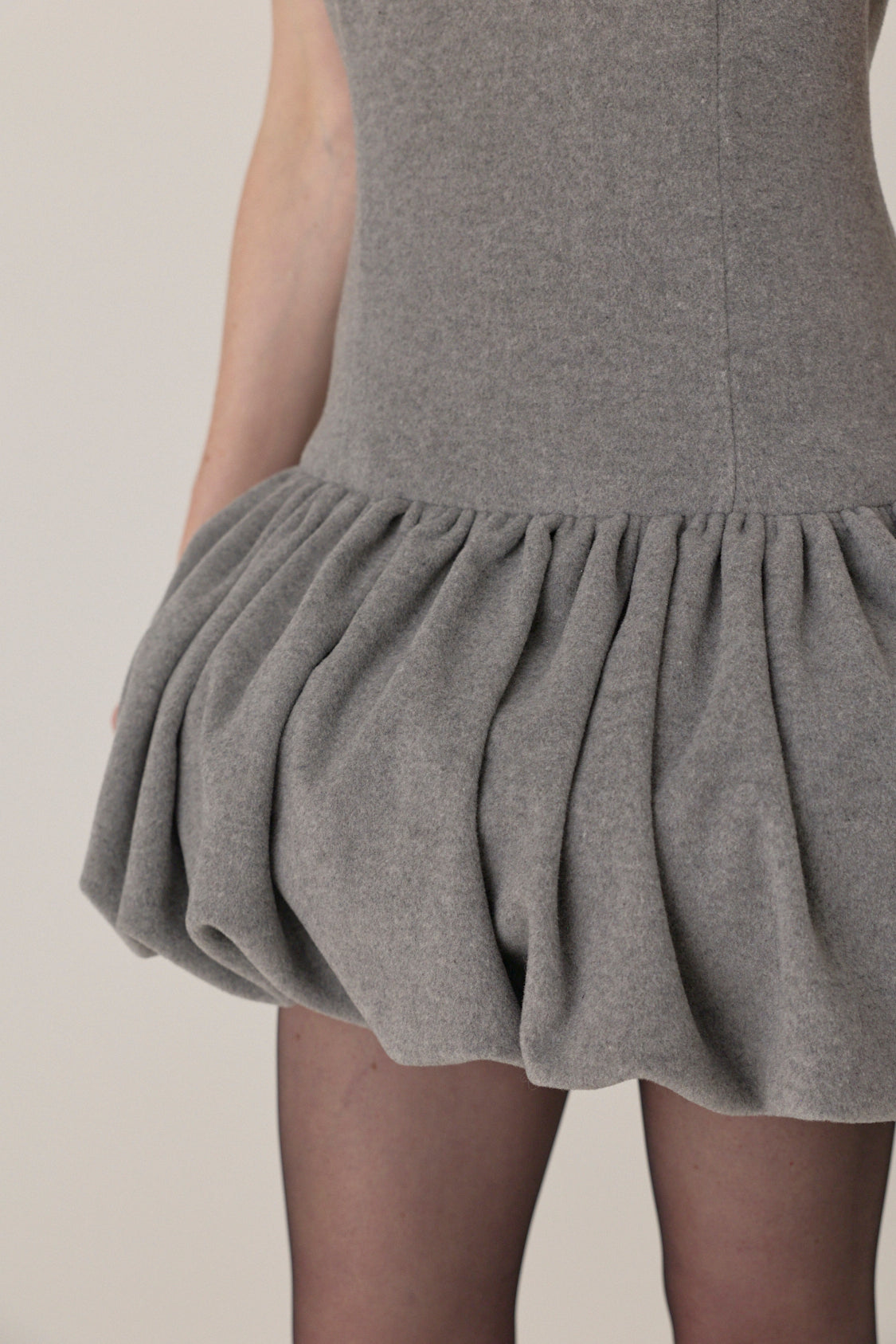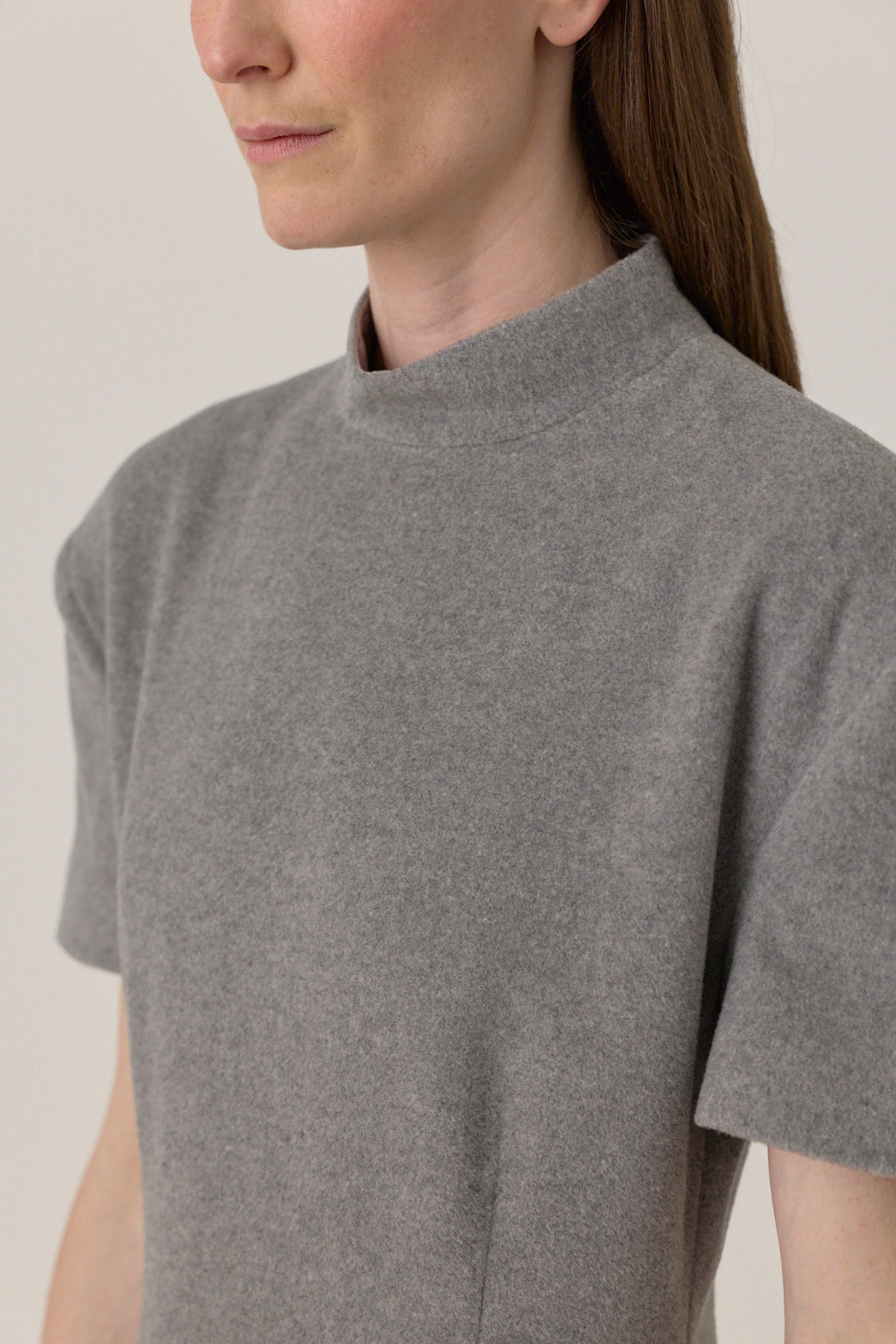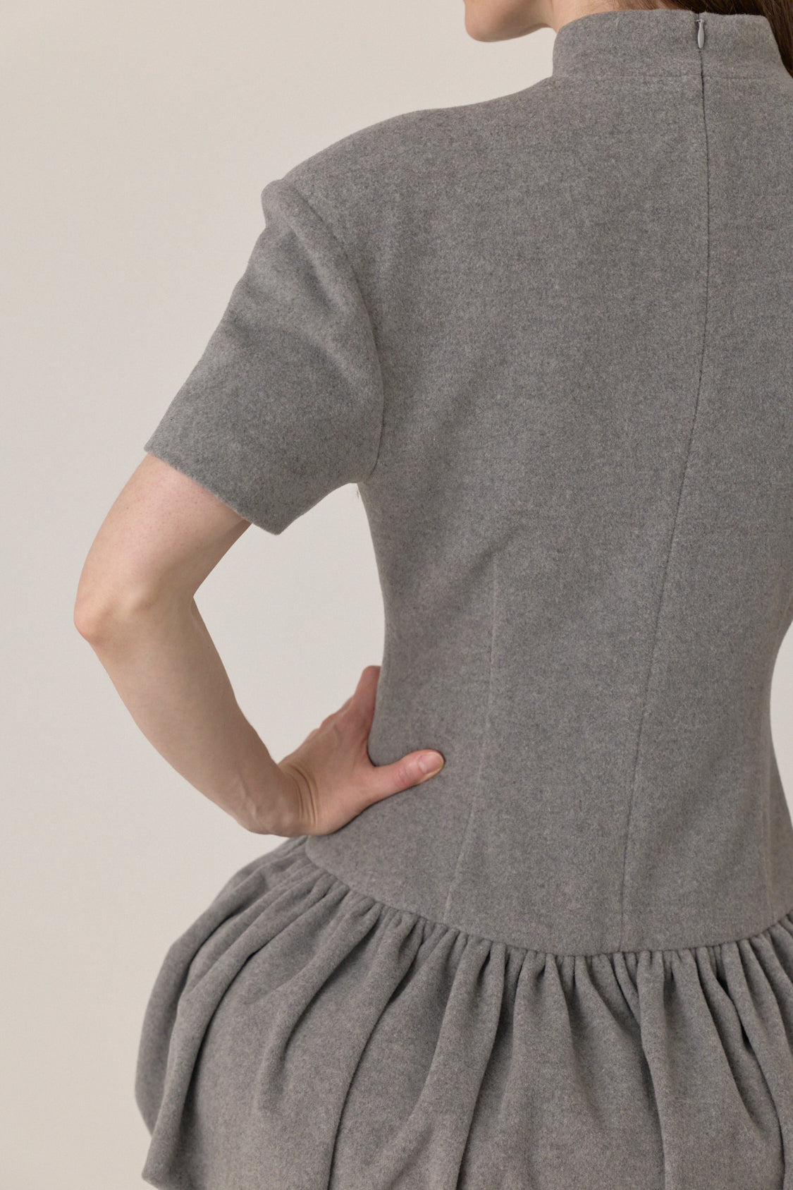 Structured mini dress with a sculptural bubble hem and fitted bodice. Features a mock neckline, short sleeves, and concealed back zip. Crafted in soft felted wool.