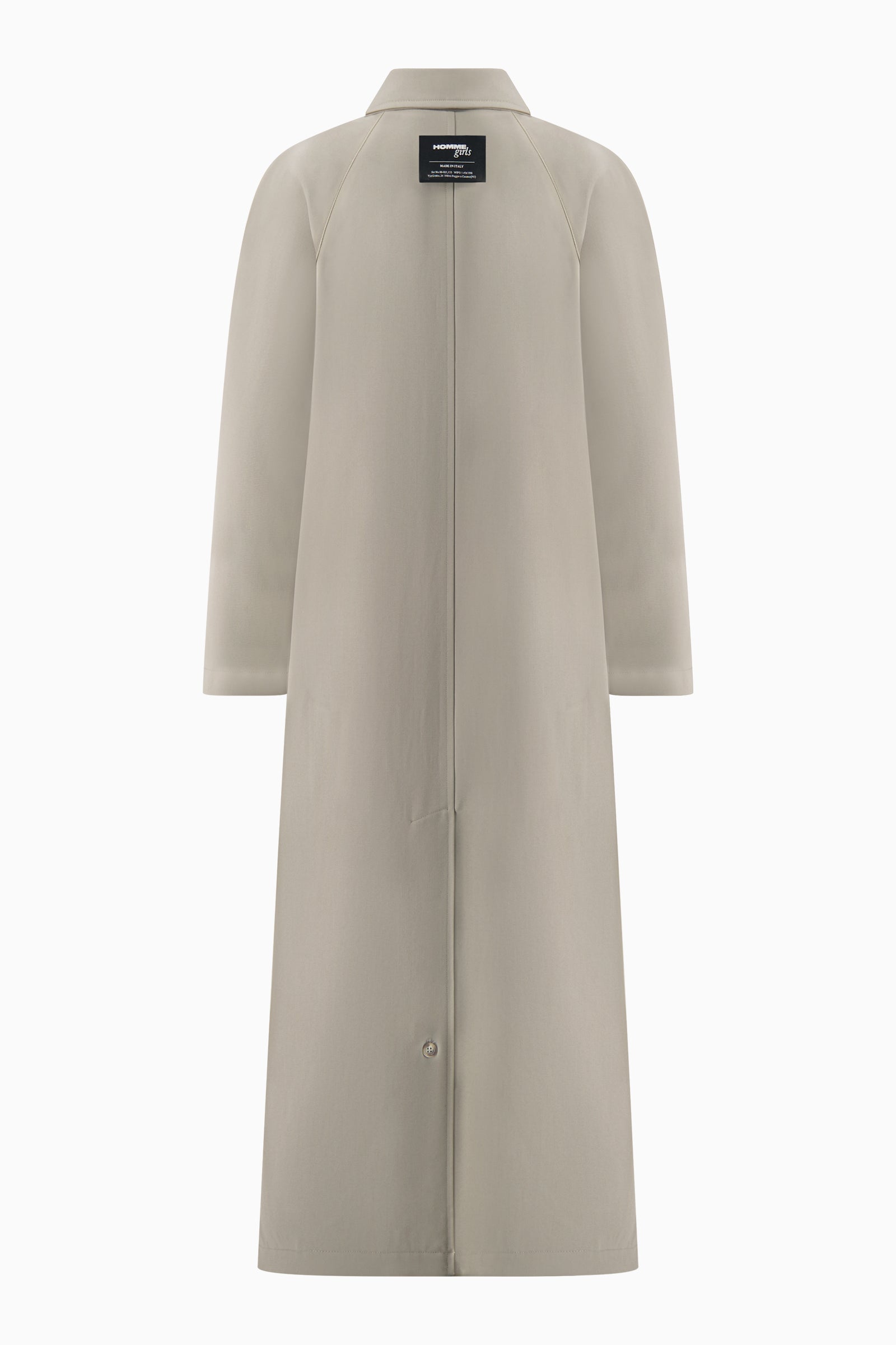 Clean-lined mac coat with relaxed, straight fit. Designed with raglan sleeves, discreet front pockets, and concealed button closure.