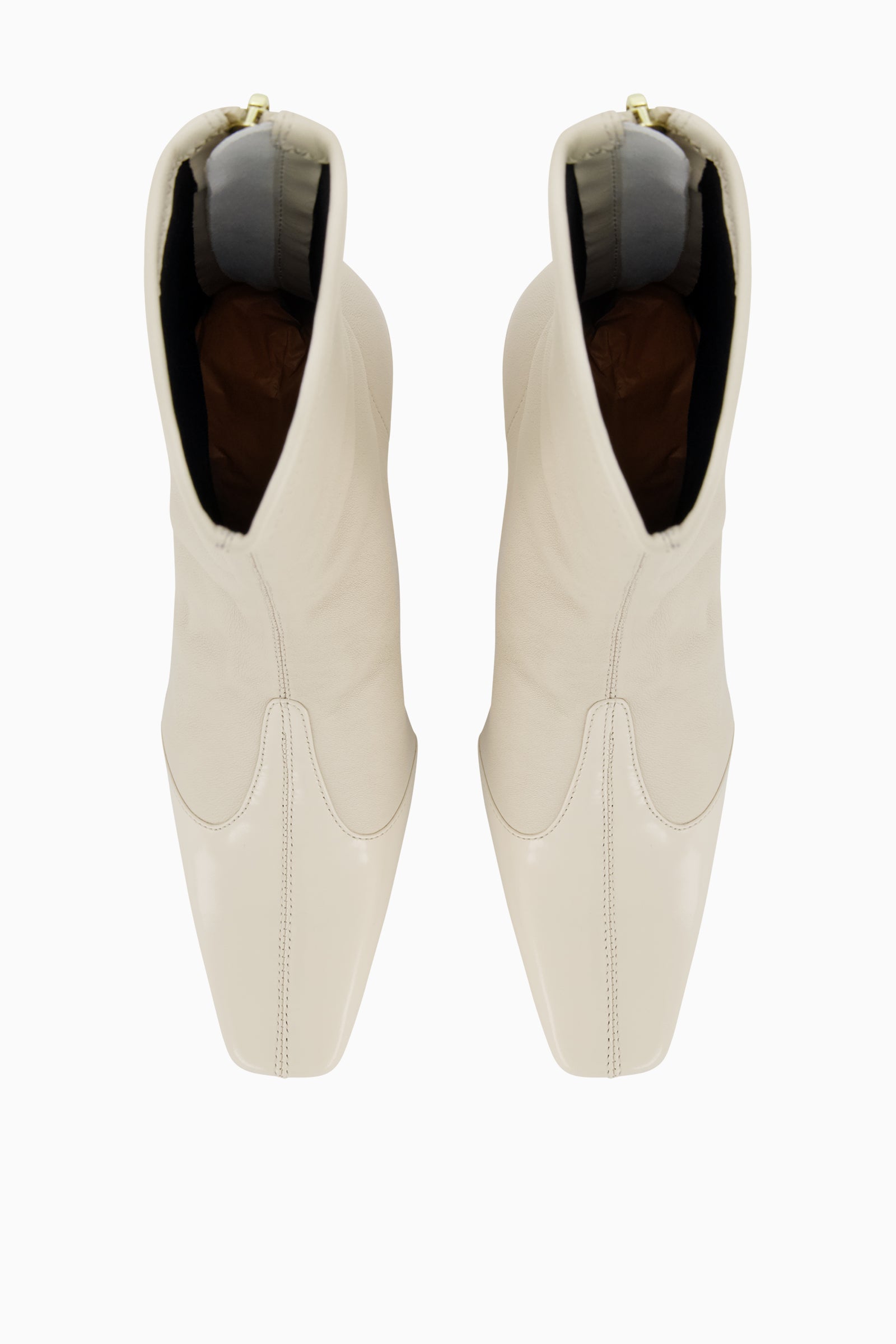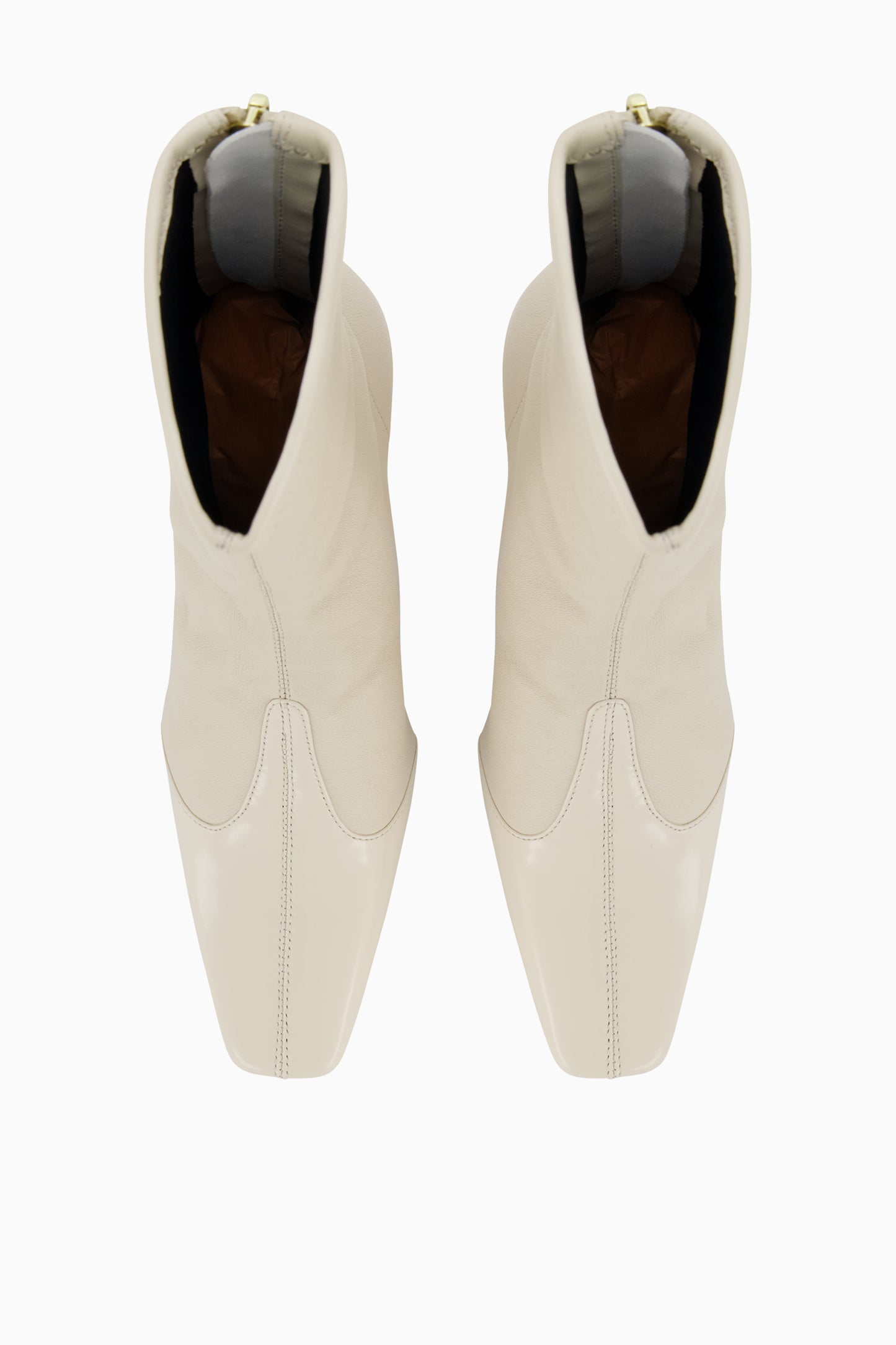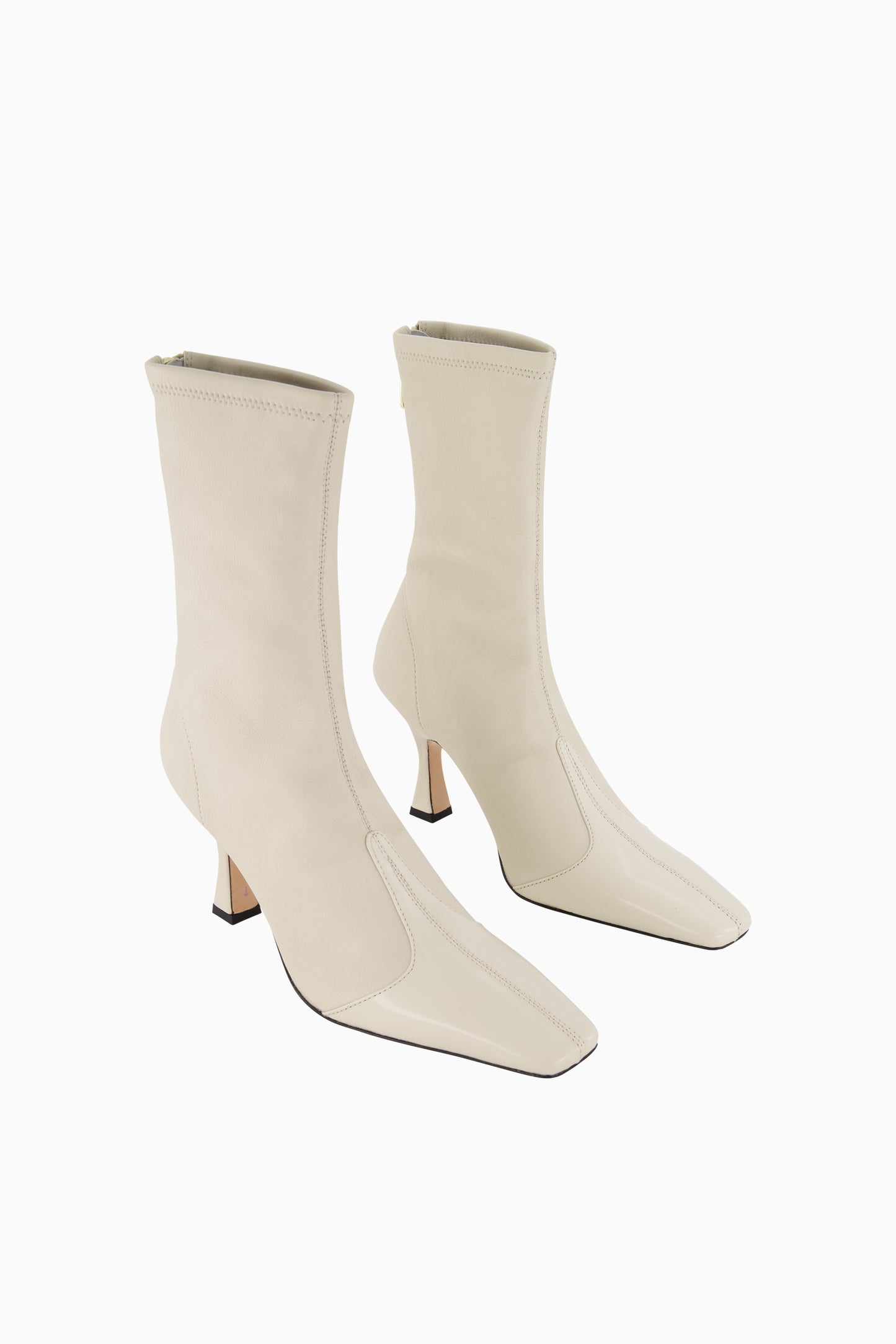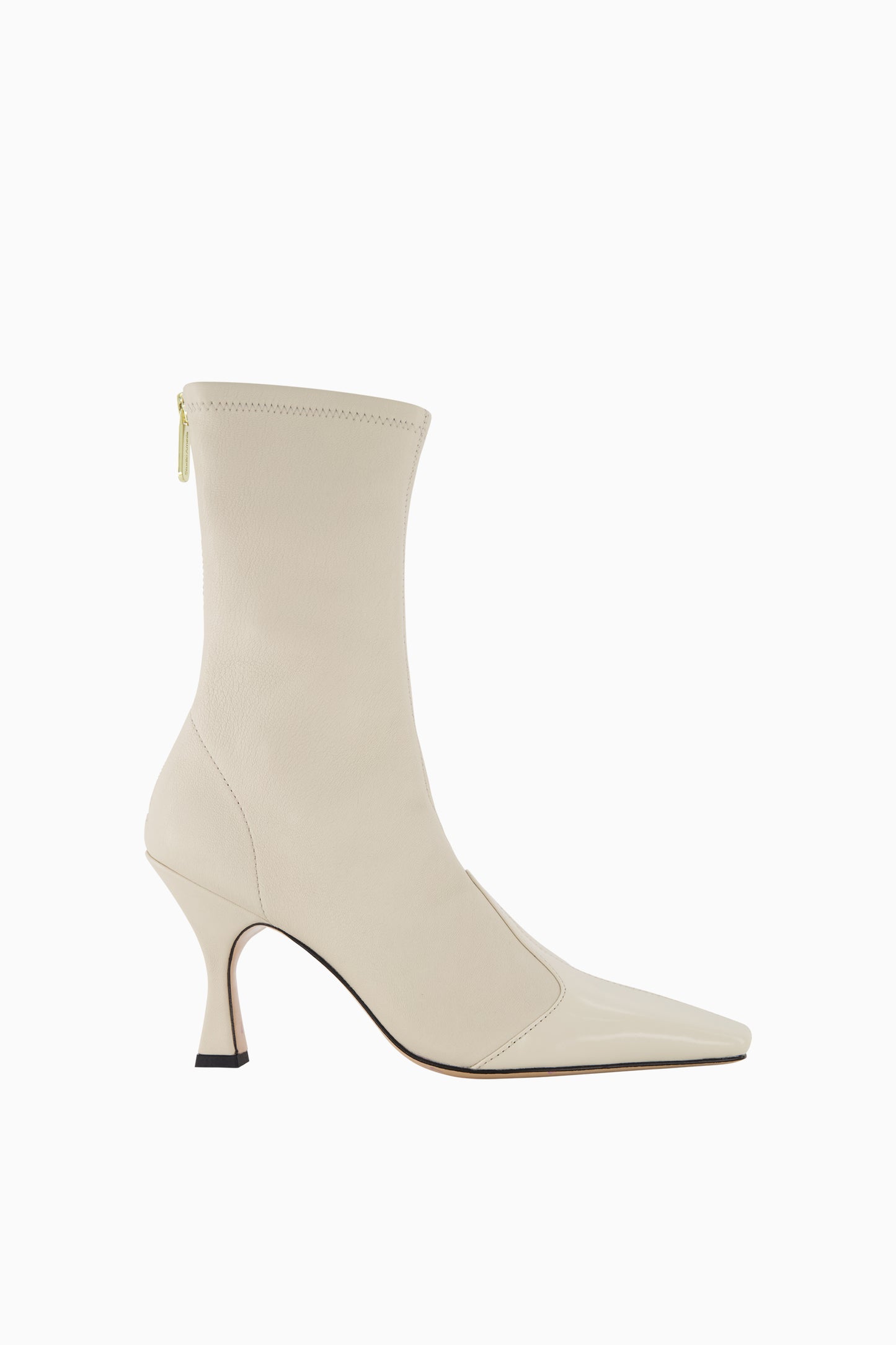 Softly structured mid-calf sock boot. Features soft sheep leather with a stretch backing to ensure a snug fit on the foot and over the ankle, a cowboy cut out contrast panel over the toes, a rear zipper with custom Studio Amelia zip puller and a squared Victorian 90mm leather covered heel.