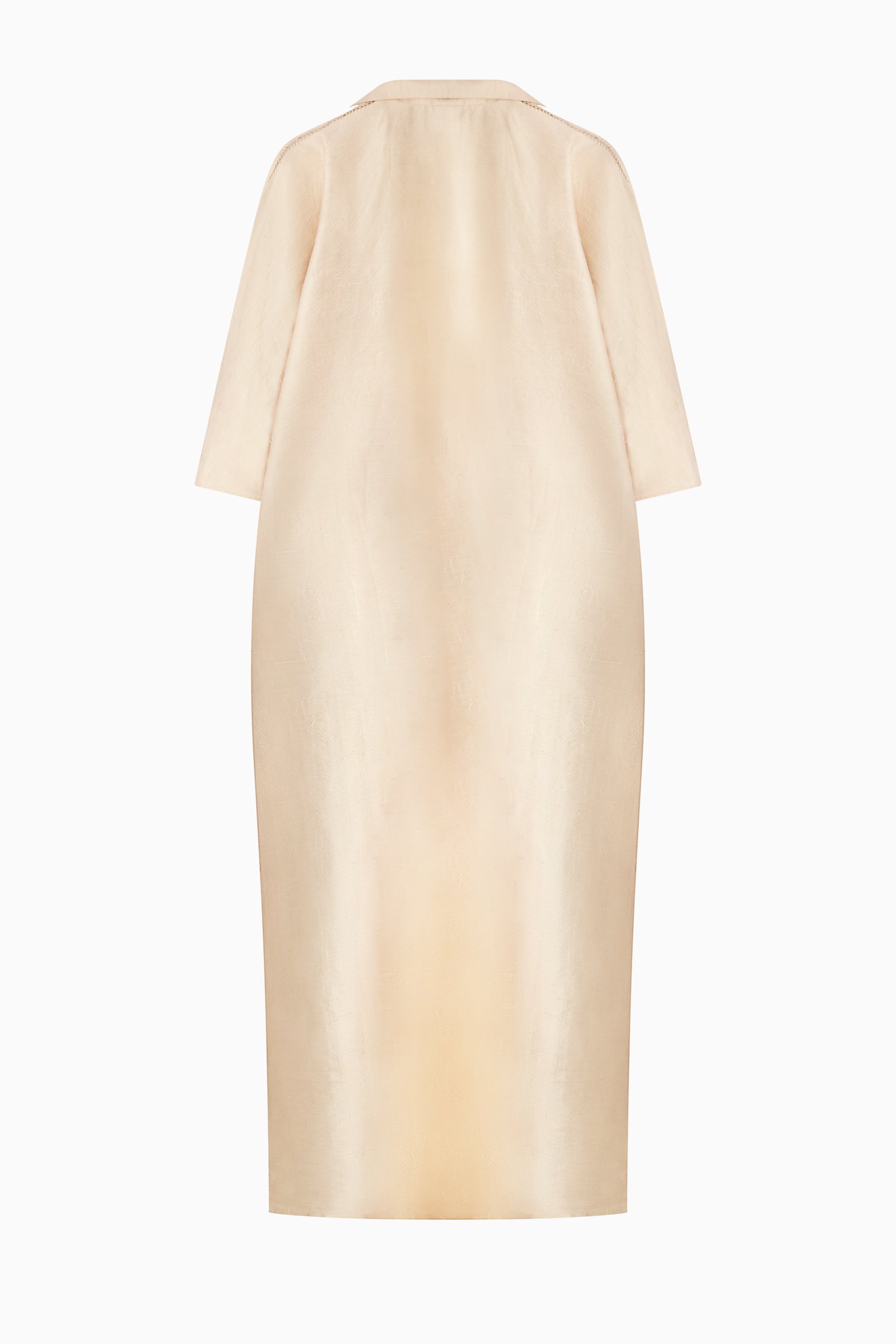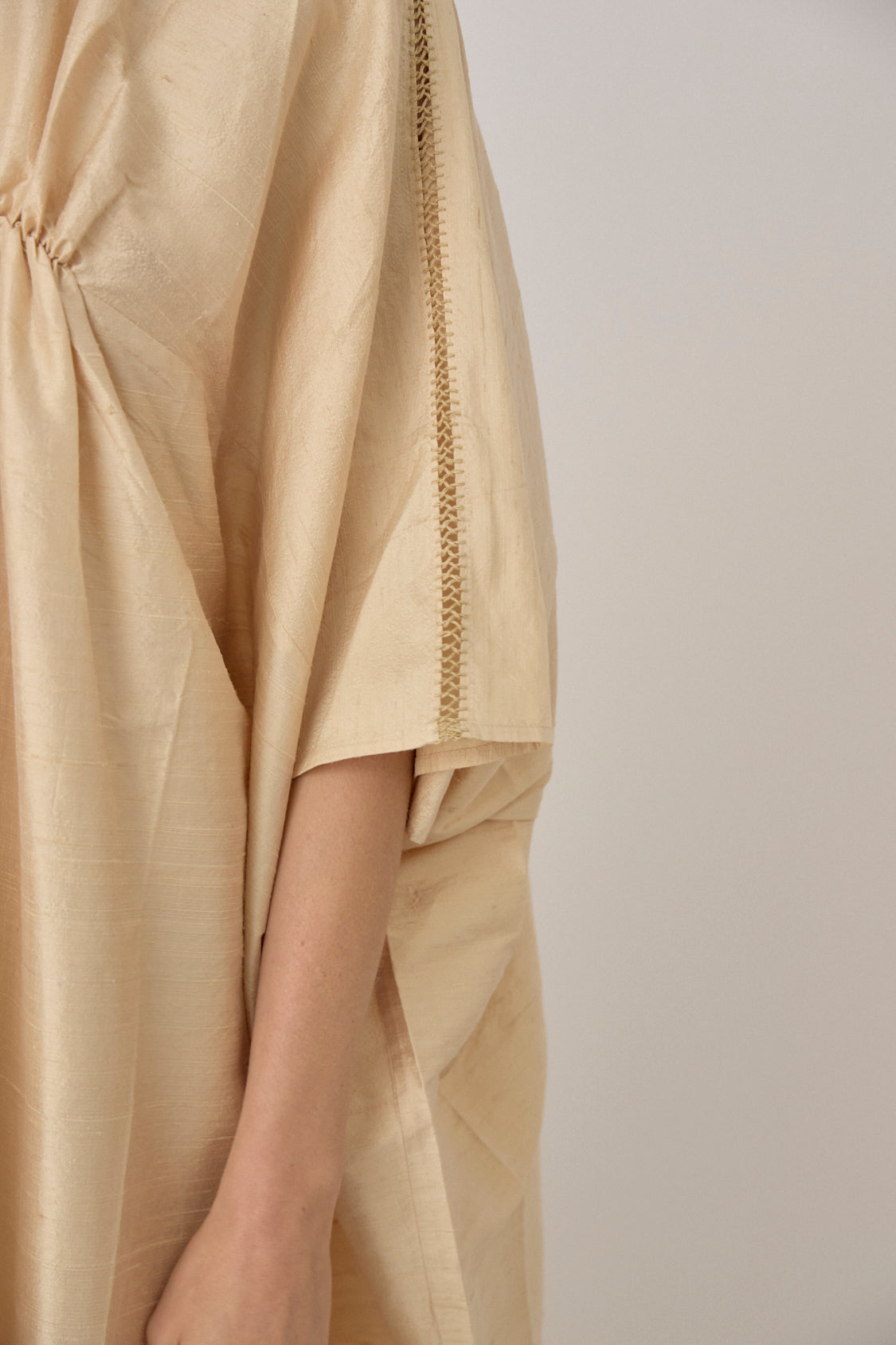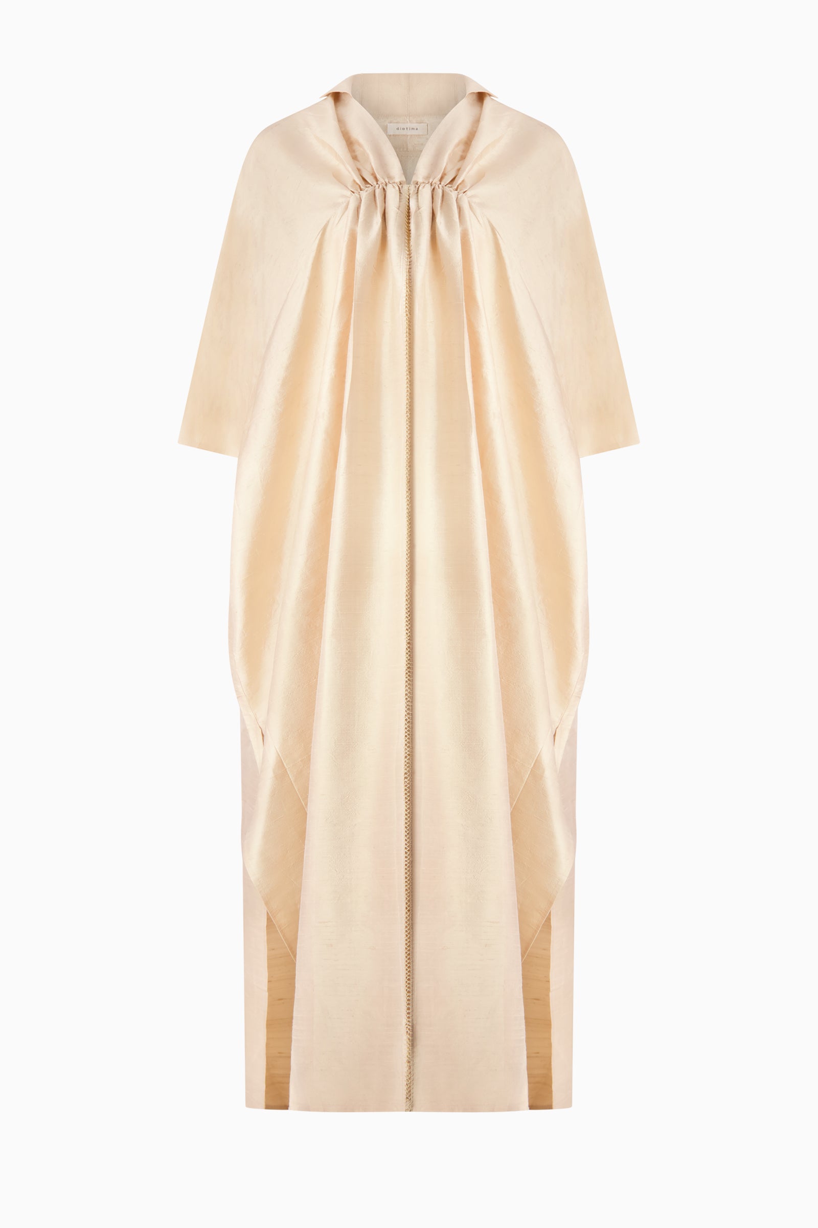 Silk caftan dress with gathered neckline, wide sleeves, and relaxed drape. Midi length with fluid silhouette.