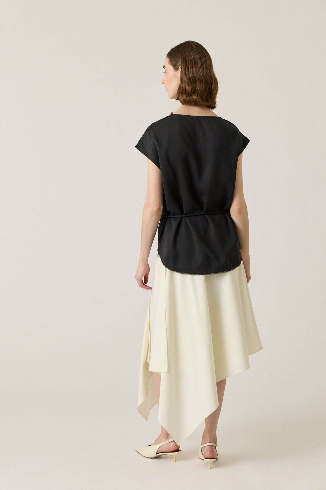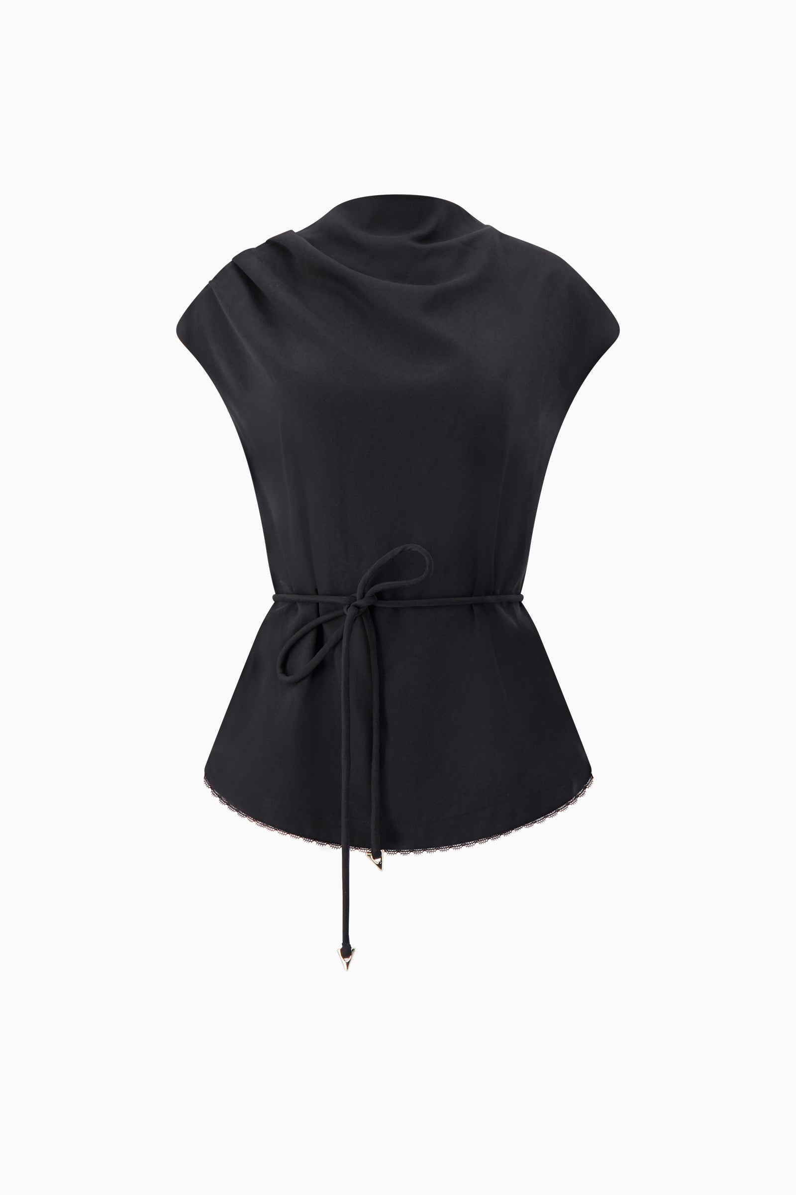 Sleeveless top with draped silhouette and slight cocooned shape. Lace trim on curved hem. Finished with signature A-motifs.