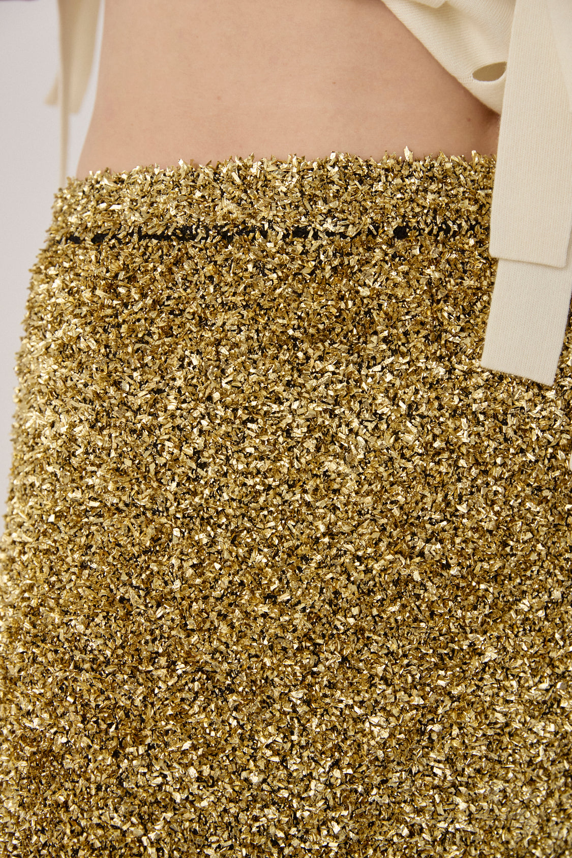 Metallic tinsel knit pencil skirt in gold with textured surface and straight silhouette. Midi length.