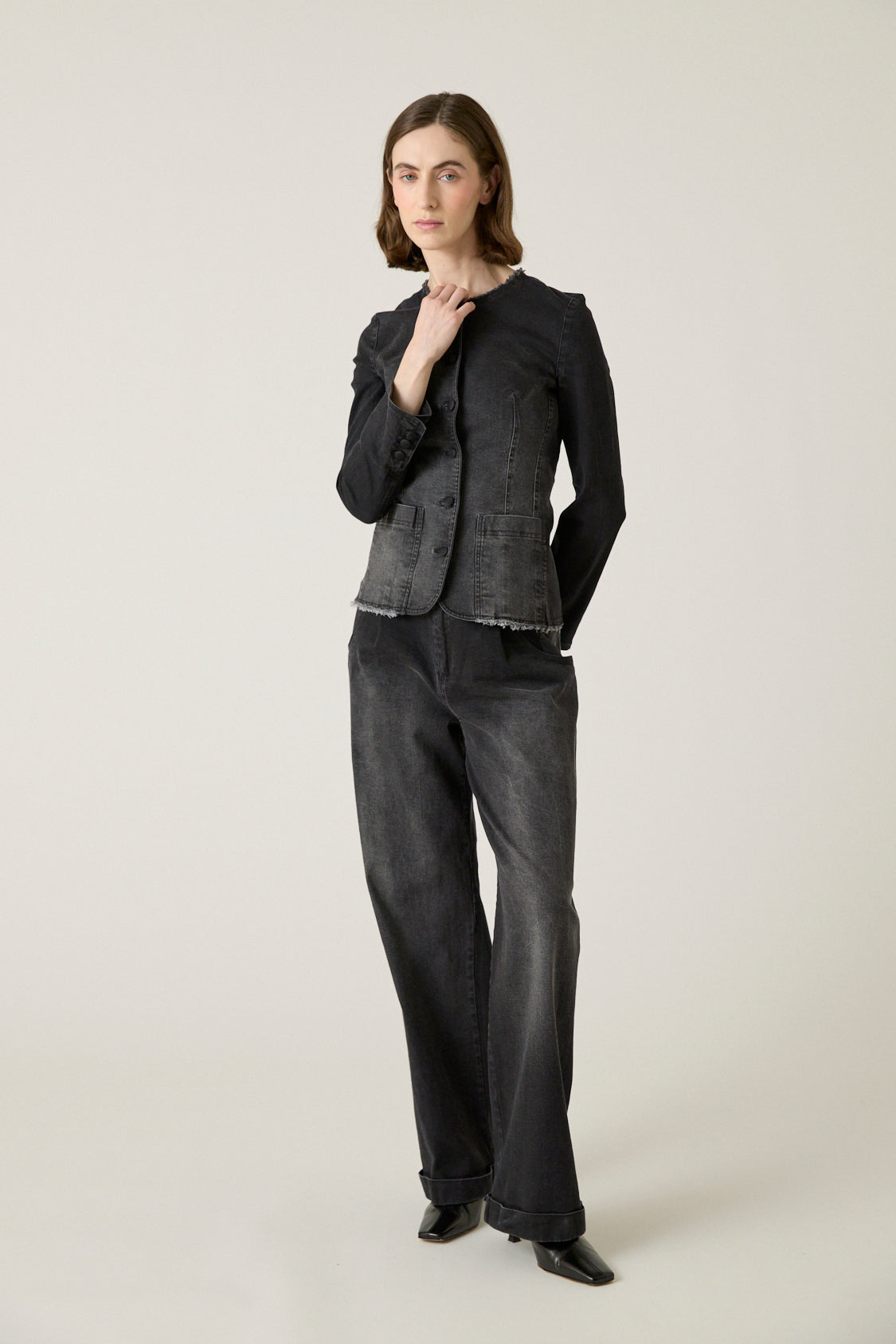 Straight-leg denim trousers with a high waist and cuffed hem. Button and zip closure.