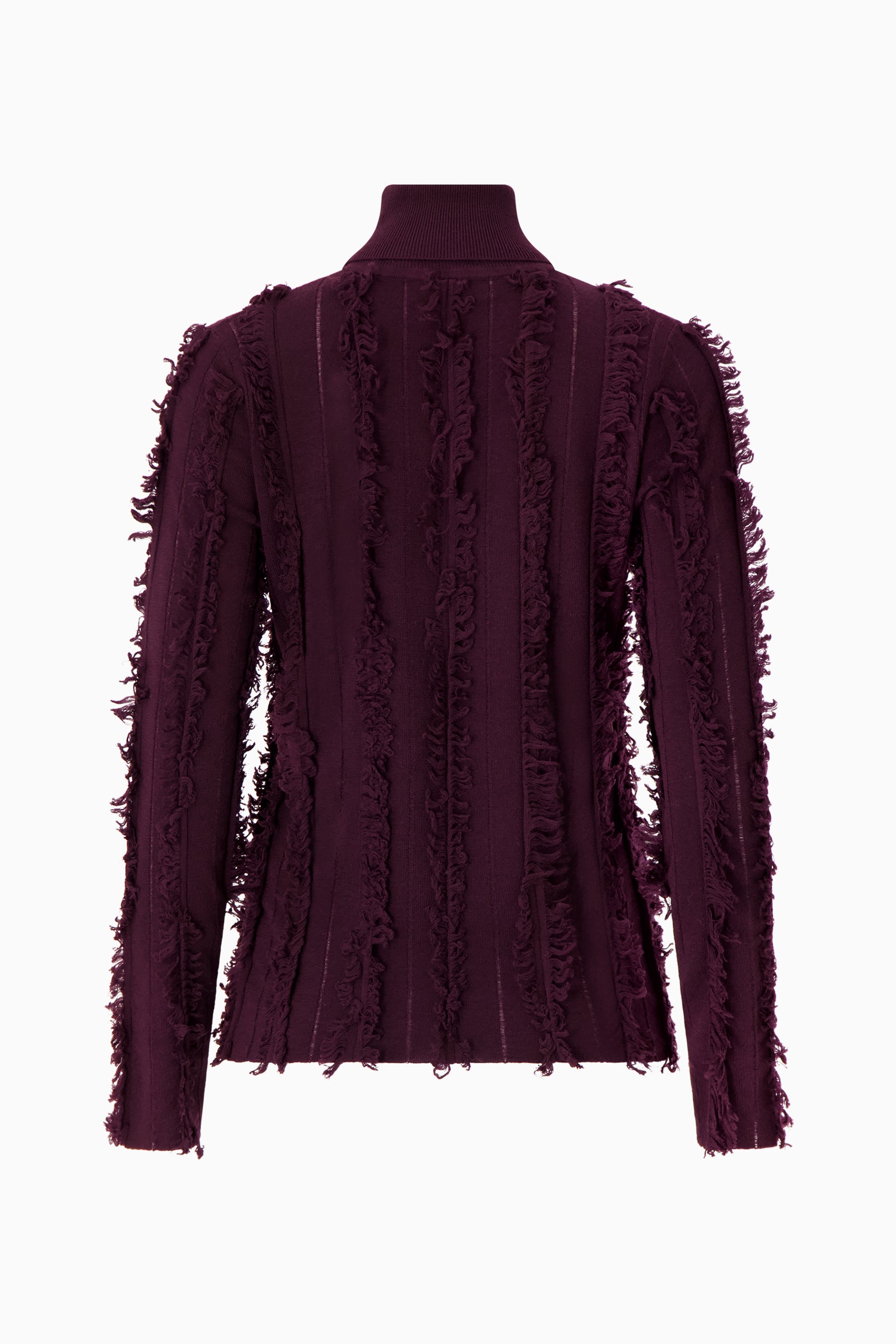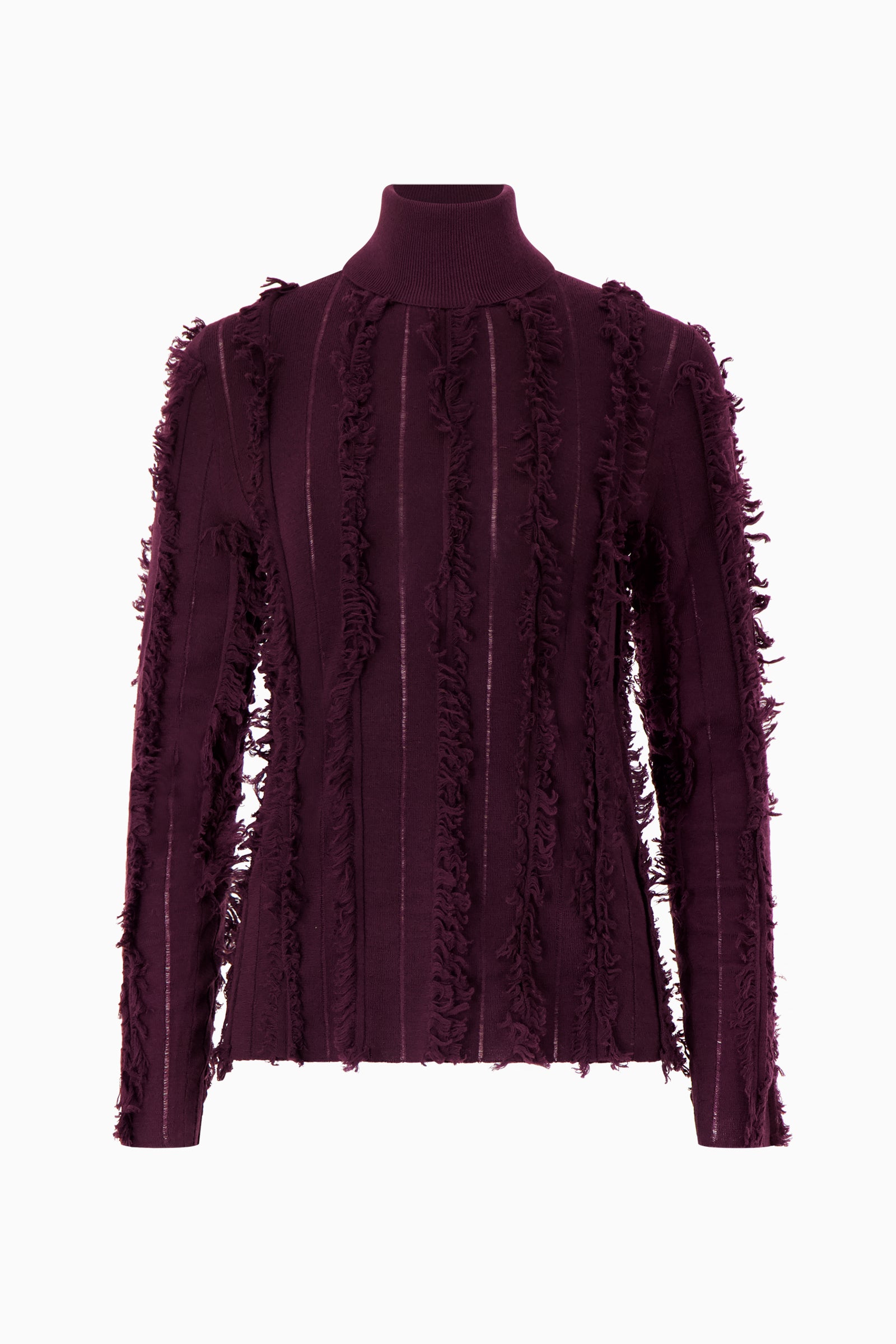 Turtleneck sweater featuring fringed intarsia and lattice stripes. Fitted. Ribbed cuffs and hem.