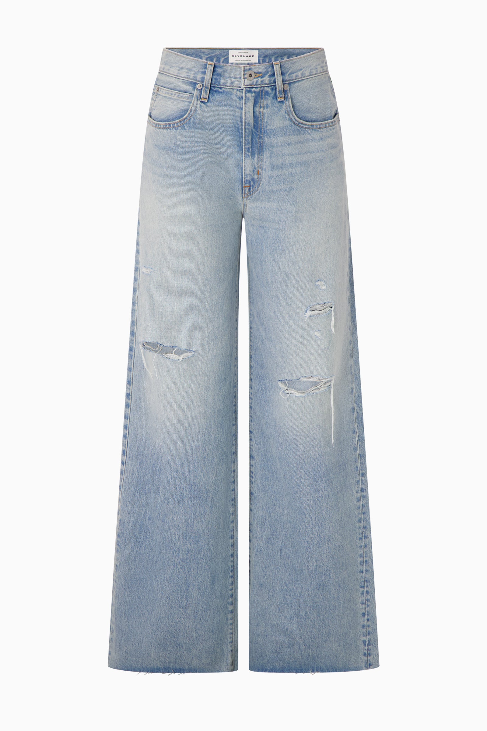 Jean with relaxed fit, mid-rise waist, wide-leg silhouette, and raw hem.