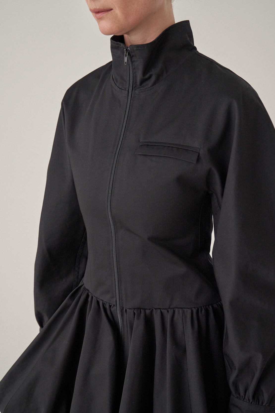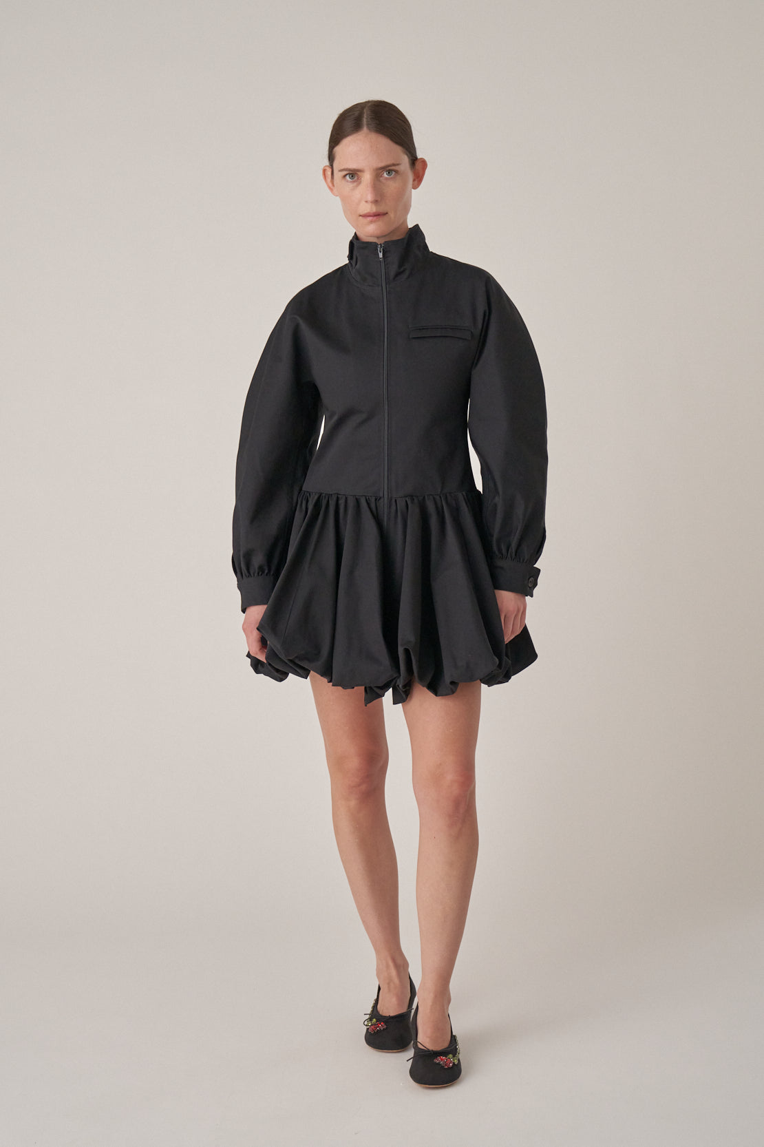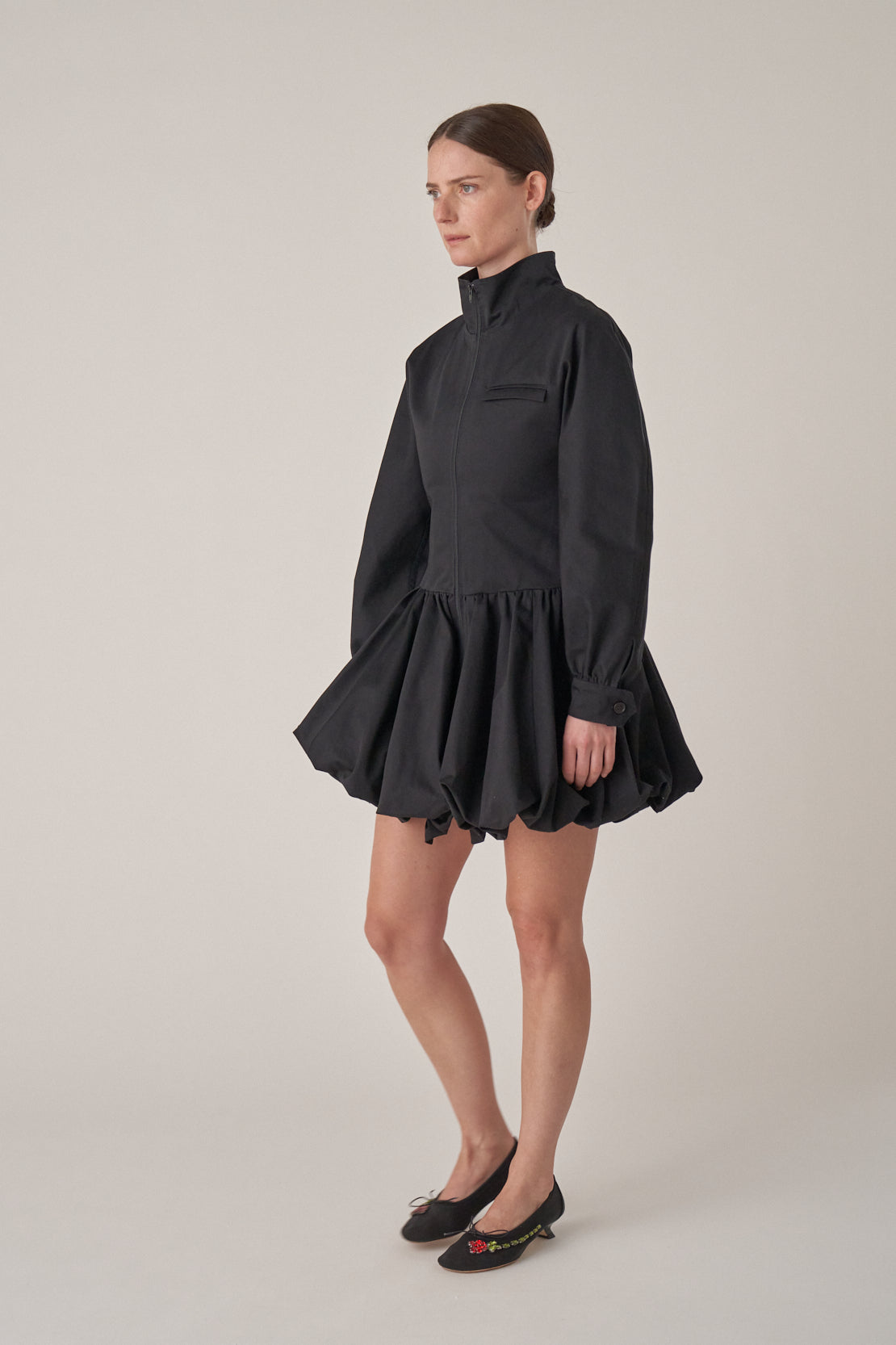 Hand-dyed cotton gabardine minidress. Button tab at stand collar. Zip closure. Flap pocket at chest. Gathering at dropped waist. Elasticized bubble hem. Seam pockets at waist. Single-button barrel cuffs. Full plain-woven lining.