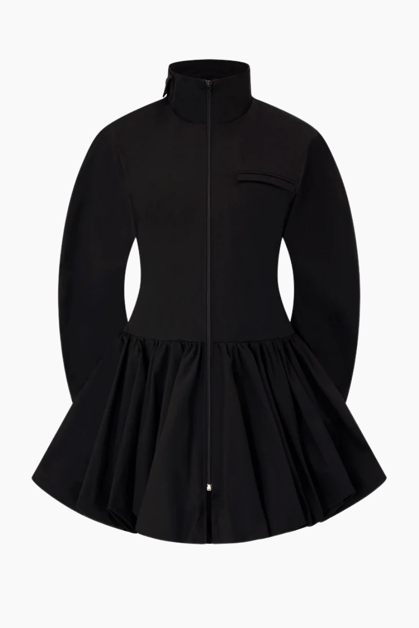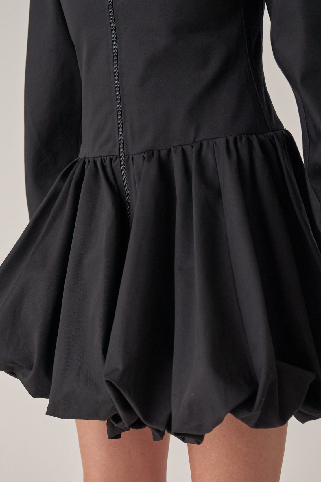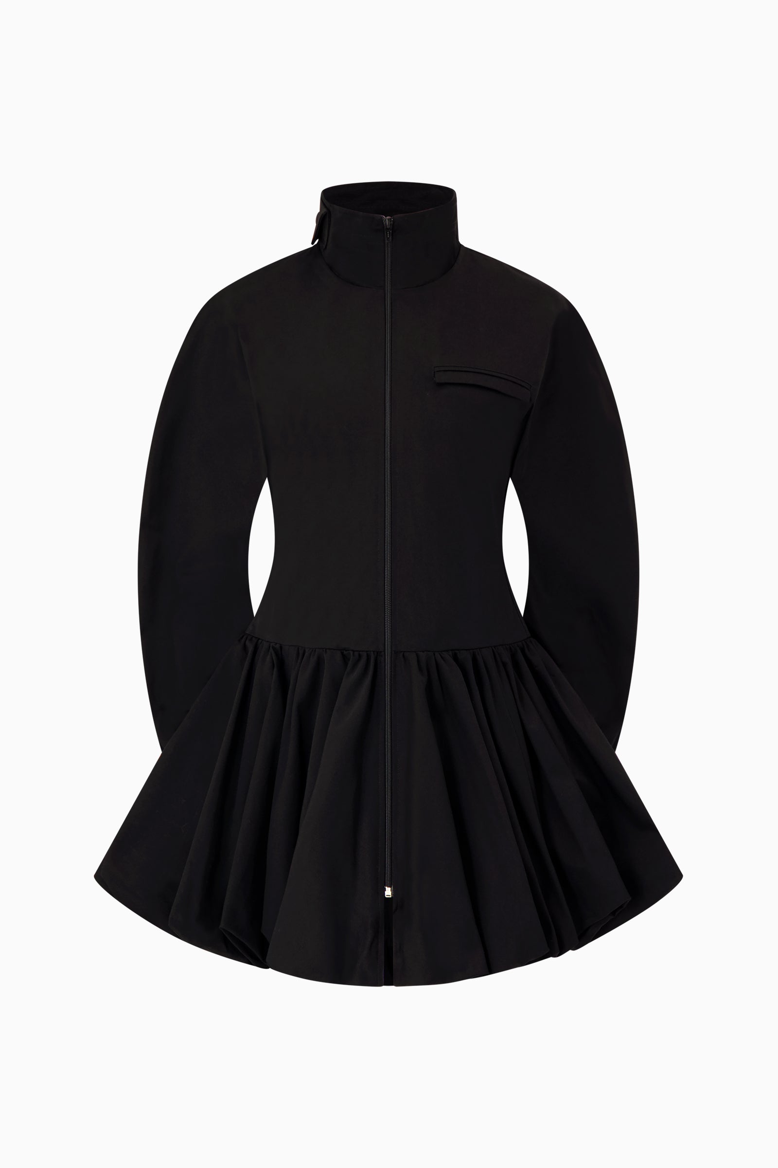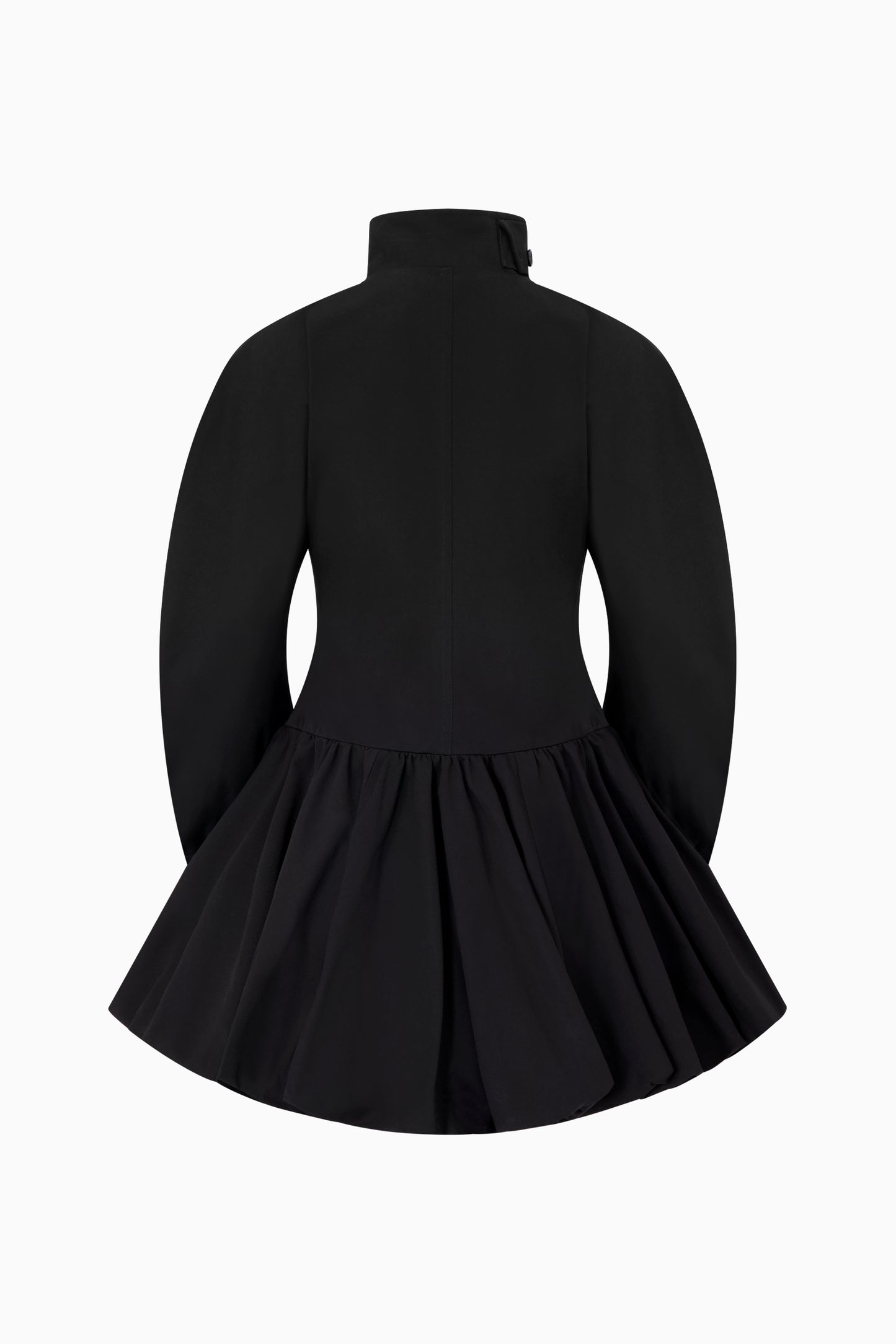 Hand-dyed cotton gabardine minidress. Button tab at stand collar. Zip closure. Flap pocket at chest. Gathering at dropped waist. Elasticized bubble hem. Seam pockets at waist. Single-button barrel cuffs. Full plain-woven lining.
