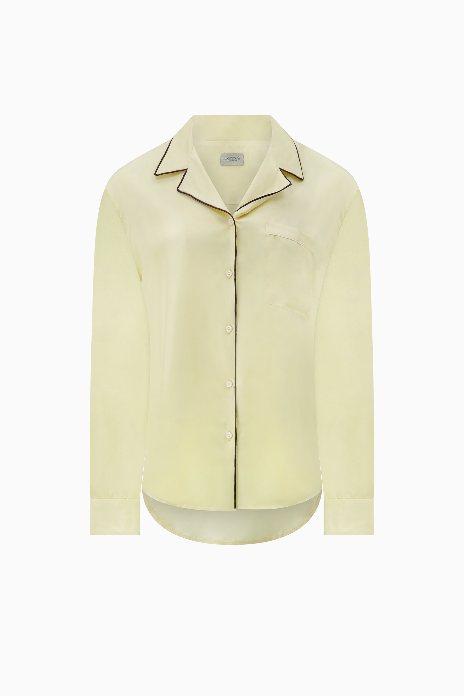 Notched collar silk shirt with A-line profile, relaxed fit, and a high-low hemline. Finished by hand with mother-of-pearl buttons.