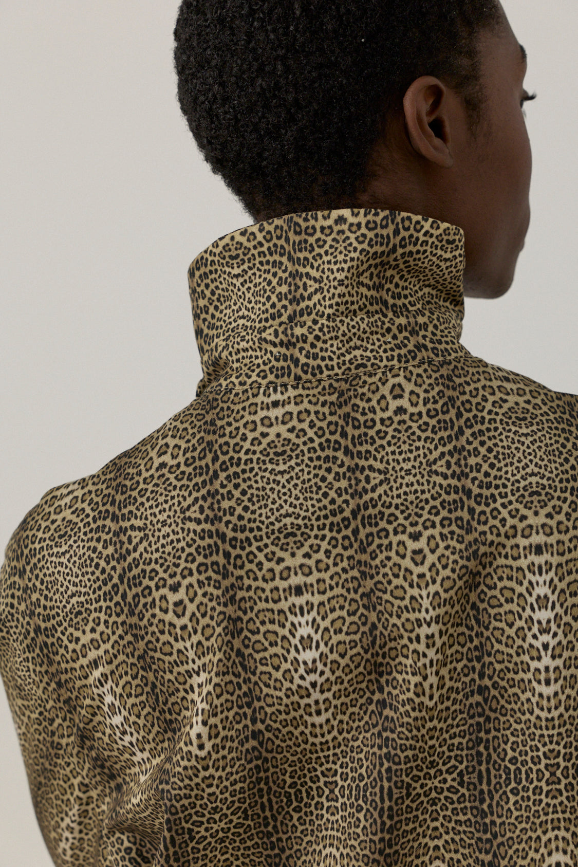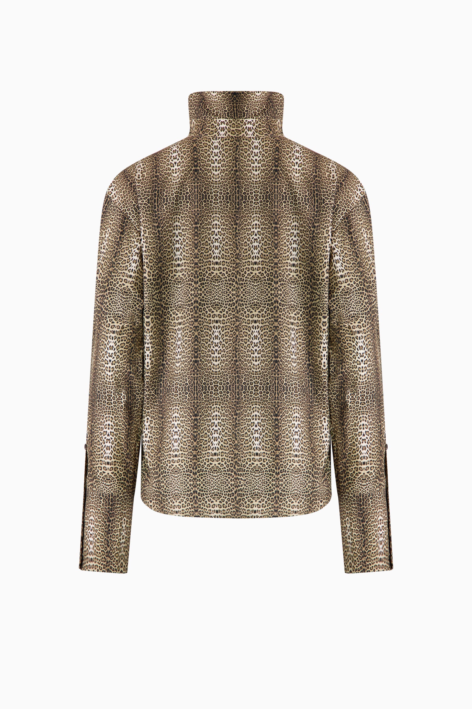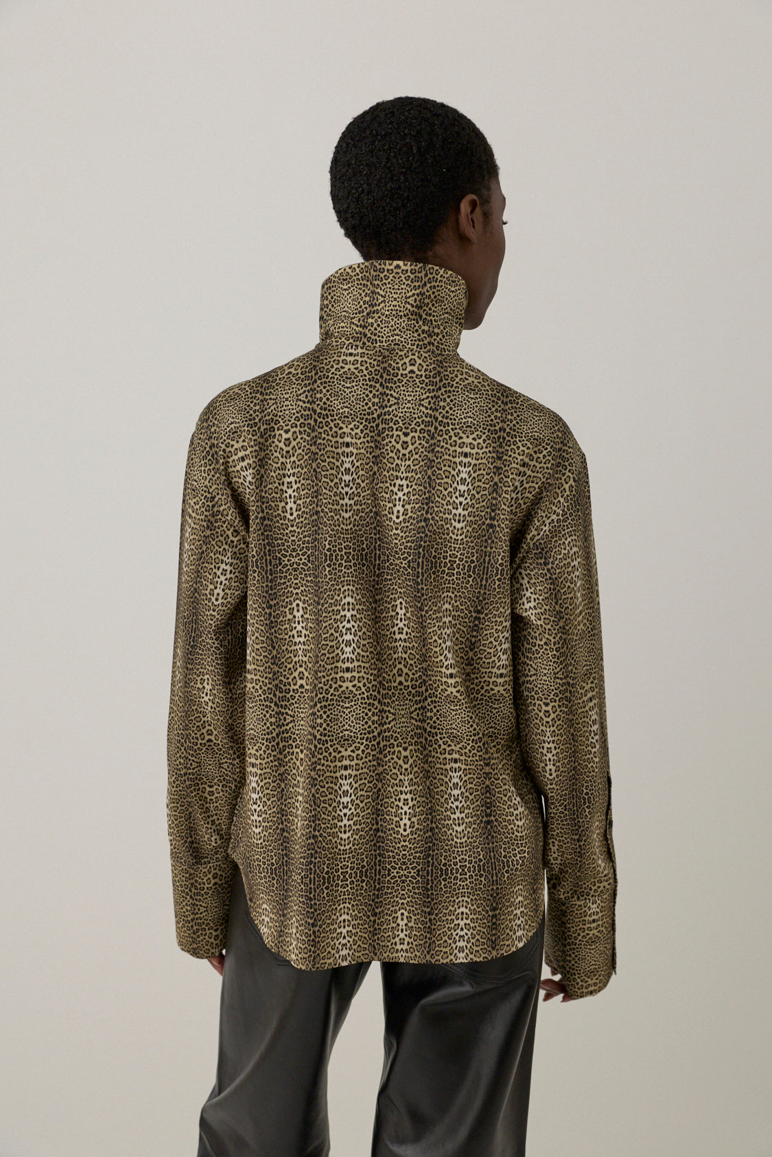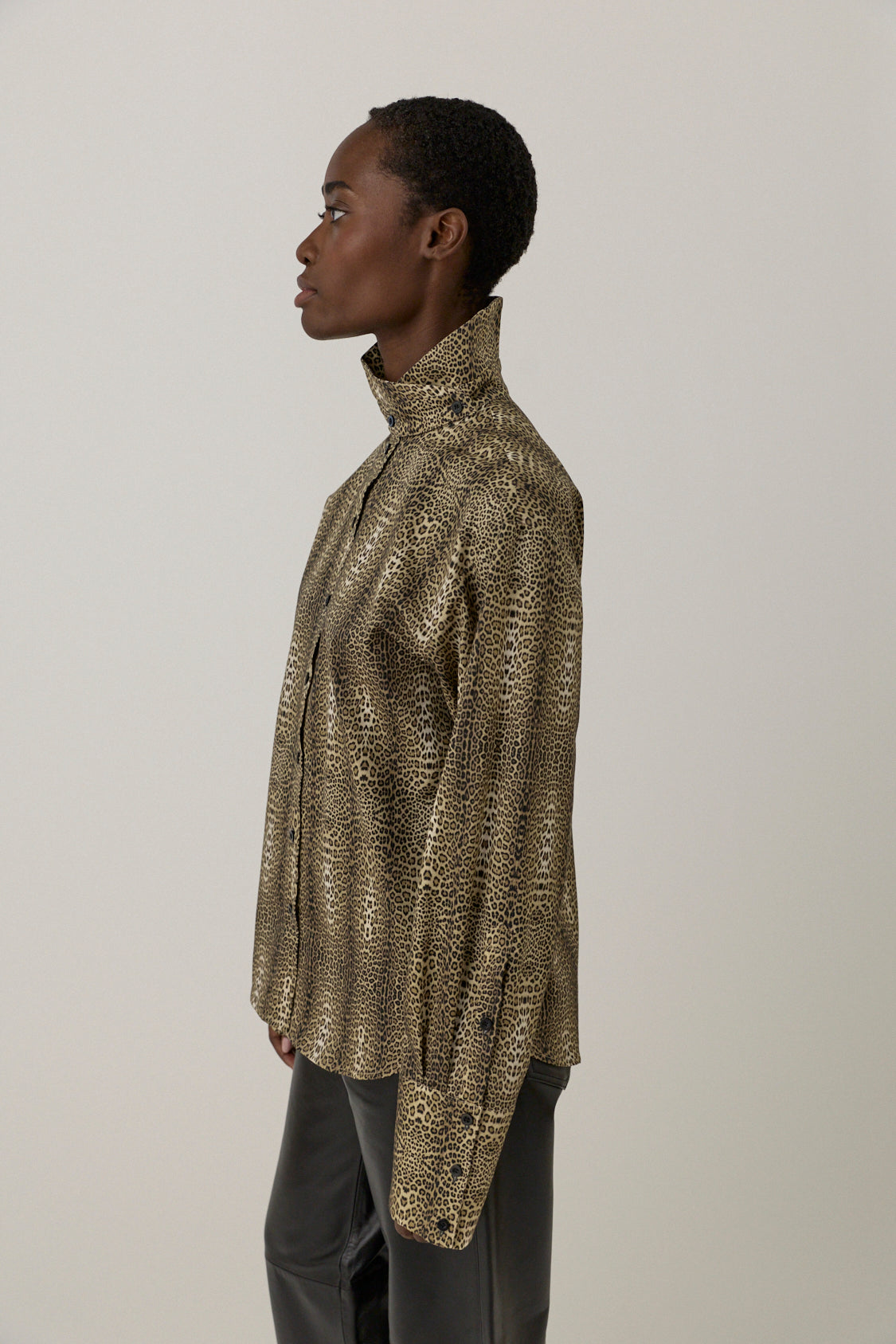 Leopard print shirt with a stand collar and button front. Long sleeves with cuff detail.