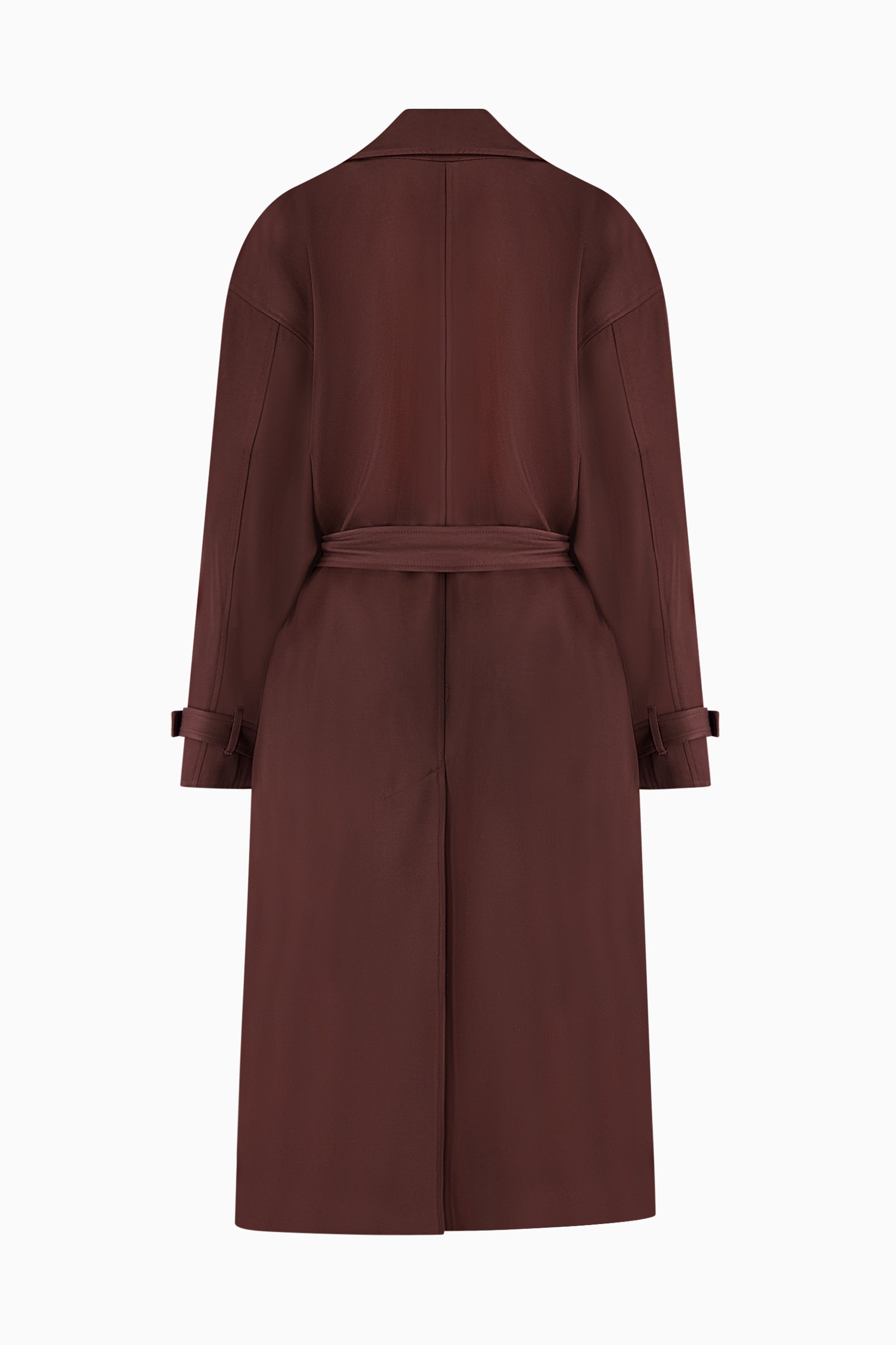 Oversized trench coat with wide lapels, belted waist, and silver-tone hardware. Finished with adjustable cuff straps.