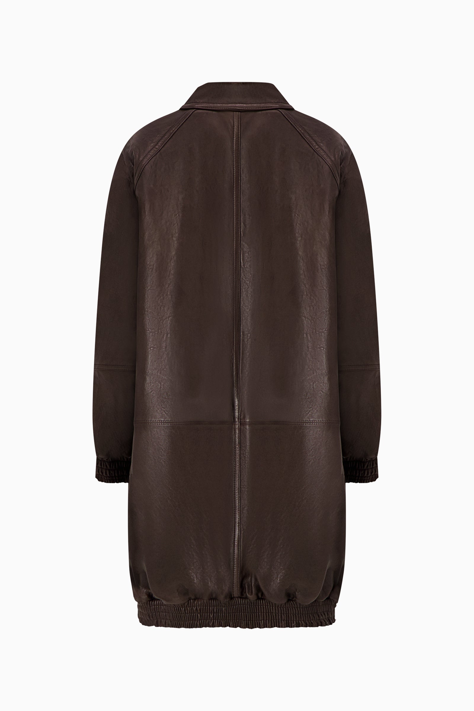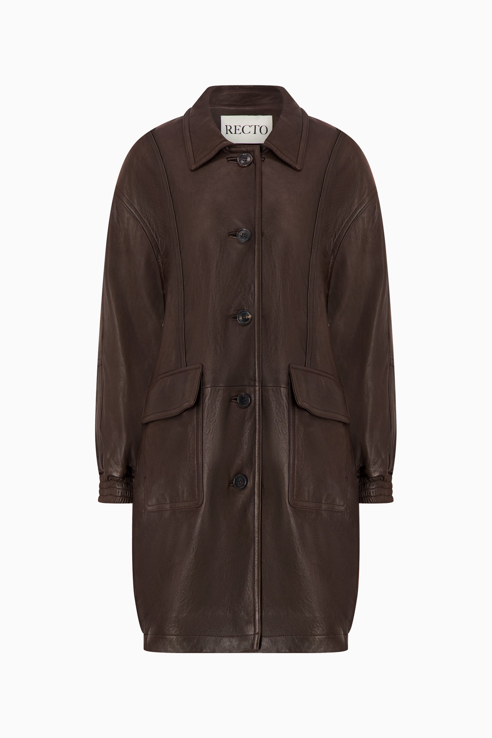 Dark brown oversized leather coat with point collar, button front, and flap pockets. Designed with elasticated cuffs and hem for a relaxed silhouette.