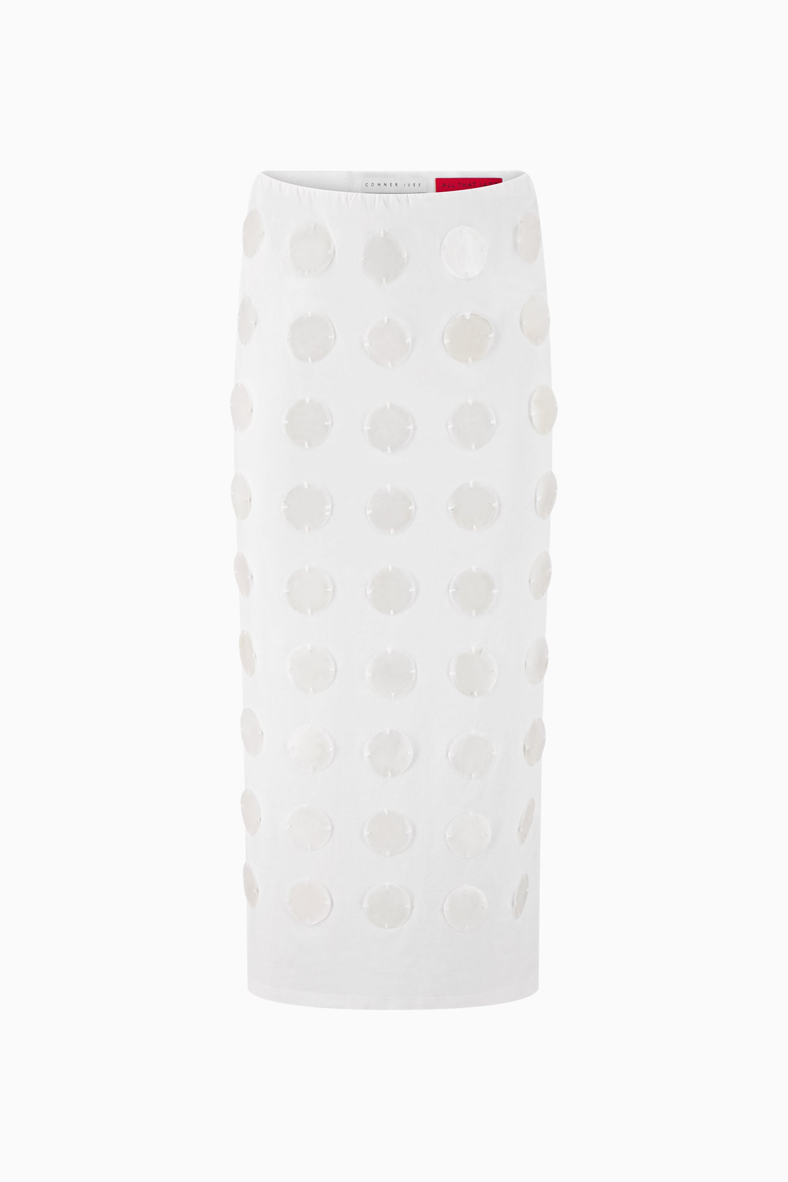 Straight-cut maxi skirt embellished with oversized mother-of-pearl paillettes. Designed with clean waistband and pull-on style.
