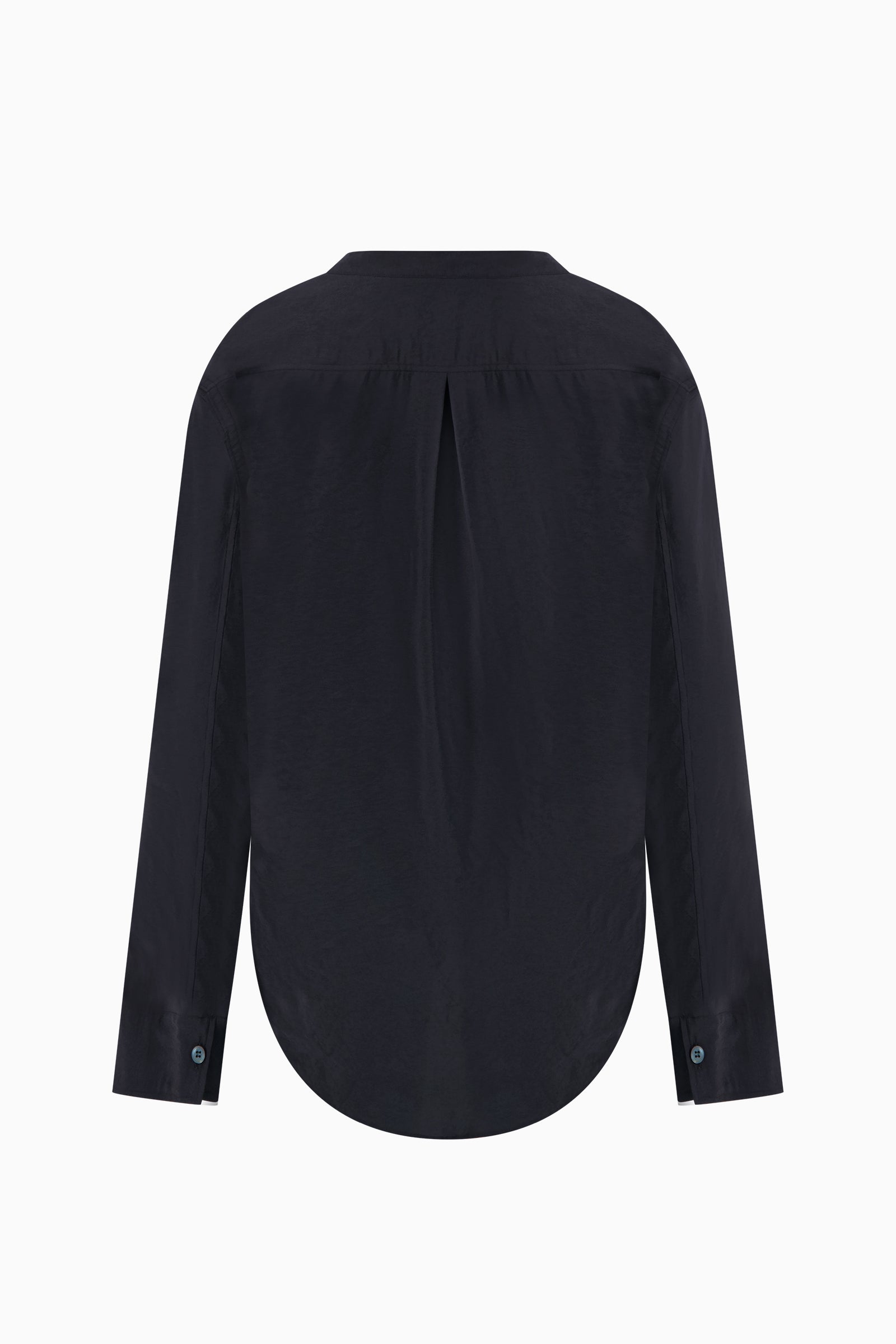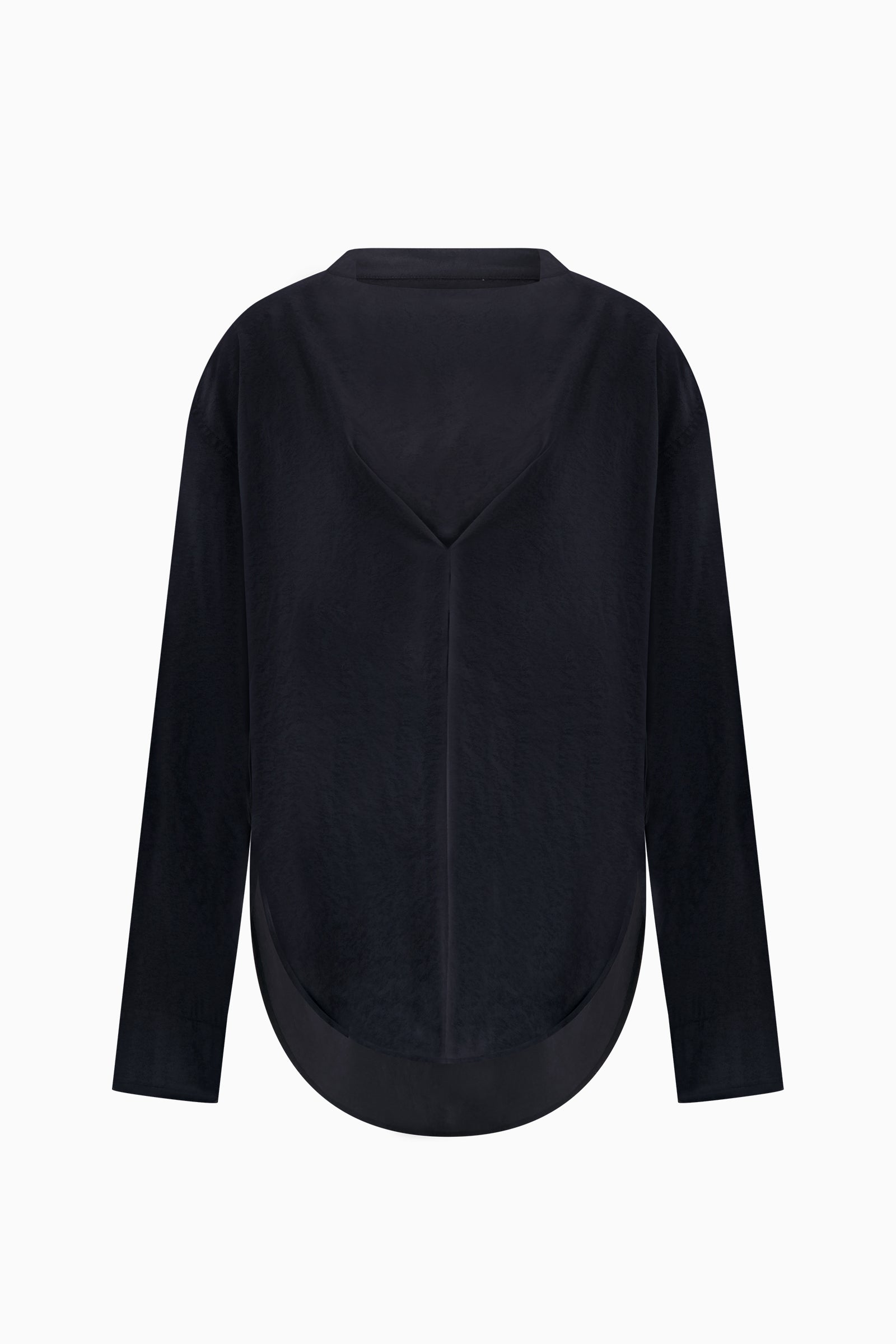 Long-sleeve top in a lightweight woven fabric. Clean neckline with subtle seam detailing through the front. Relaxed silhouette with curved hem and soft drape.