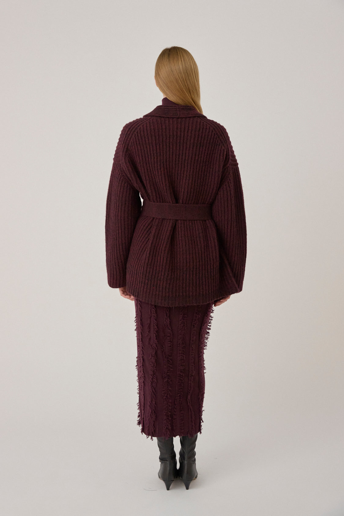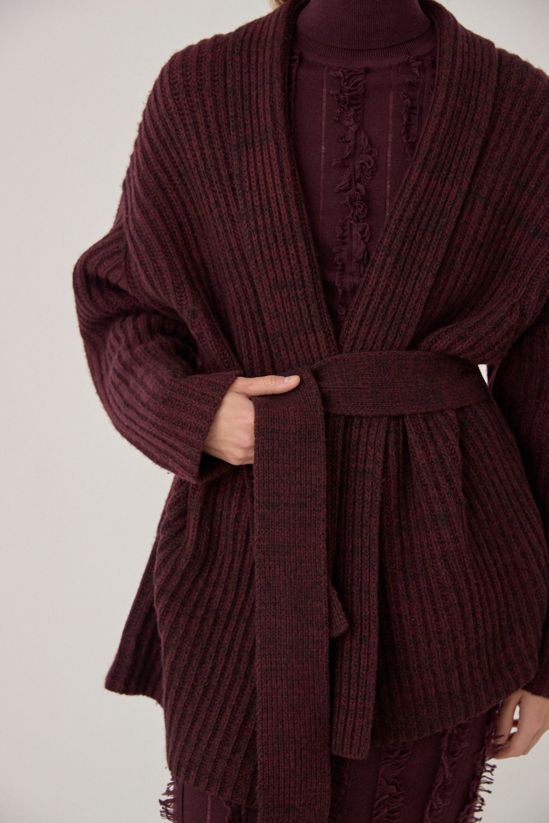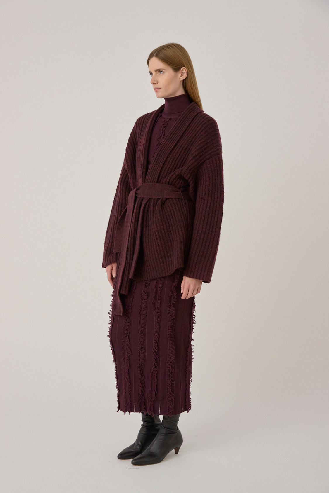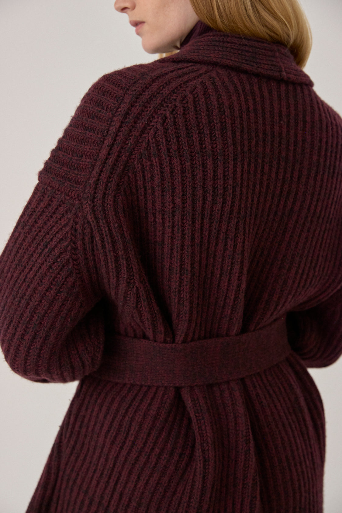 Ribbed wrap cardigan in soft merino wool. Shawl collar. Long sleeves. Dropped shoulders. Removable waist tie.