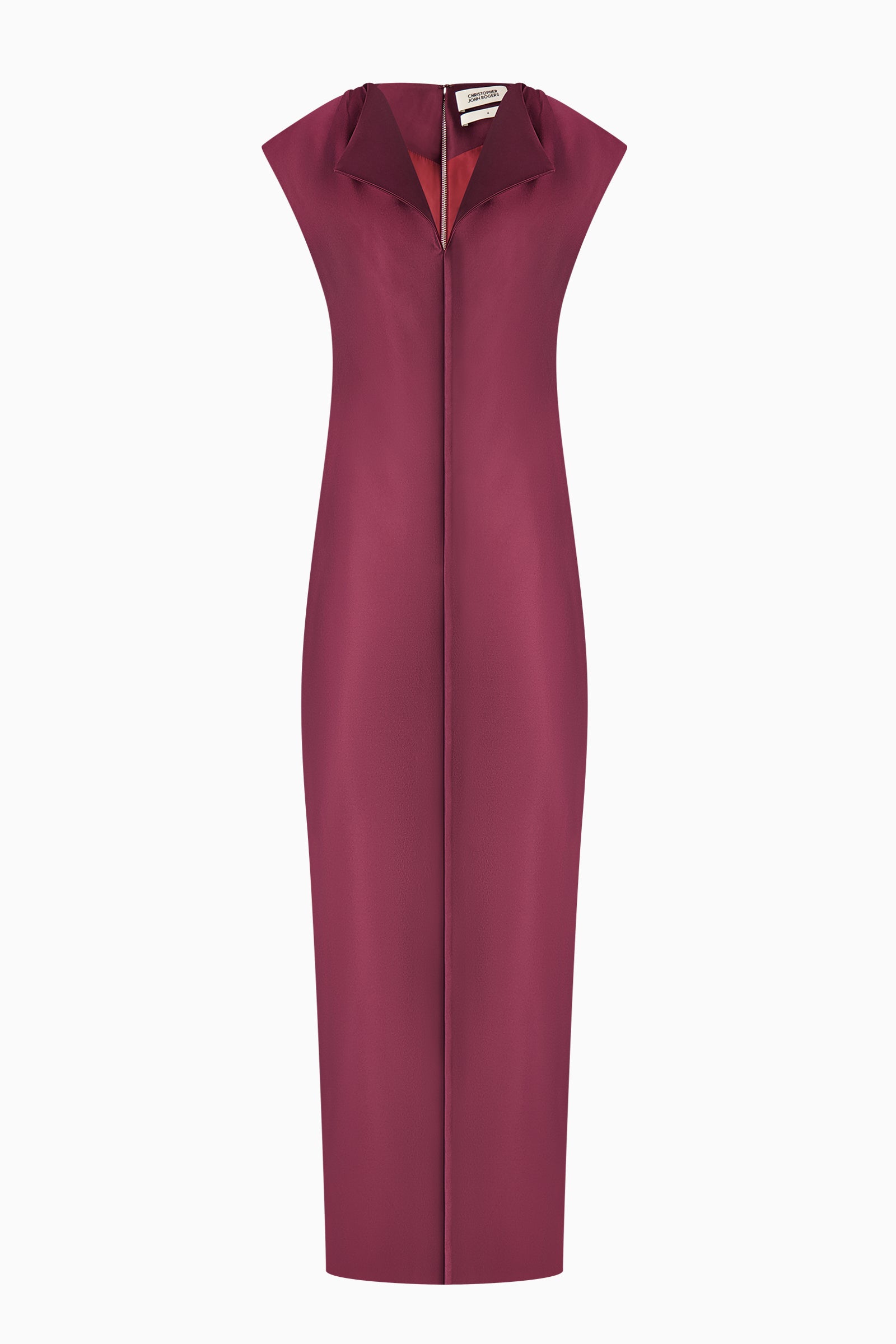Sleeveless midi sheath dress with pointed collar, exposed back zip, and rear slit