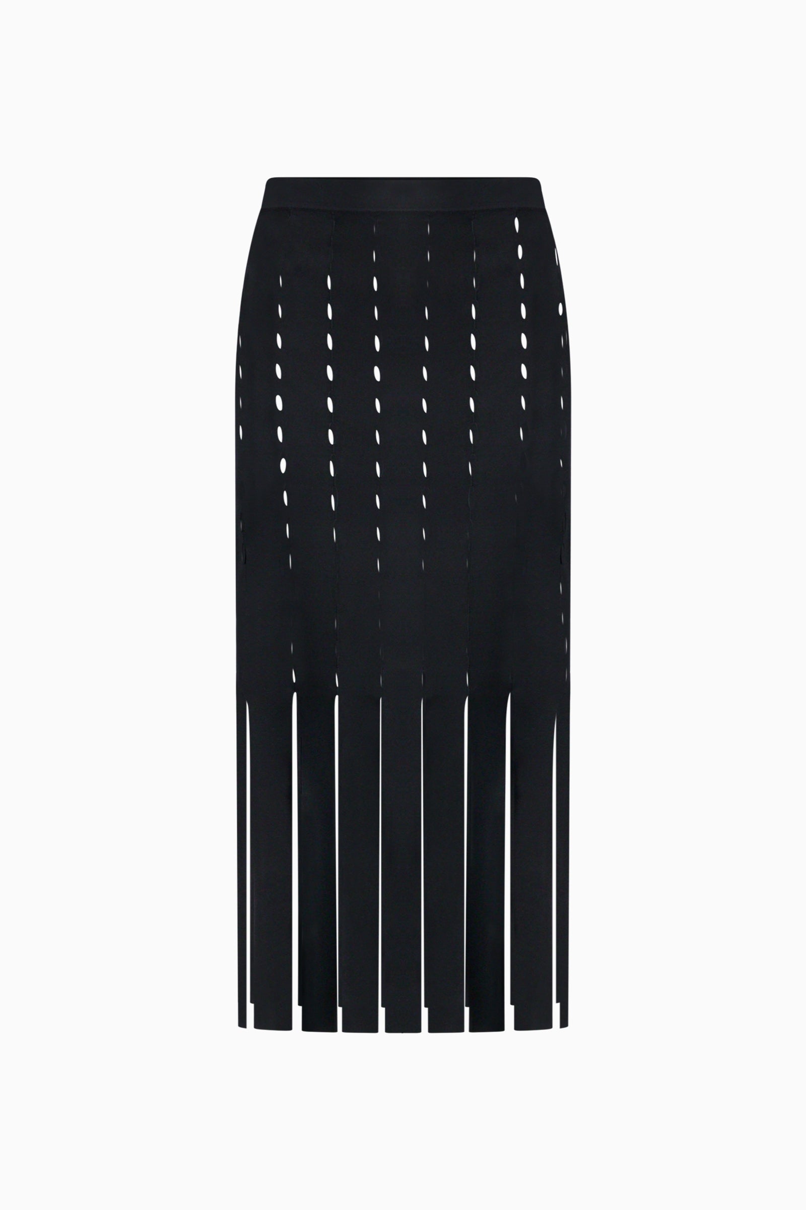 Knit midi skirt with subtle openwork stripes and fluid fringe hem. Elastic waist for pull-on fit.