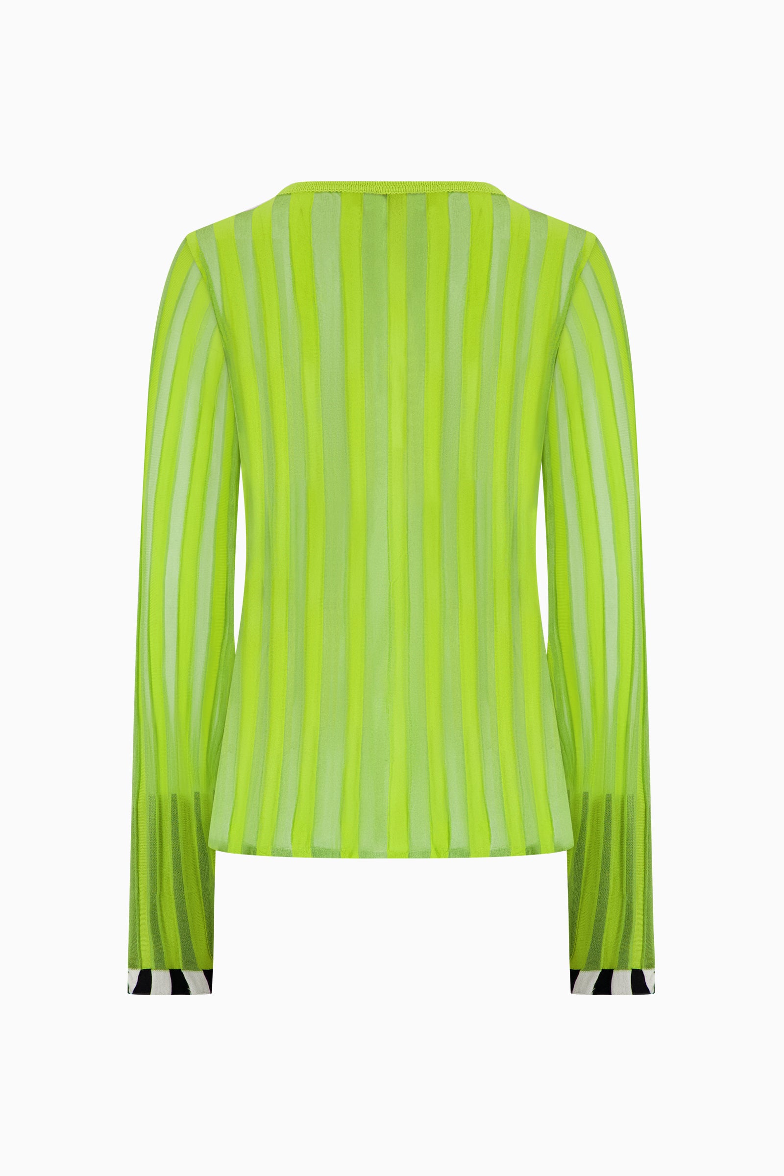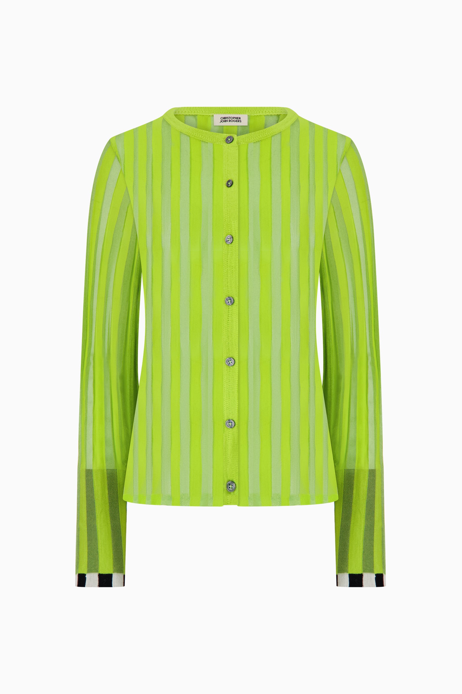 Sheer striped cardigan with round neckline, button closure, and long sleeves finished with contrast cuffs.