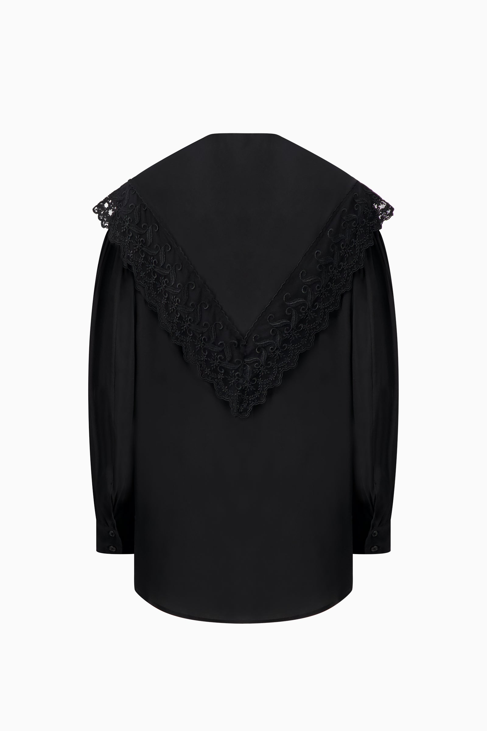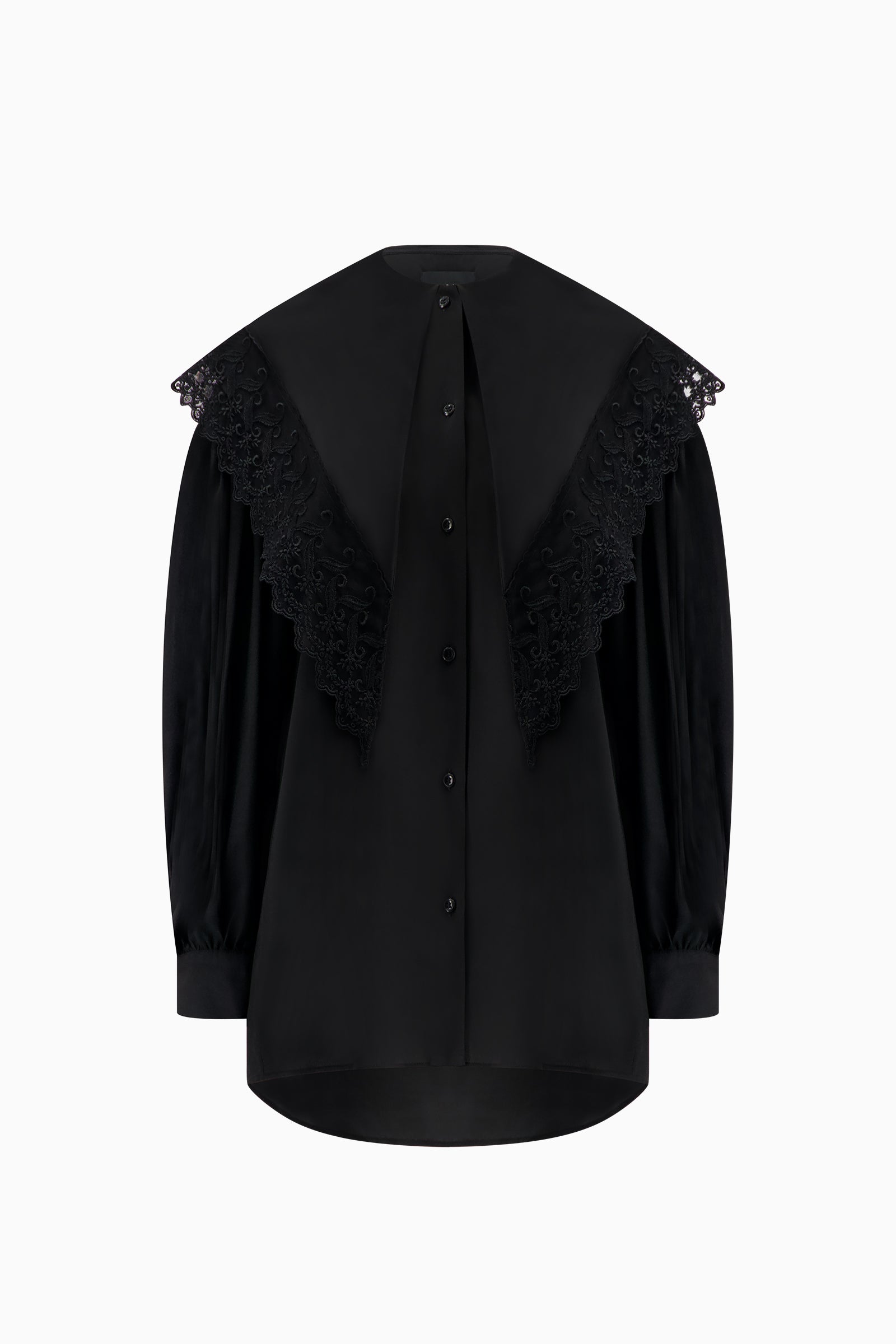 Long-sleeve button-down shirt with oversized pointed collar. Finished with intricate lace trim extending in a V-shape across the front and back. Gathered sleeves, button cuffs, and curved hem.