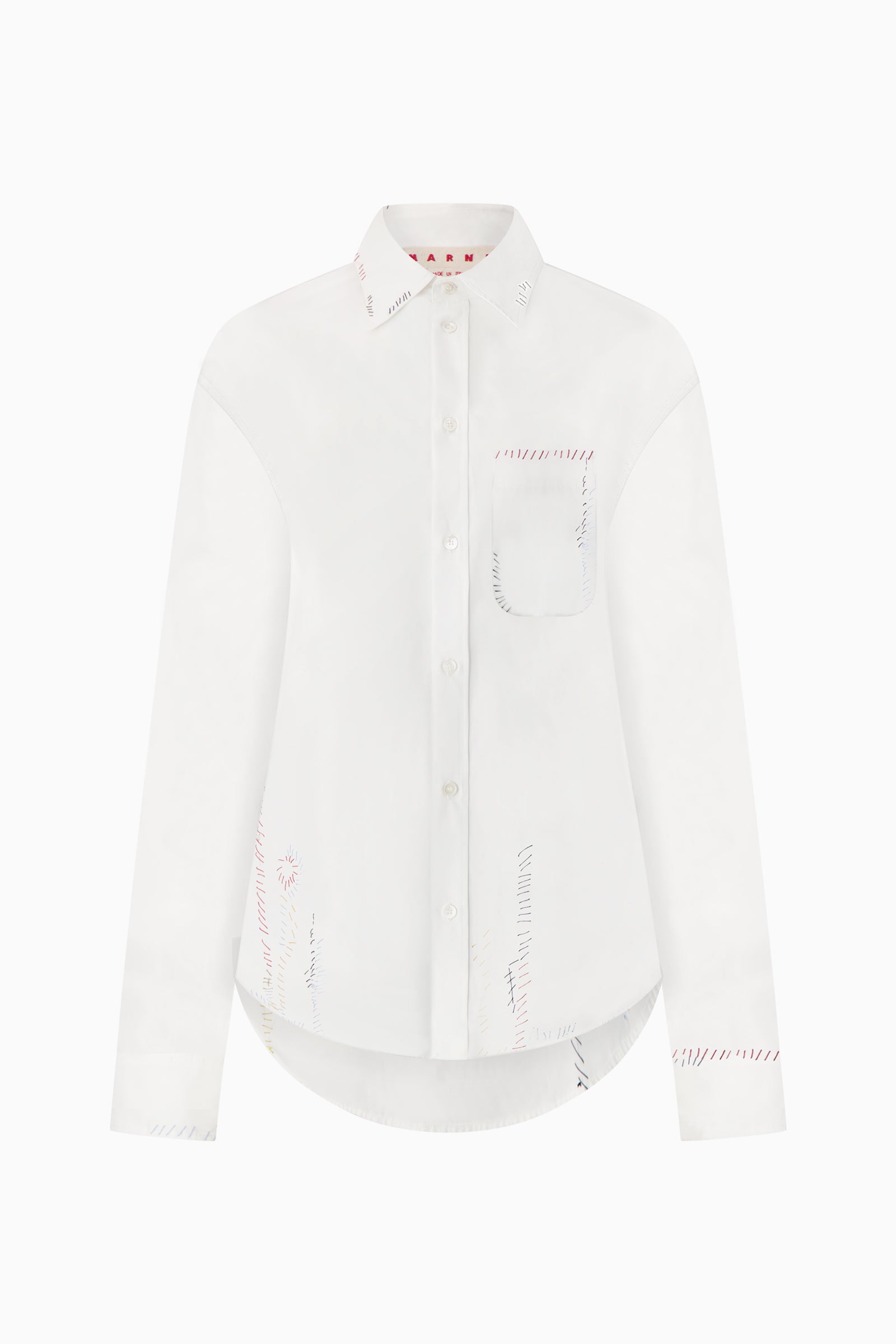Cotton poplin shirt with pointed collar, button front, and chest pocket. Detailed with multicolor contrast stitching throughout.