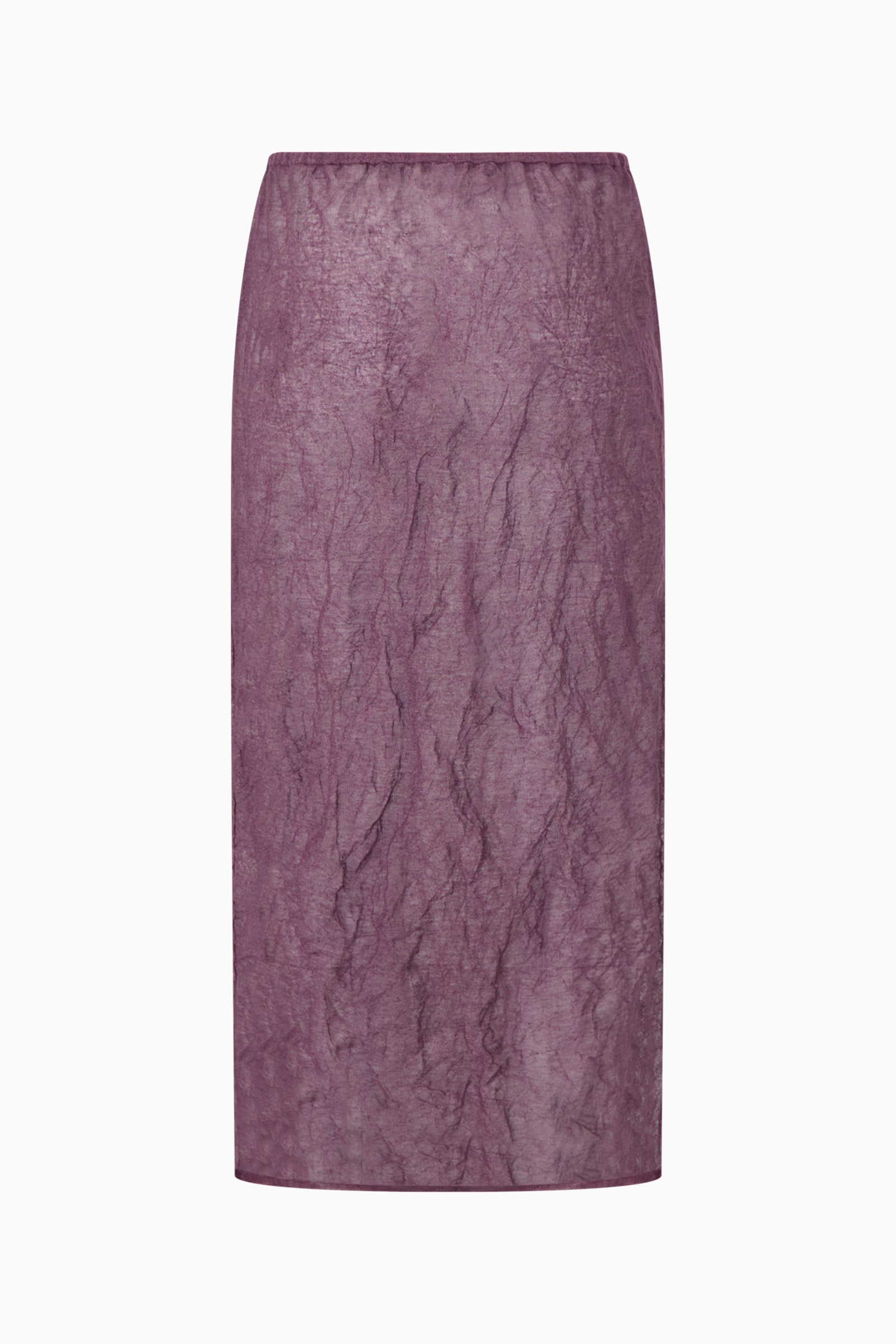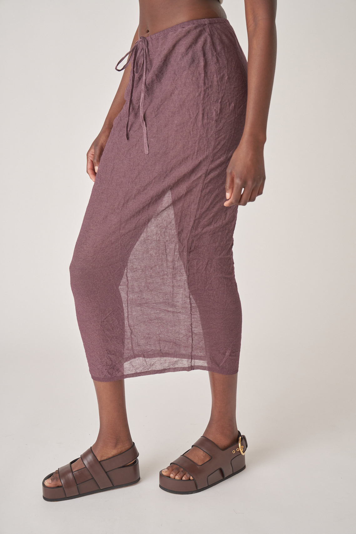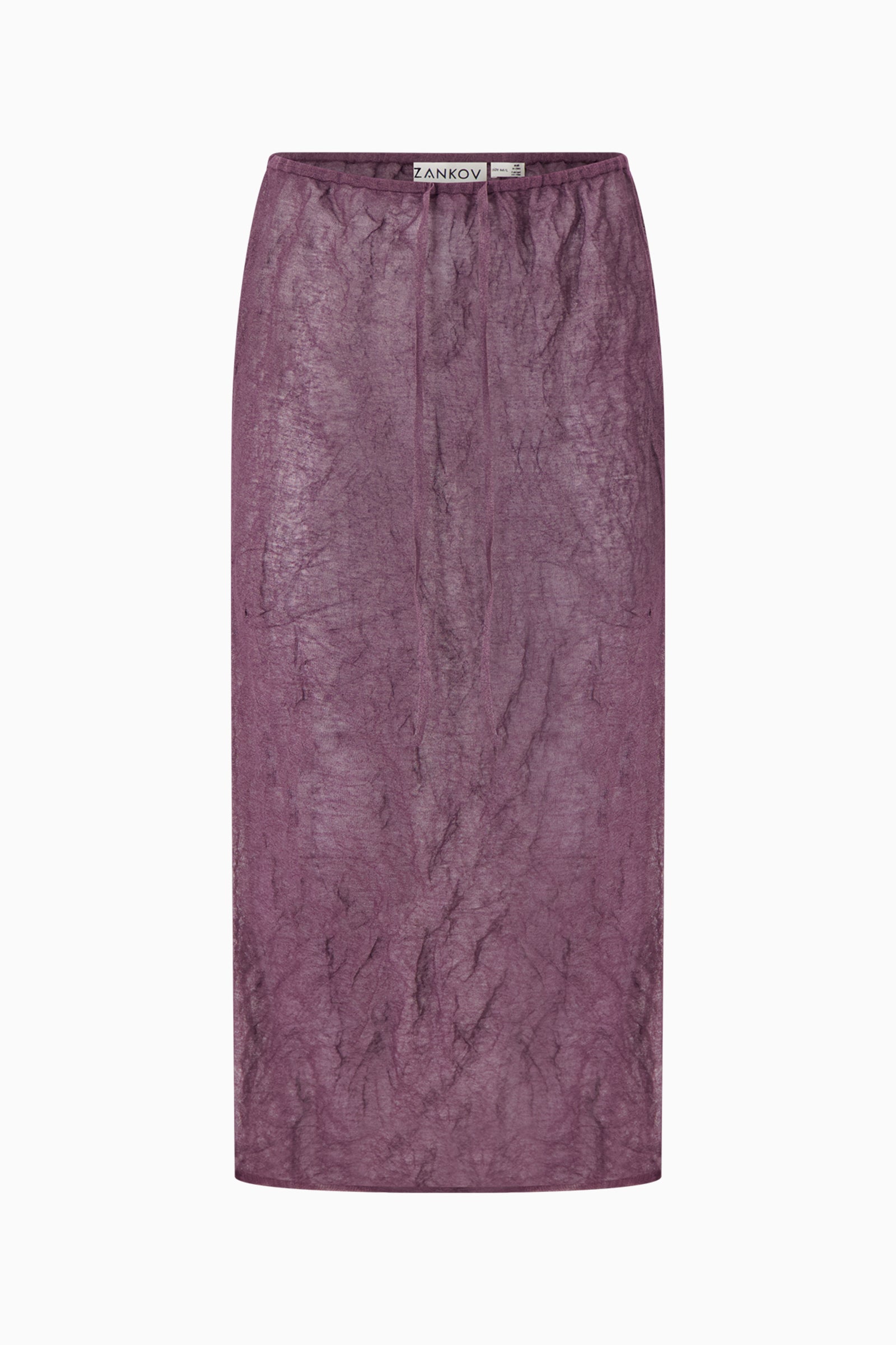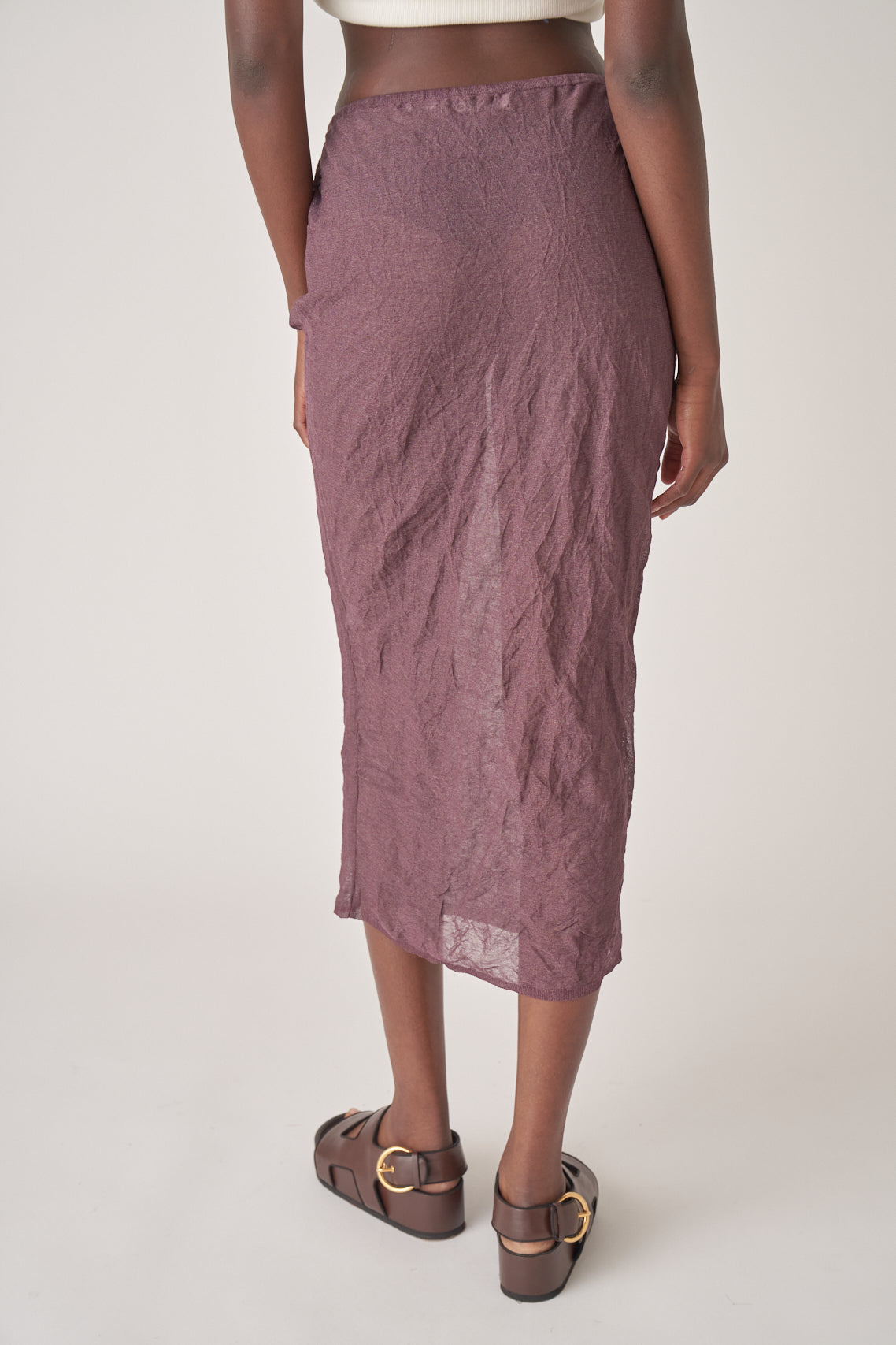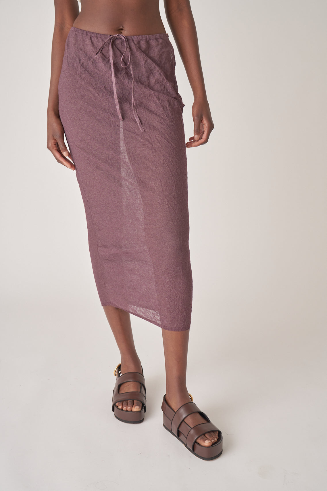 Semisheer metallic midi skirt with crinkled texture. Elastic/drawstring waist. Unlined.
