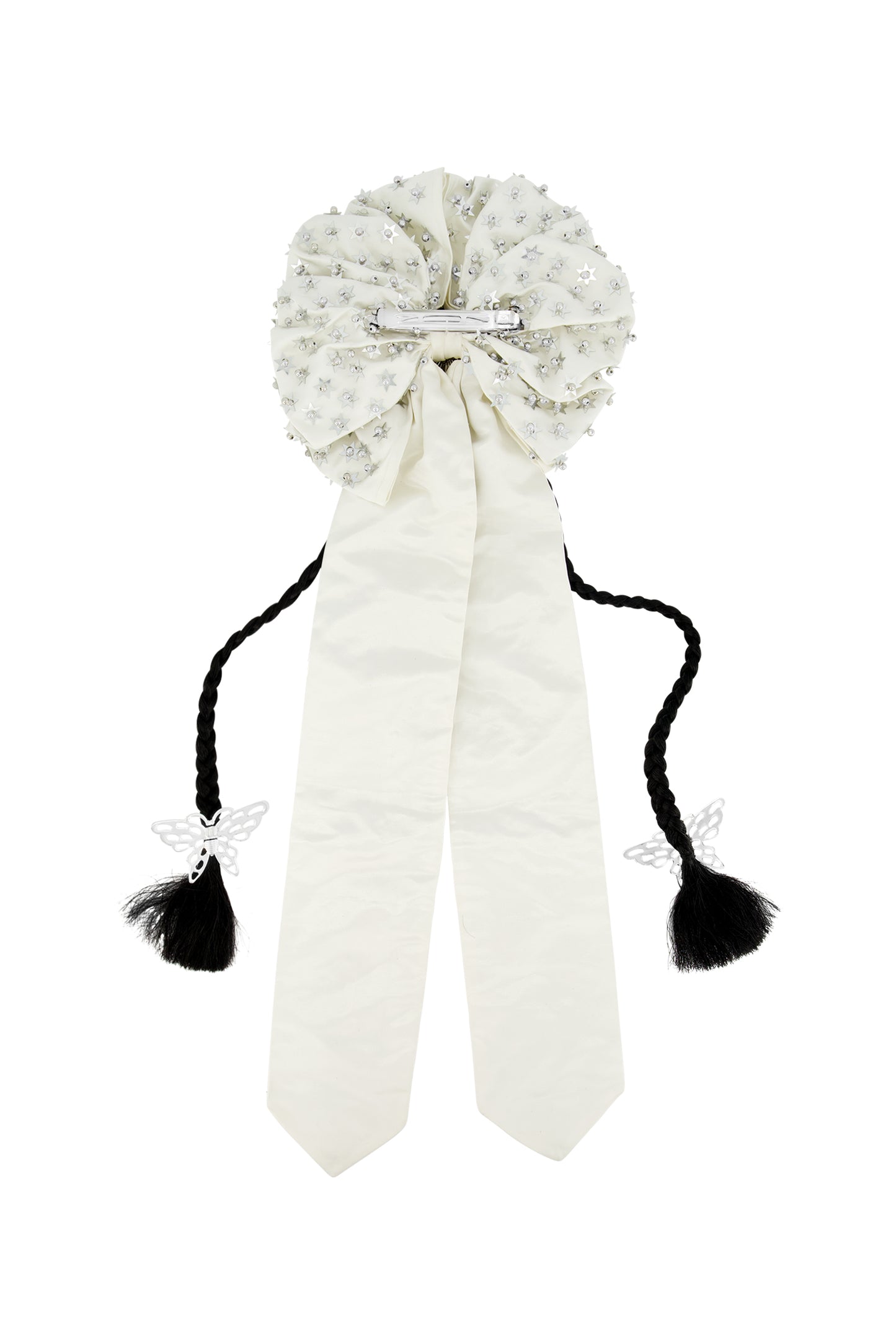 Rosette hair clip. Hand-beaded stars on white satin. Flower hardware. Black faux braids with butterflies. Barrette closure.