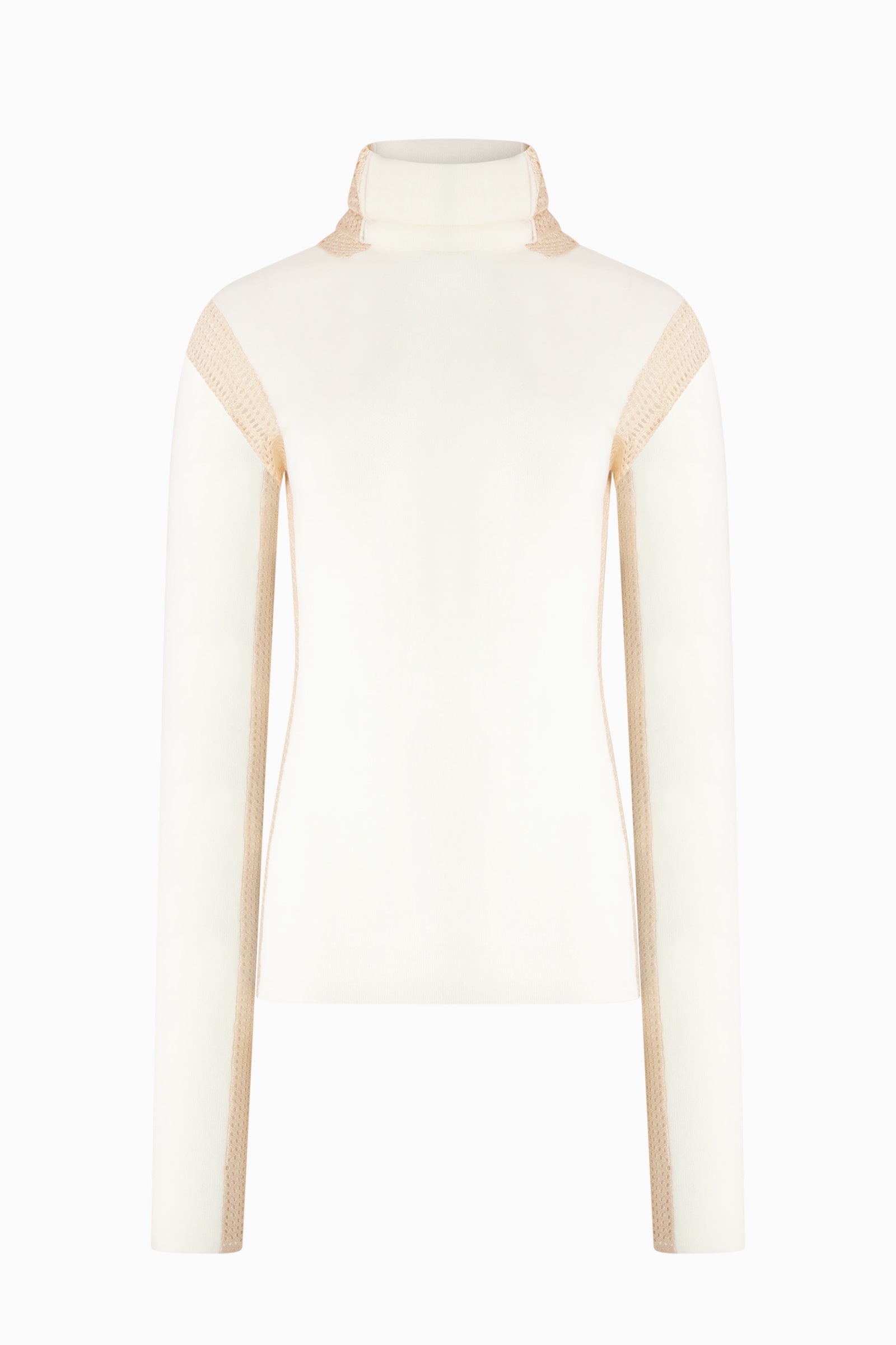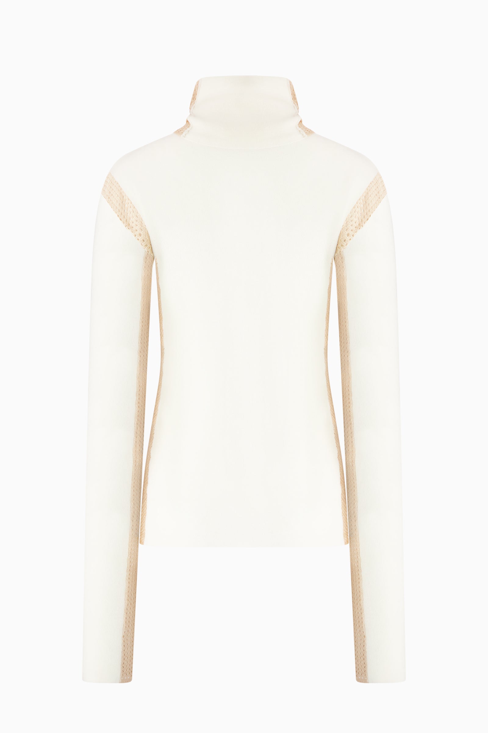 Merino wool turtleneck in ivory with mesh insets at shoulders and along sleeves. Slim fit with elongated lines.