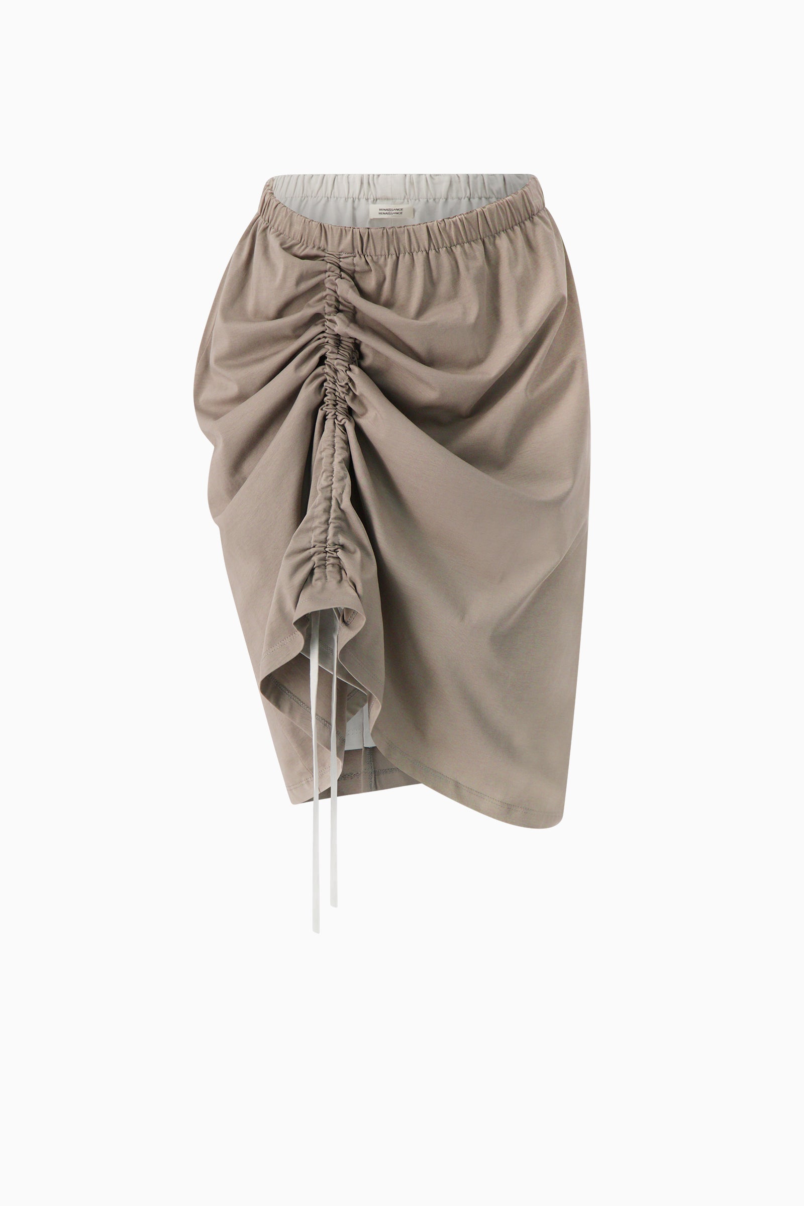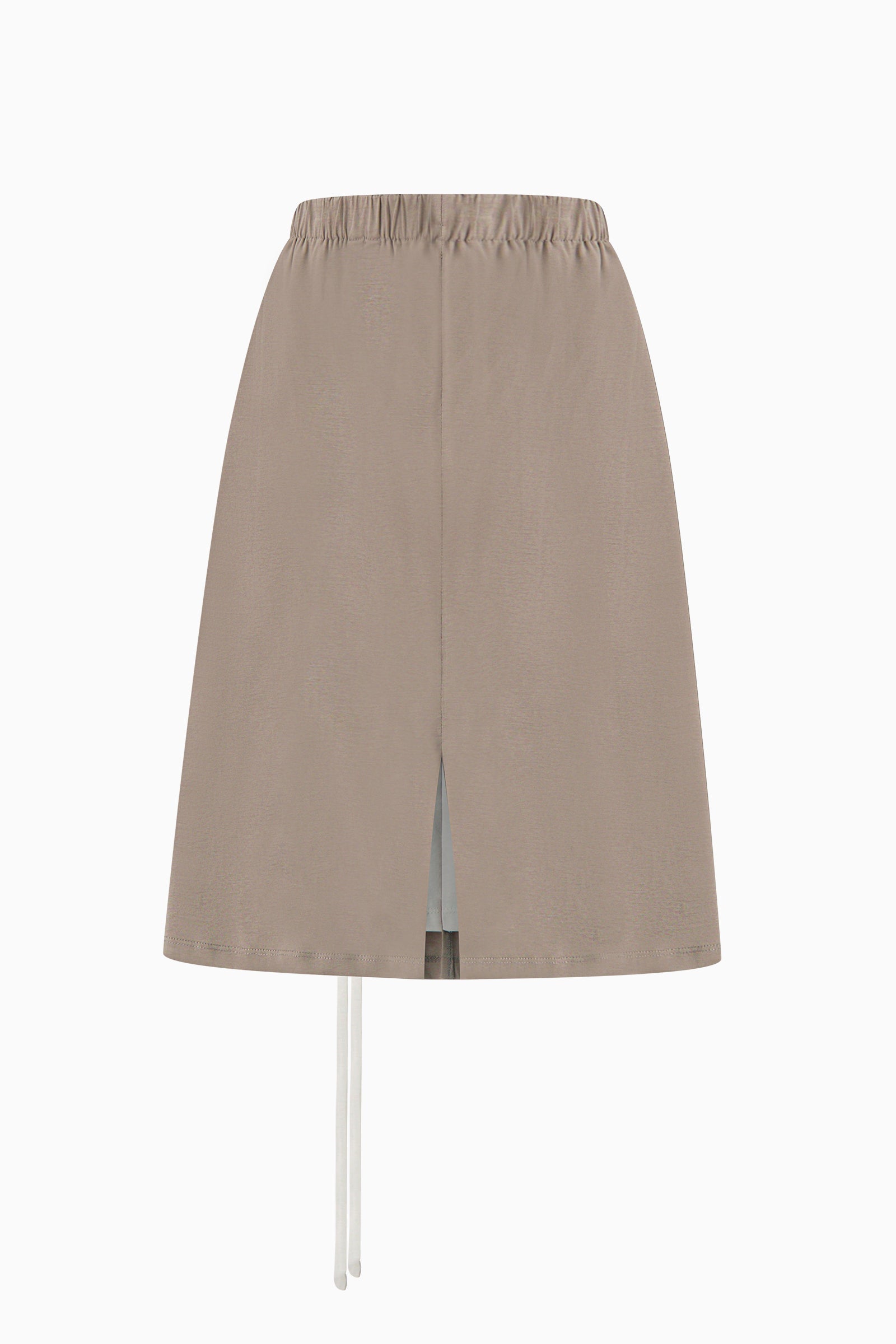 Knee-length skirt with an elasticated waistband. Finished with adjustable ruching at the front and a back slit for movement.