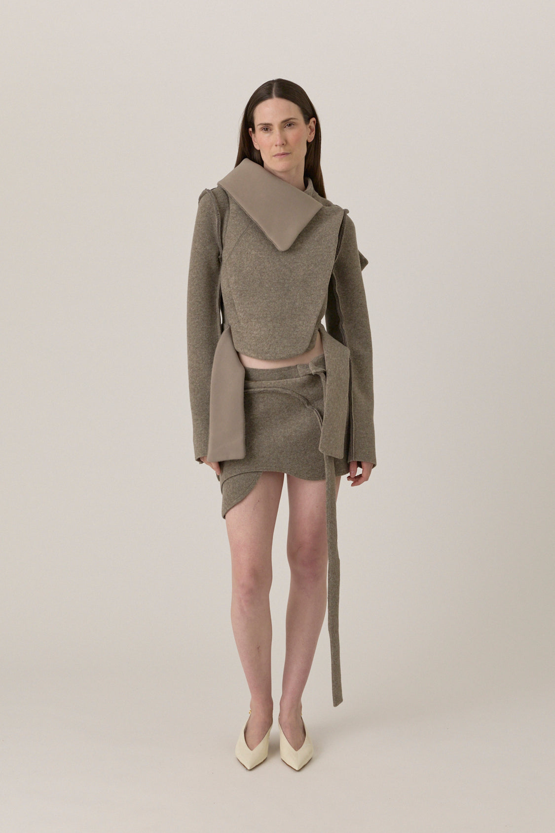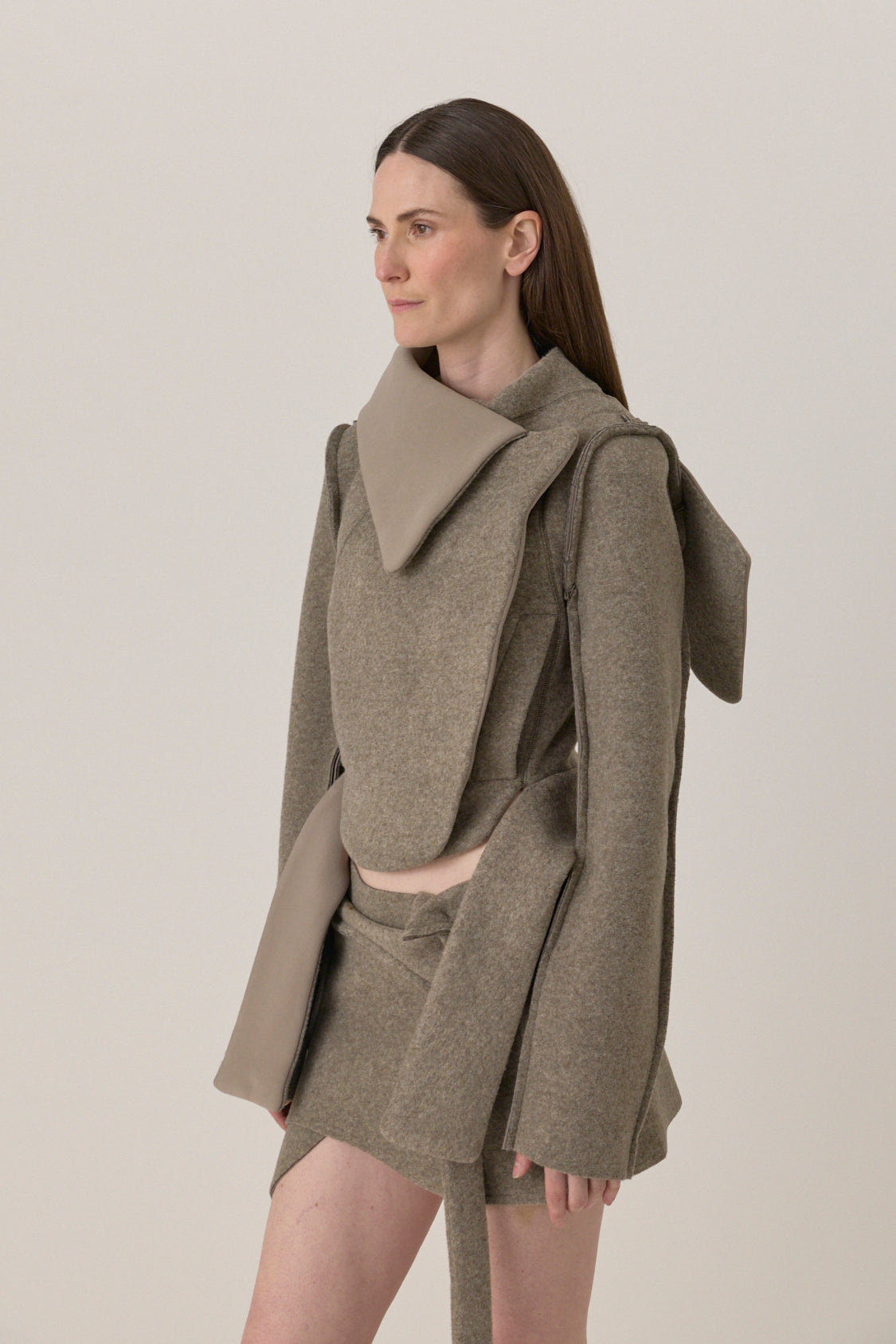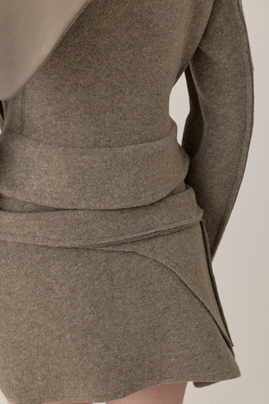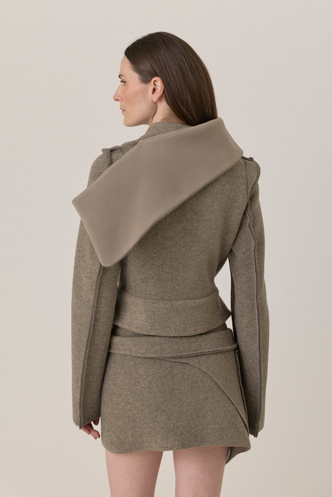 Felted scuba biker jacket with sculpted collar, wrap front, and knotted belt detail. Finished with elongated sleeves and asymmetric seaming.