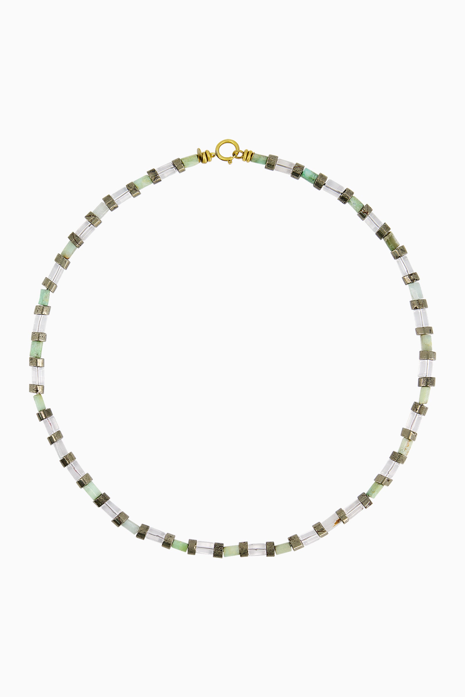 Necklace composed of jade, pyrite, and hand-carved rock crystal beads.
