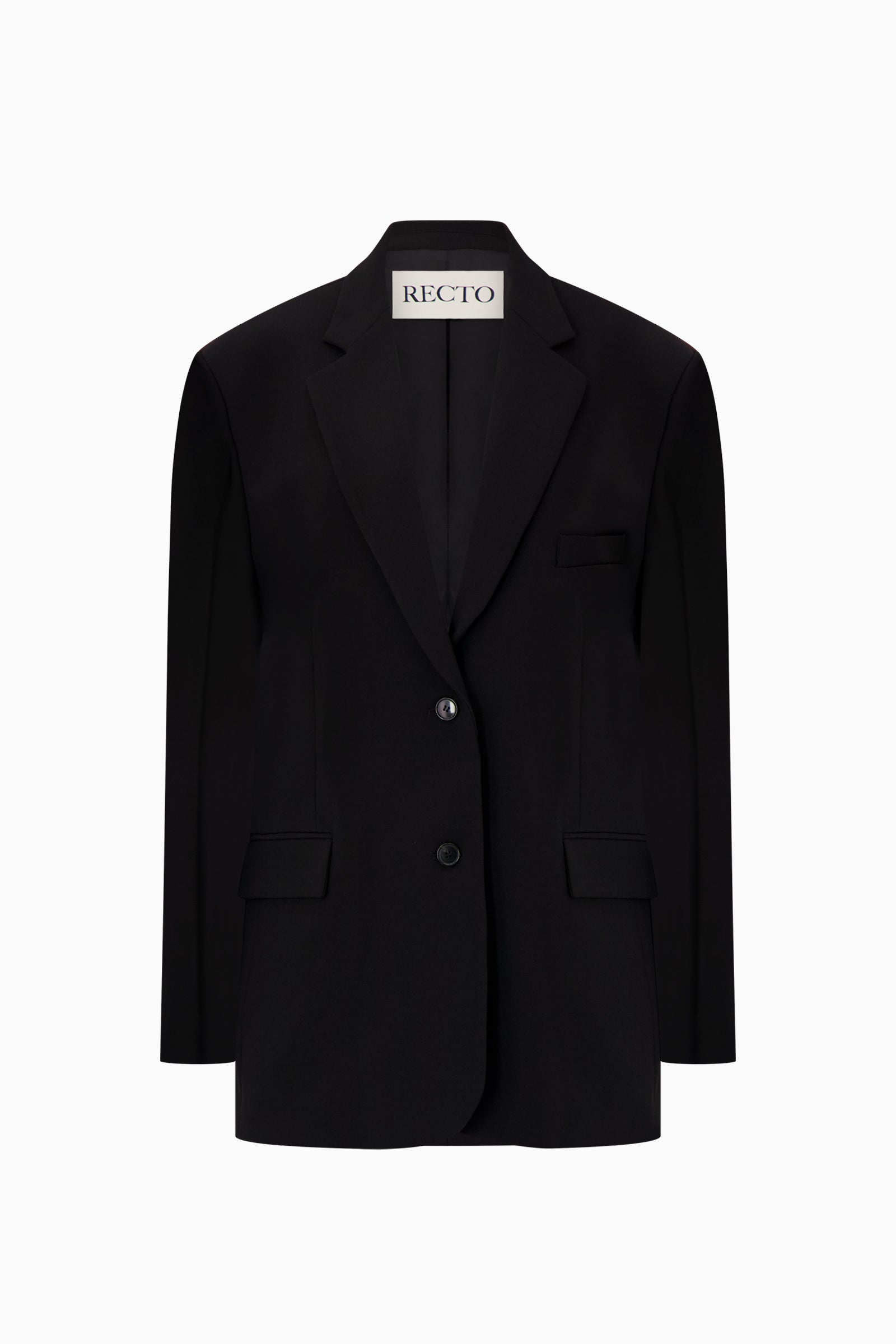 Tailored jacket with notched lapels, two-button front, and flap pockets. Designed with a straight fit and single-breasted silhouette.