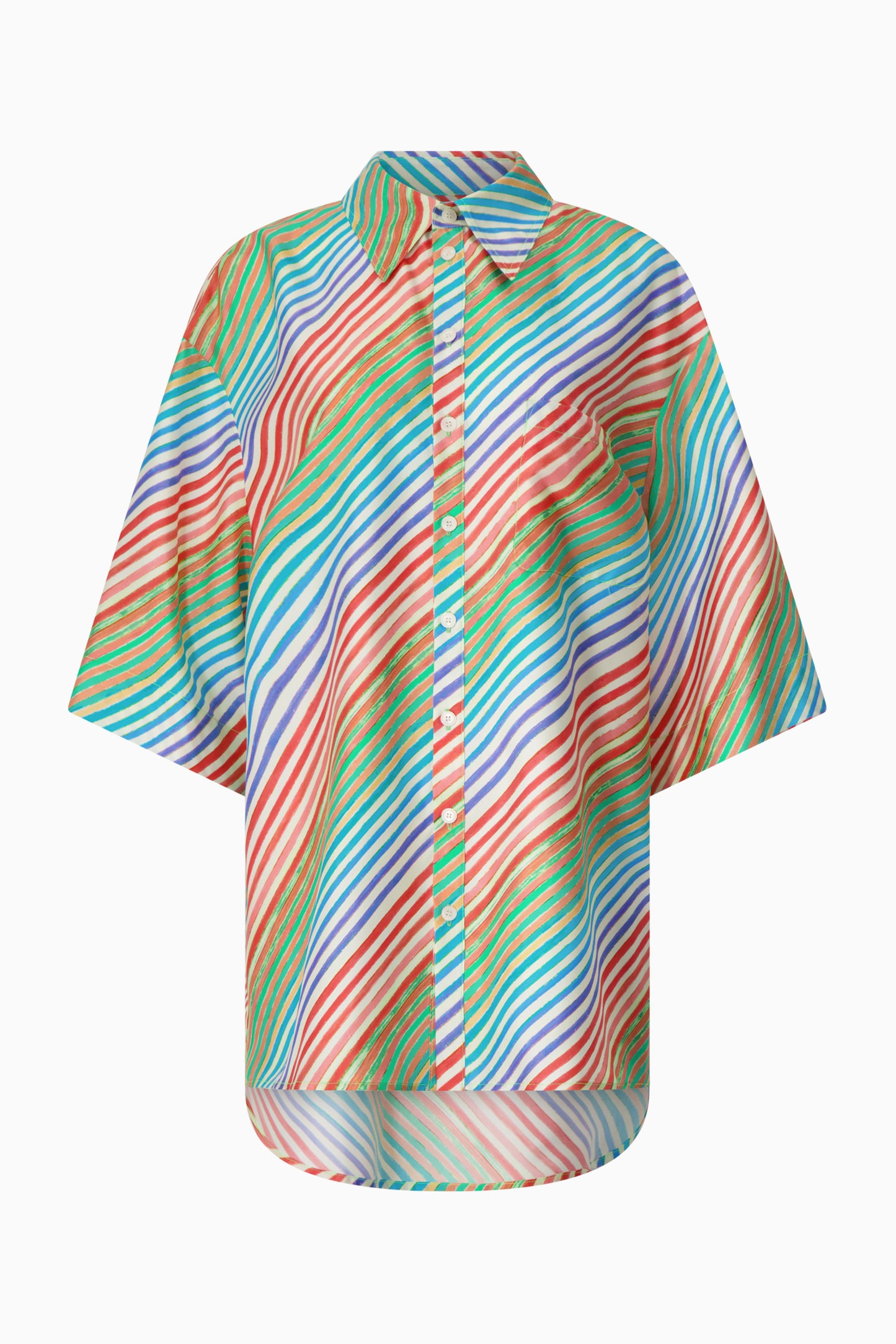 Silk bias jumbo shirt, featuring vibrant crayon stripes. Spread collar; button closure. Short sleeves. Chest patch pocket. Oversized silhouette. Back yoke; box pleat.