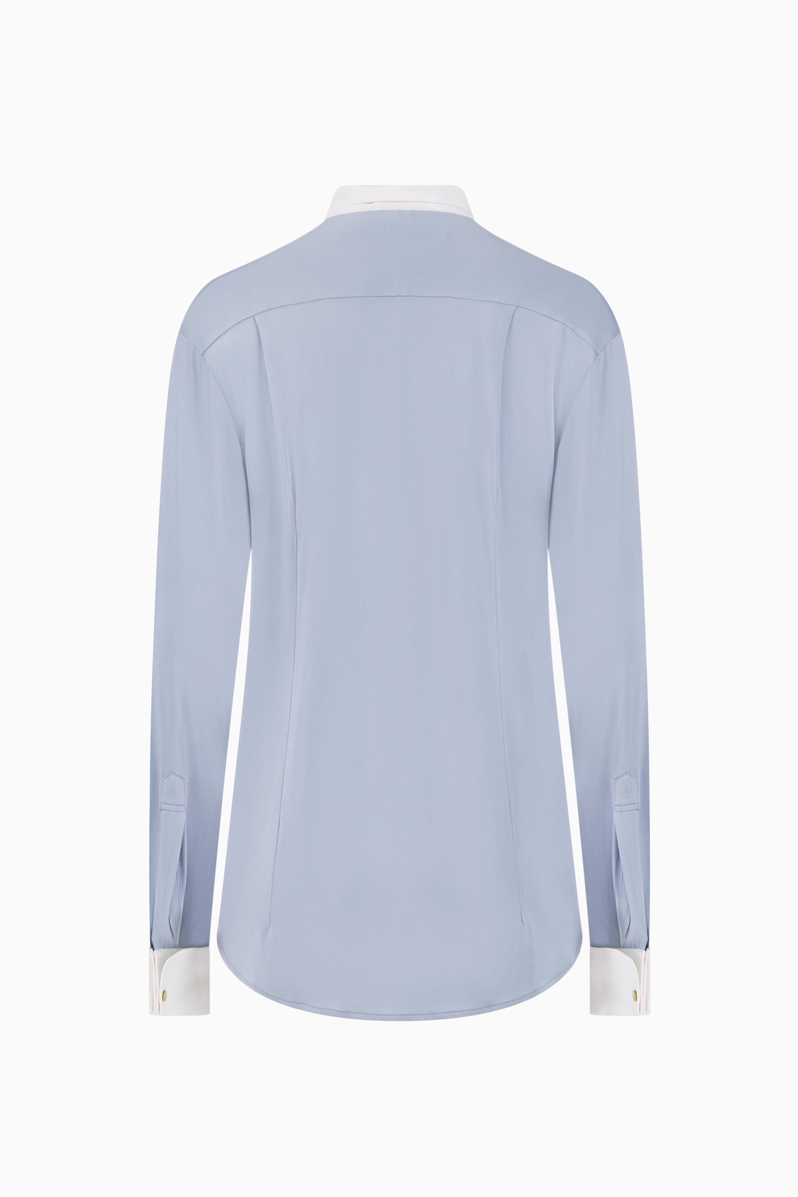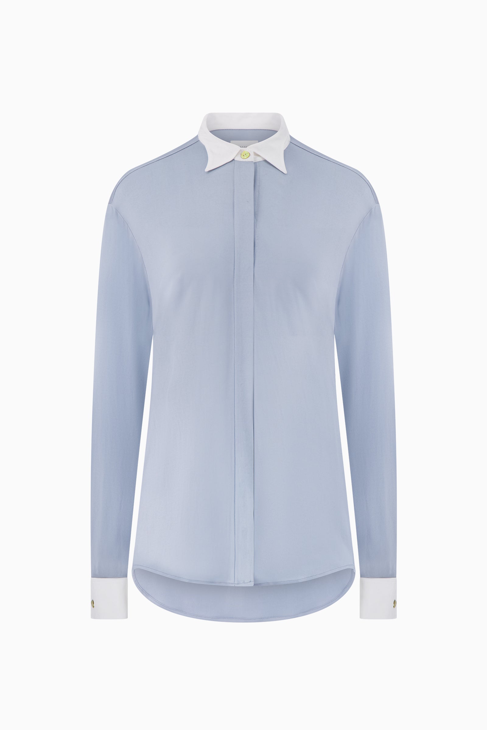 Long-sleeve shirt crafted from fluid silk jersey. Featuring pointed winged collar, concealed button placket, and curved hem. Finished with contrast enamel buttons at collar and cuffs.
