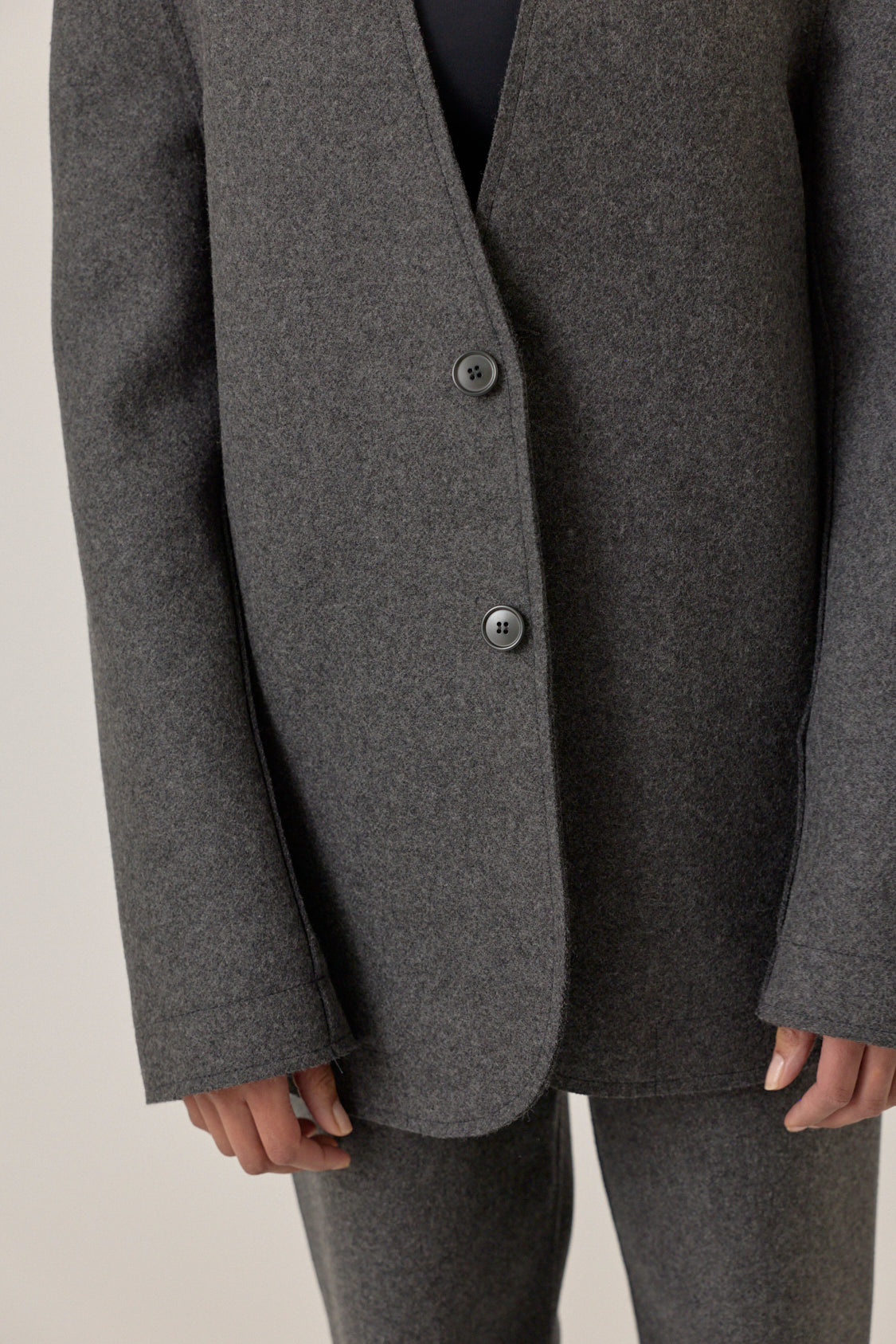 Tailored jacket in structured wool with a sculpted fit. Featuring a deep V-neckline, two-button front closure, and subtle curved seaming that defines the waist.