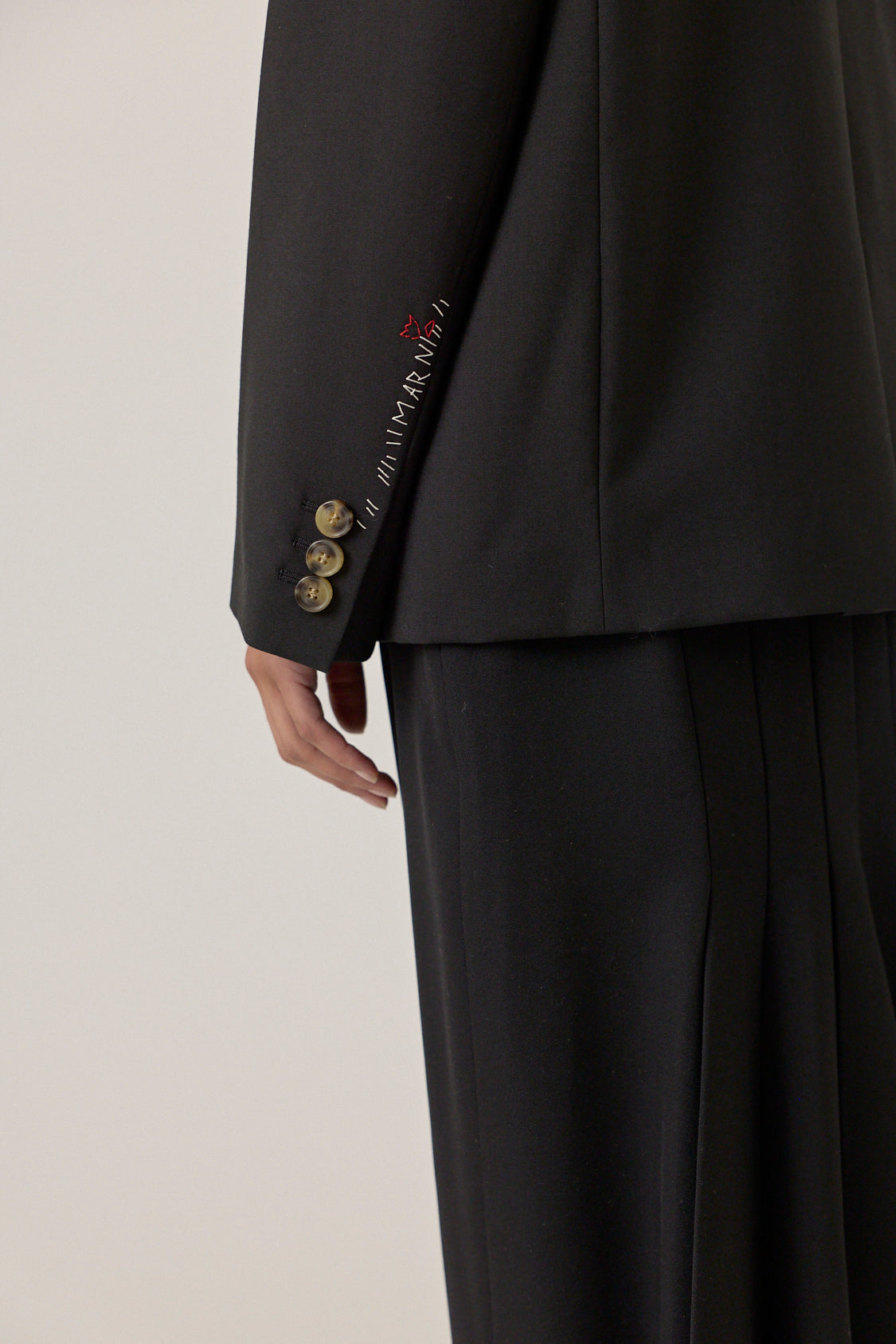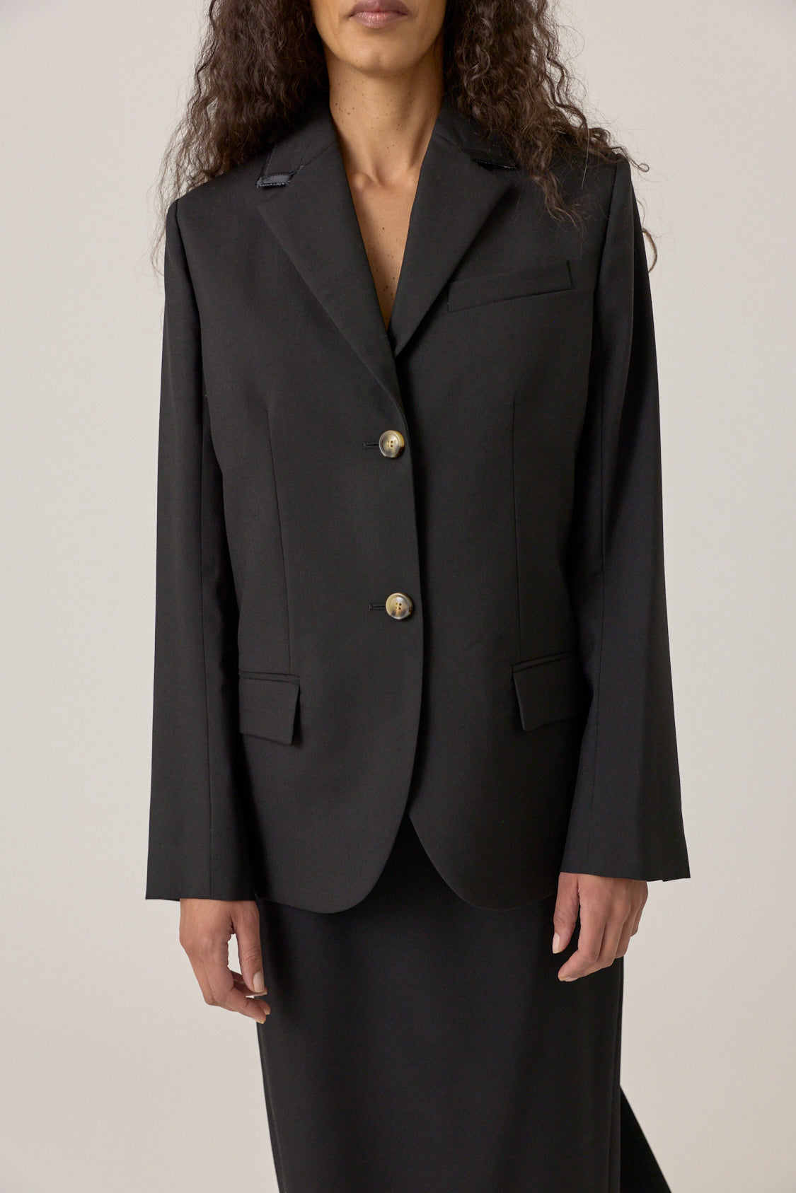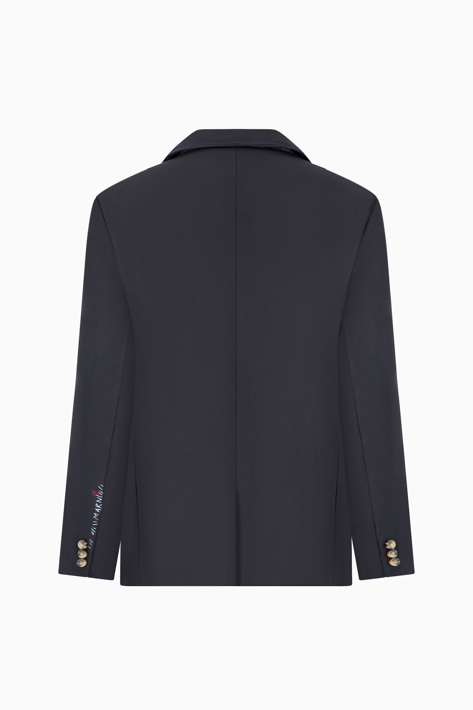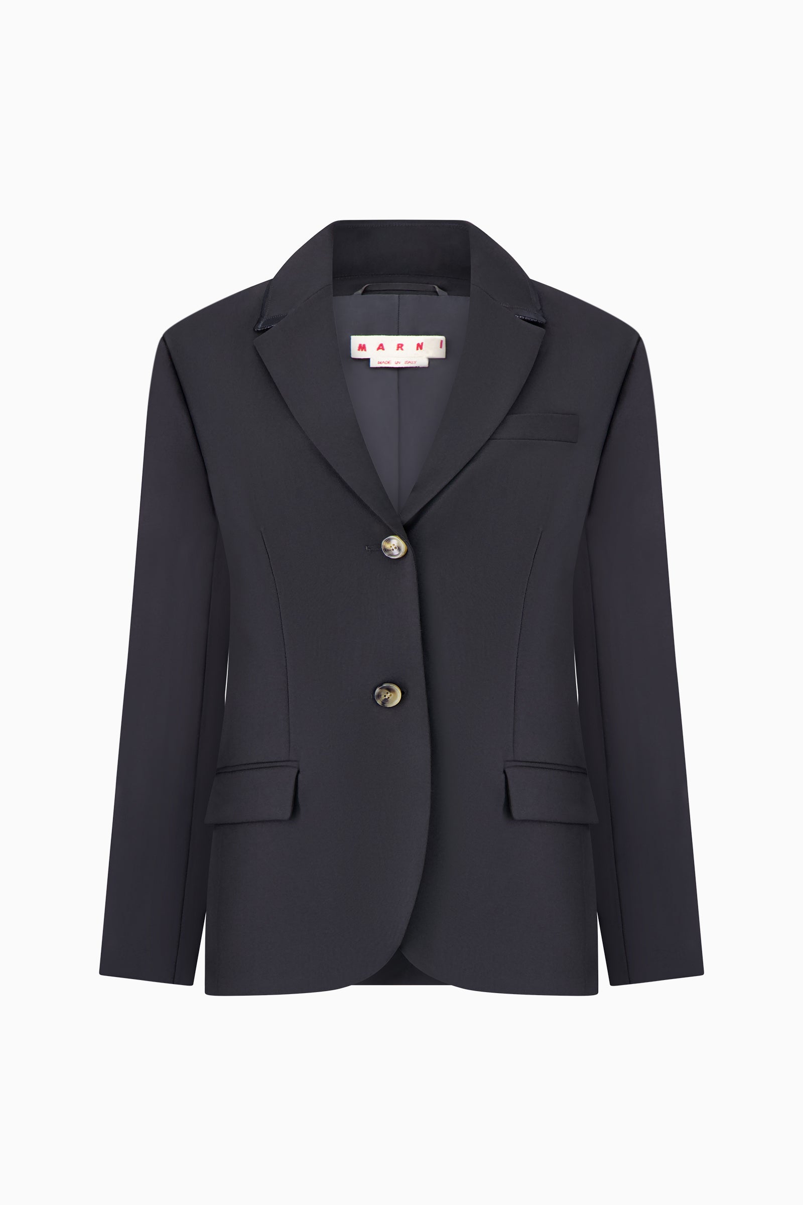 Single-breasted two-button blazer. Satin trim on back neck. Front belt pocket. Lined. Regular fit. Marni mending on left sleeve bottom.