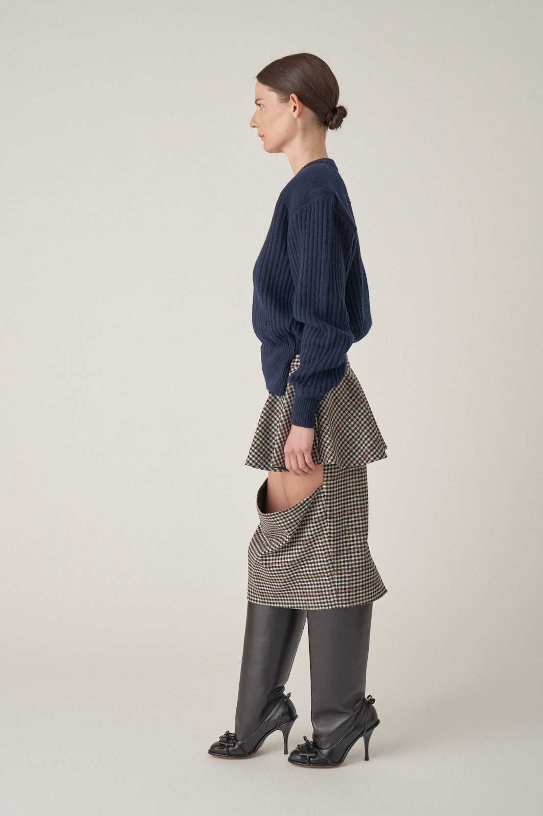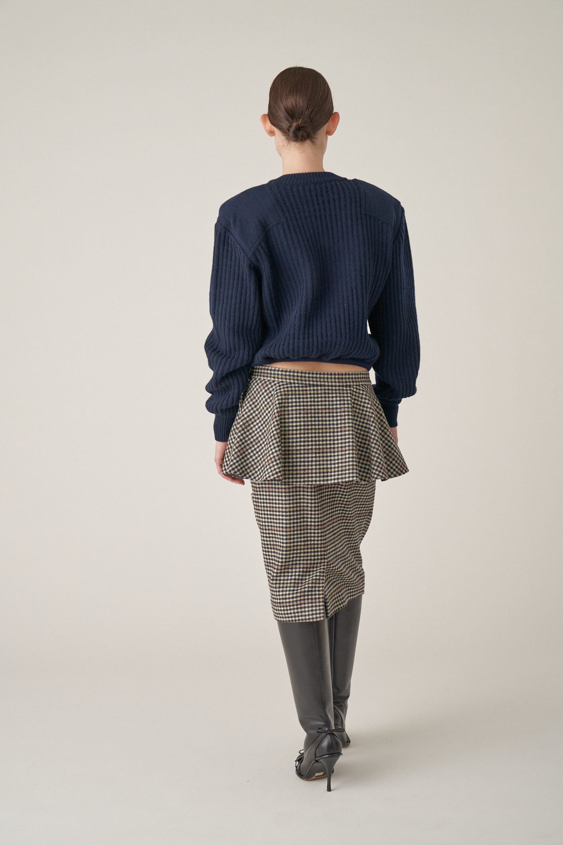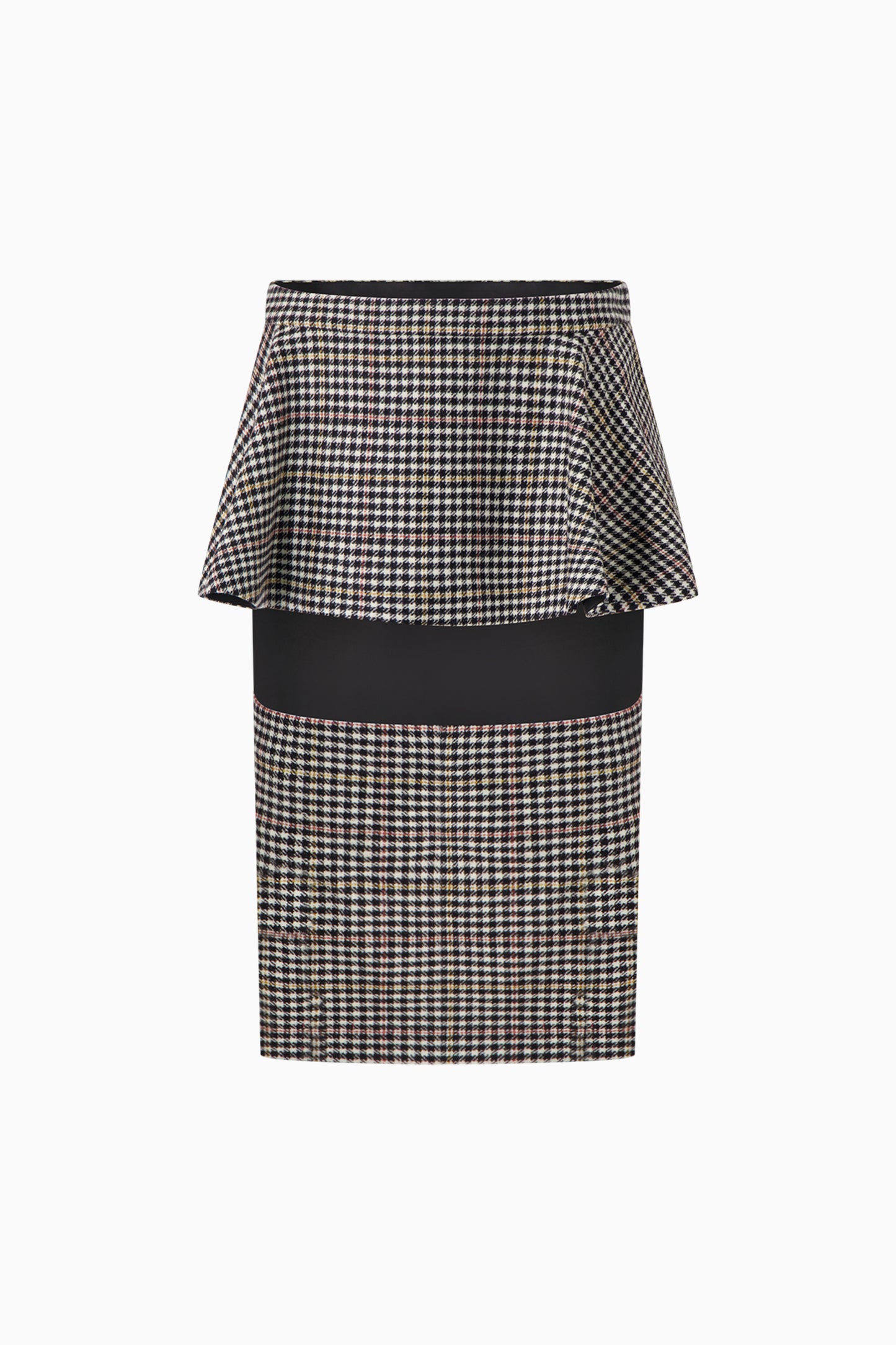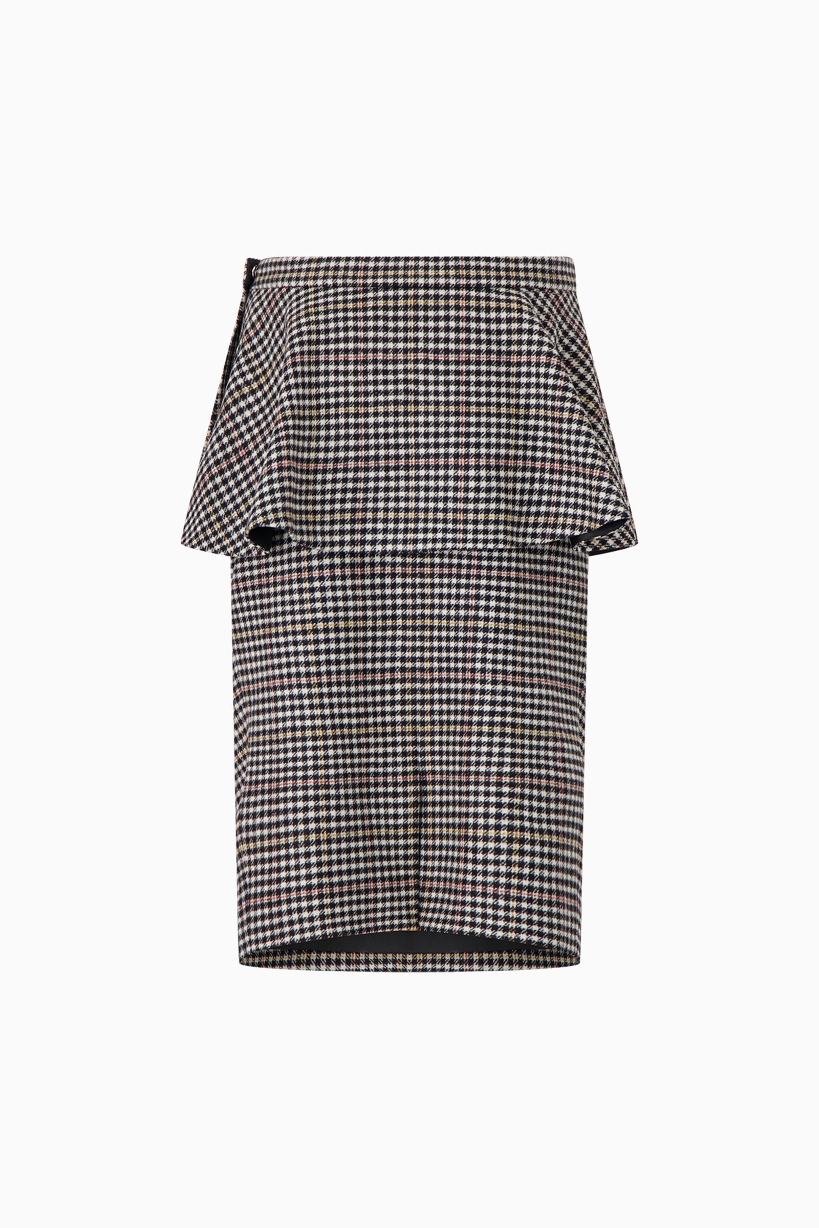 Sliced pencil skirt in tartan. Features a peplum over a cutout pencil skirt.