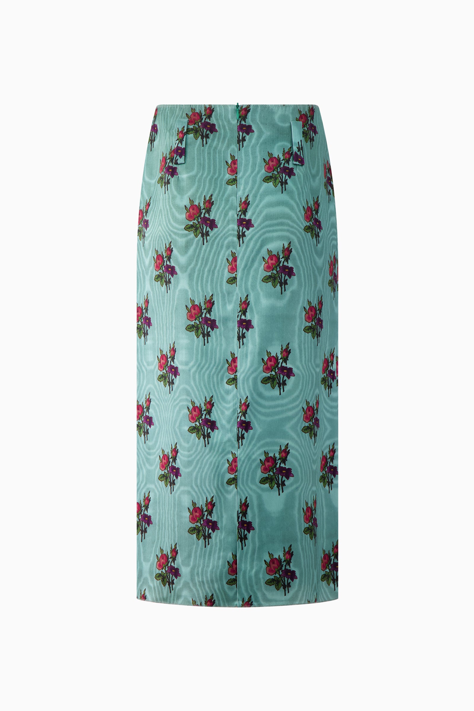 Satin midi skirt featuring an all-over rose print. Designed with a straight silhouette, concealed back zip, and subtle sheen finish.