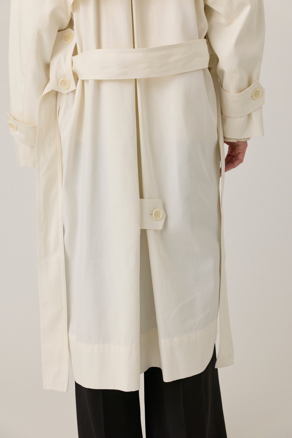 Medium-weight trench in soft lyocell cotton blend. Flap pockets at chest. Detachable tie belt with pleating at center back.