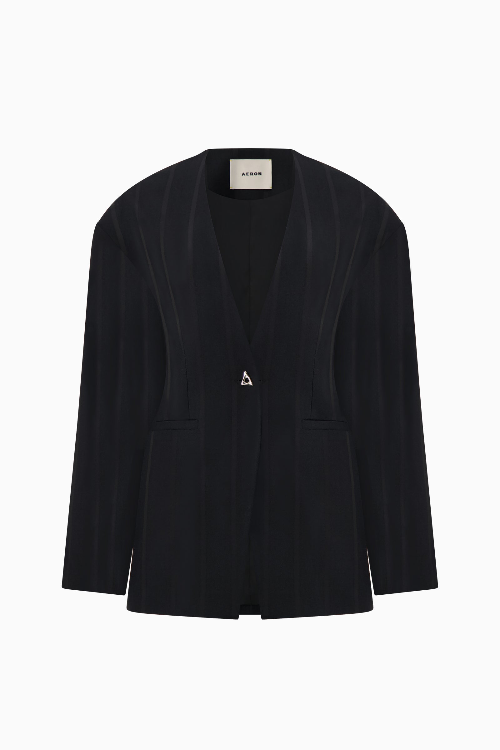 Collarless waisted blazer with subtle tonal stripes. Finished with signature A-button.