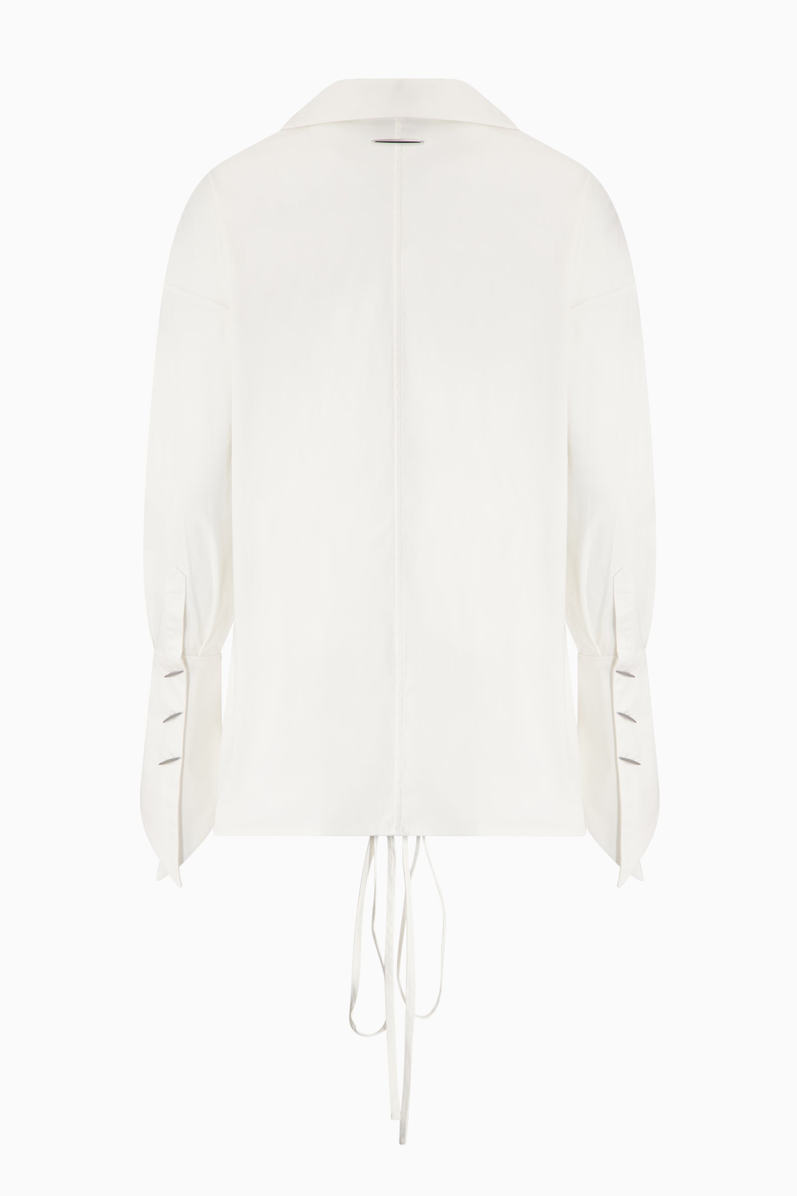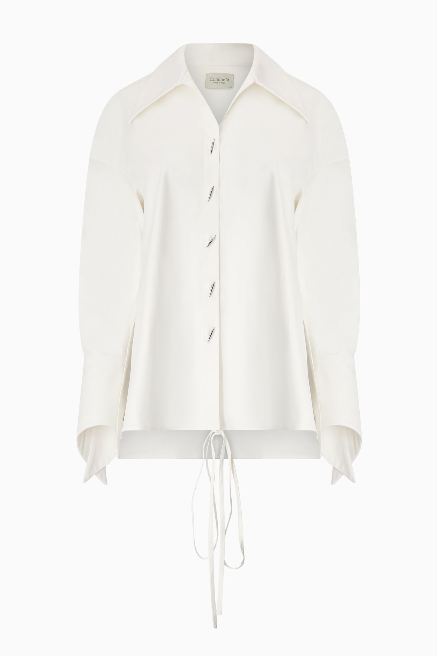 Oversized wrap shirt with flared collar and angled sleeves with metal buttons. Can be styled as a button-up or tied as a wrap shirt.