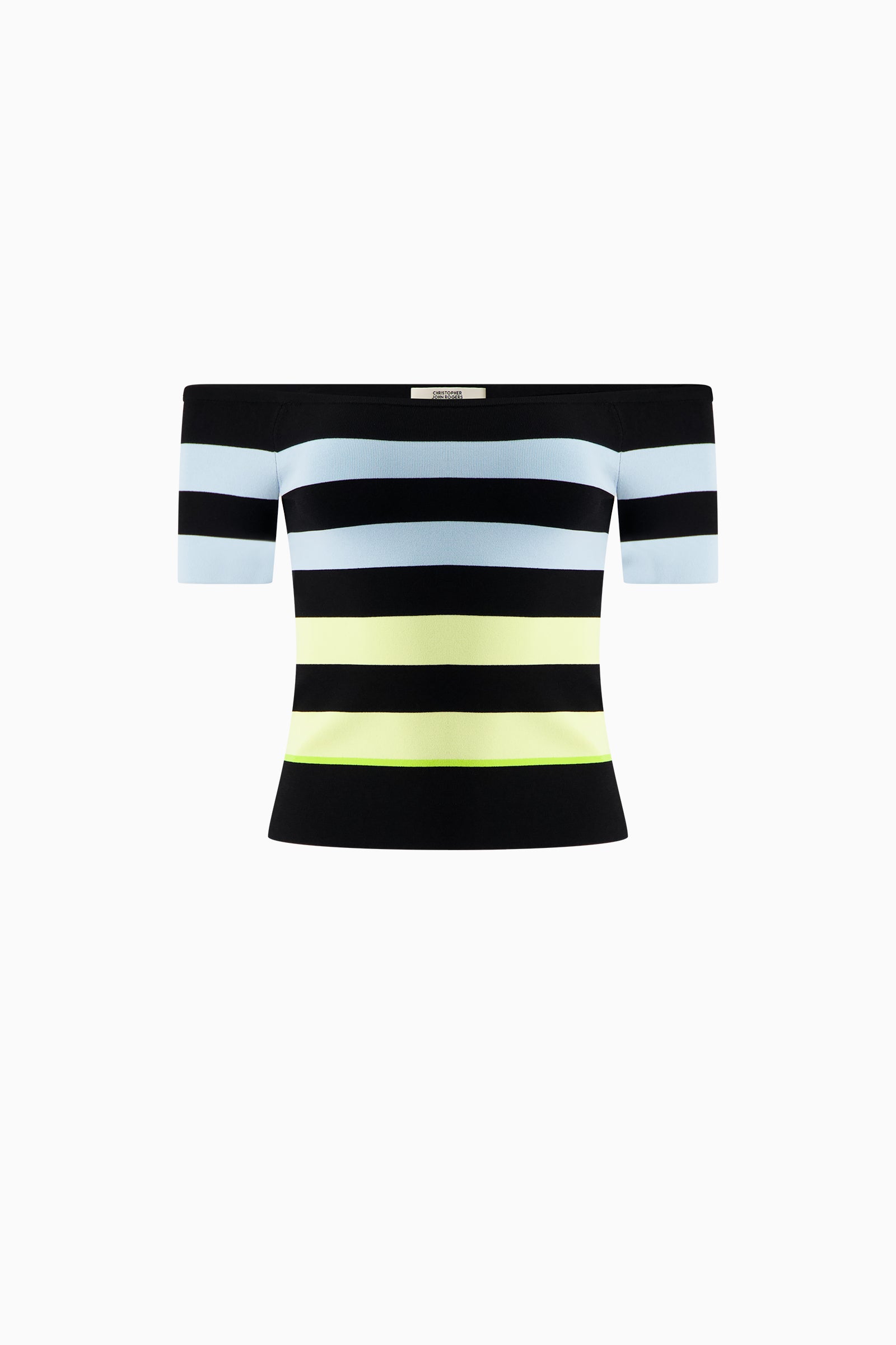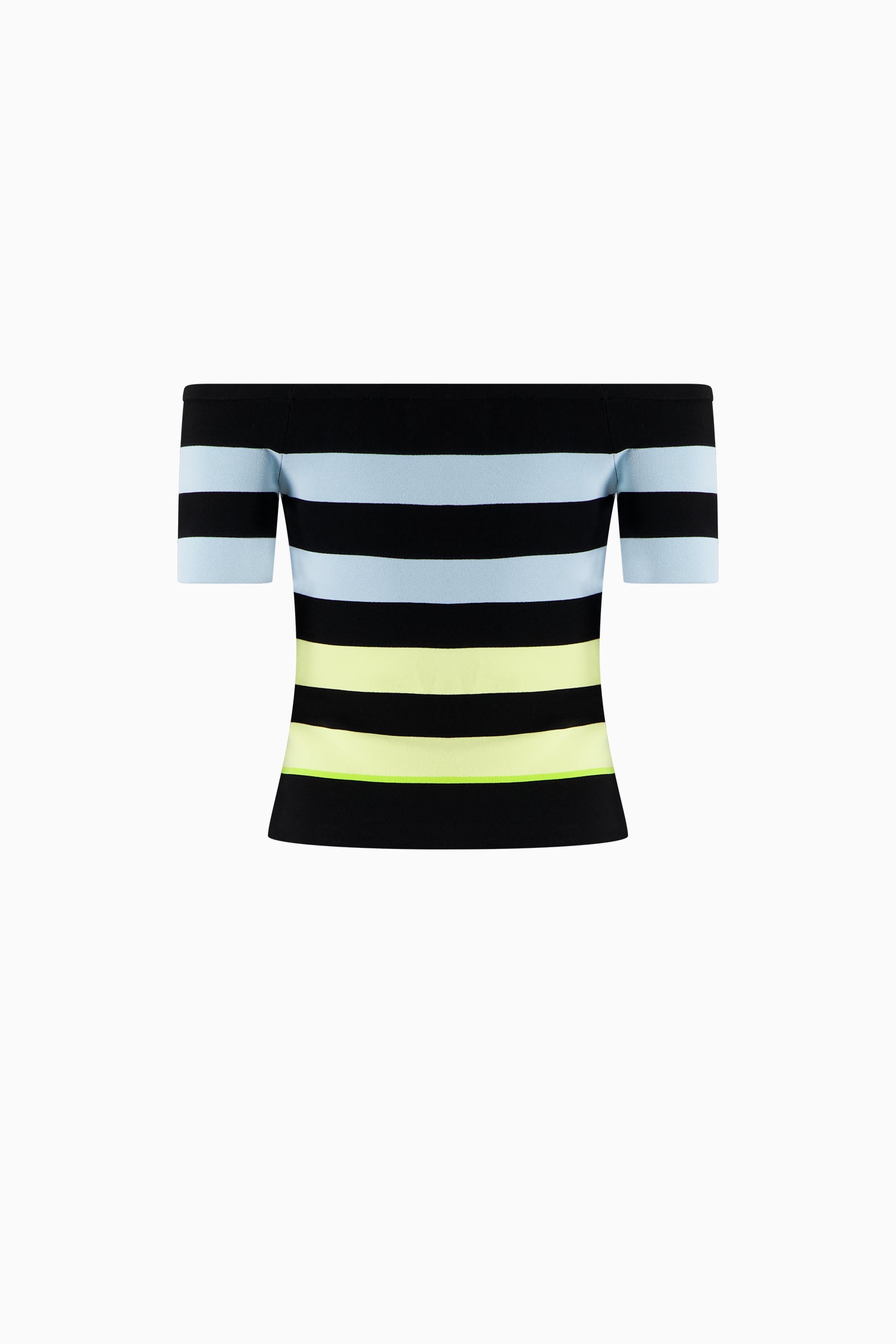 Fitted off-shoulder top in bold horizontal stripe. Short sleeves and body-skimming silhouette.