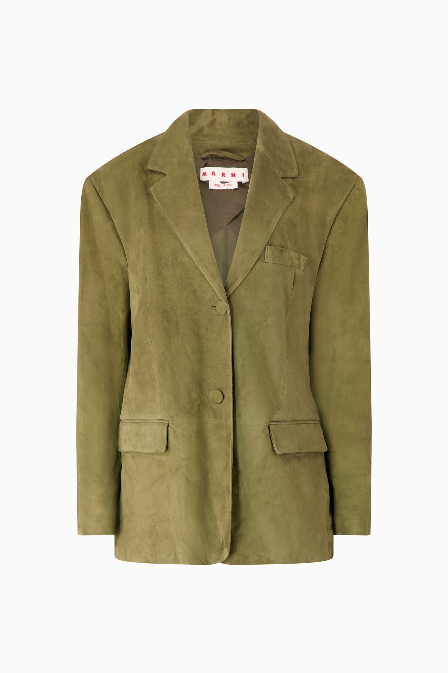 Soft suede jacket with lapel collar and button closure. Three front patch pockets. Embossed Marni patch on the back neck. Unlined.
