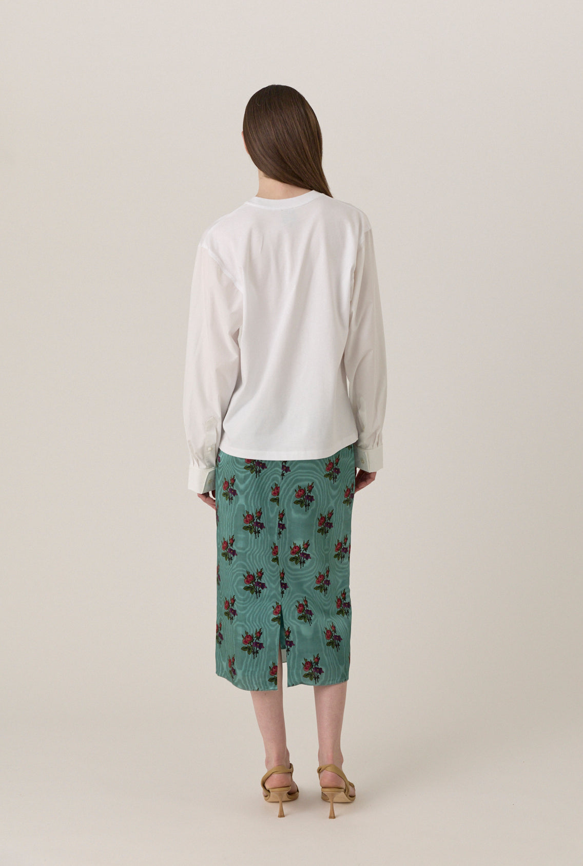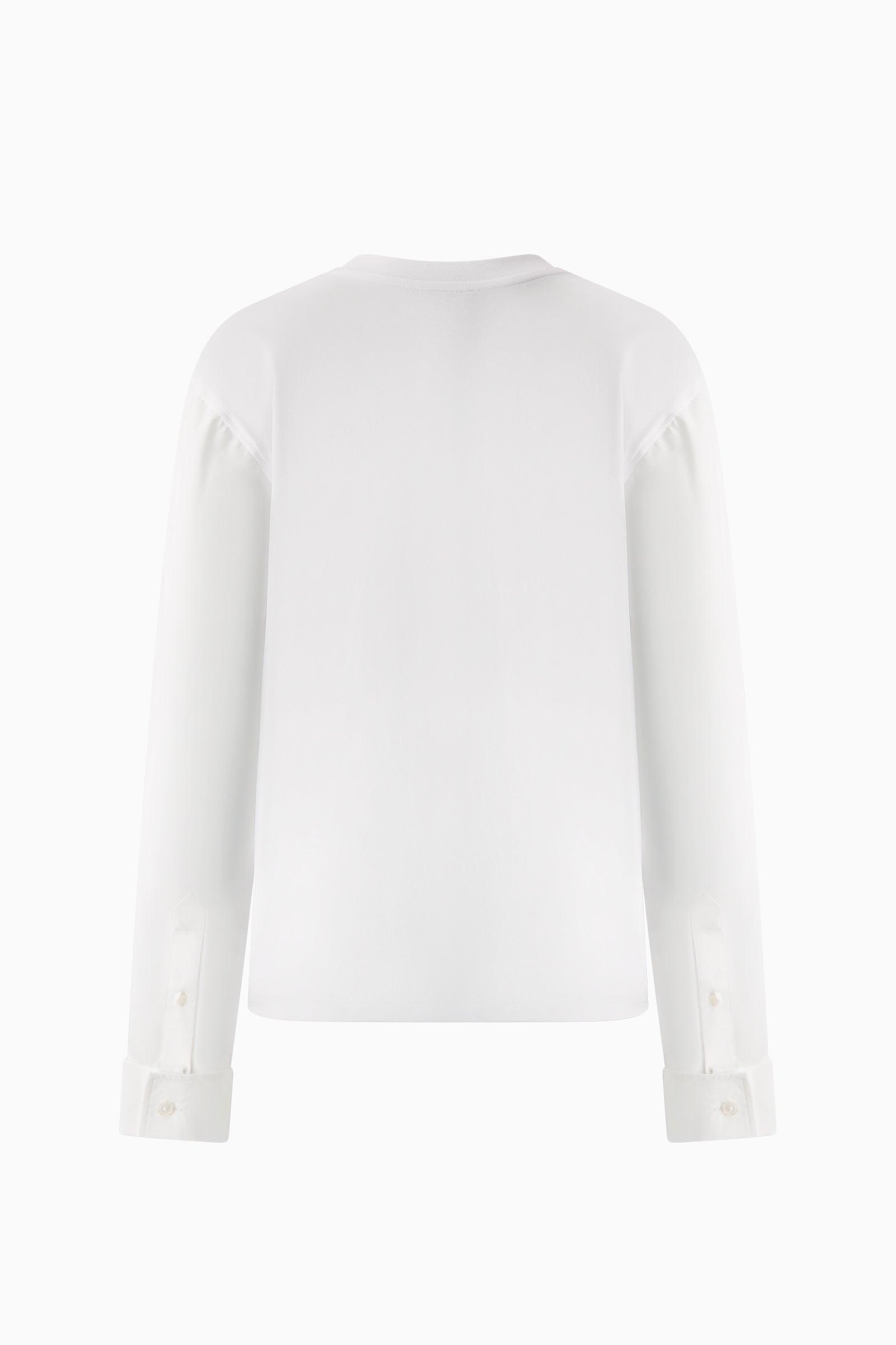 Hybrid crewneck top combining a soft cotton jersey body with contrast striped shirting sleeves and buttoned cuffs.