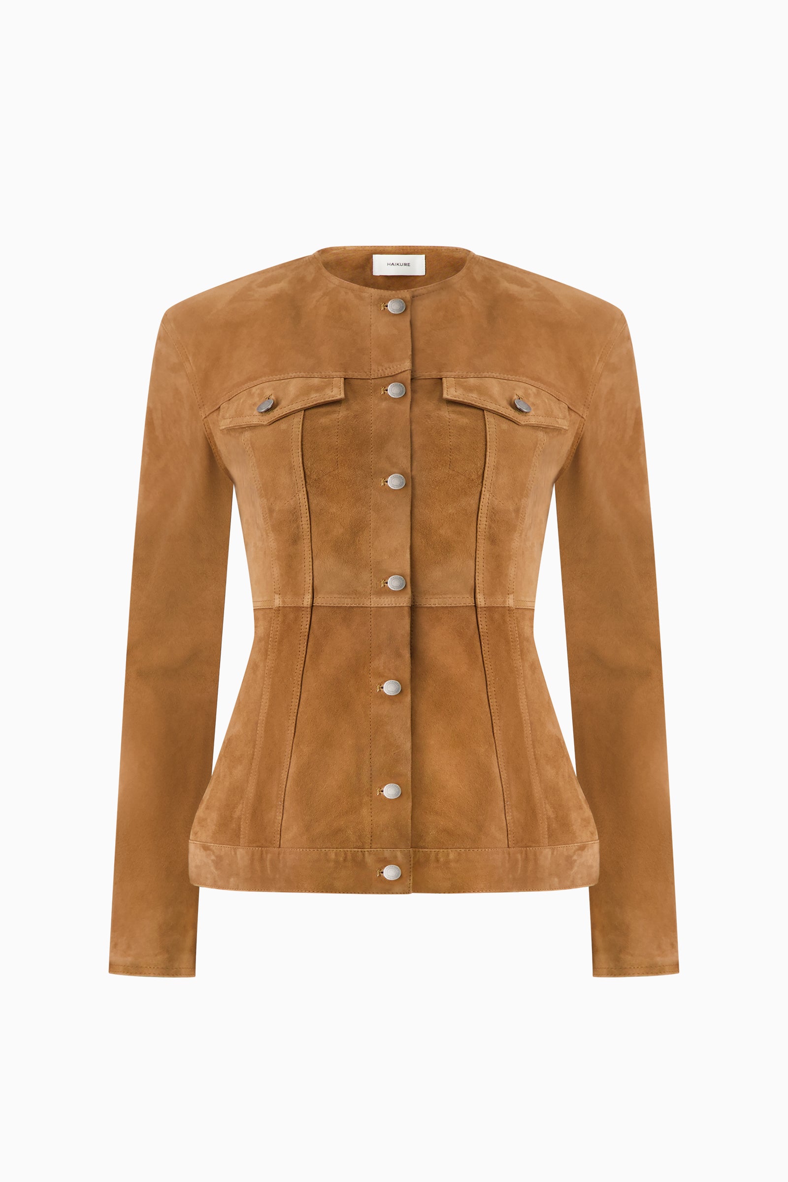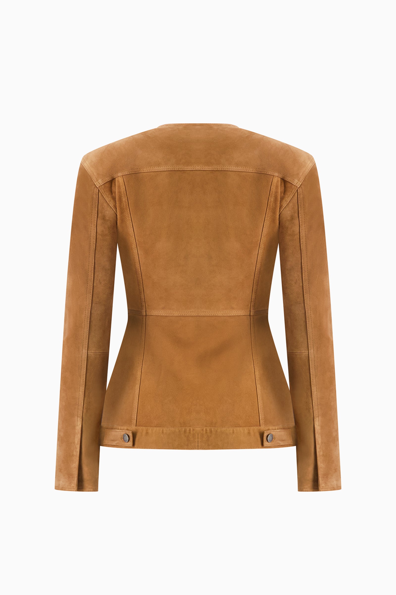 Jacket made from butter-soft suede with collarless neckline and nips in at the waist to create an hourglass shape.