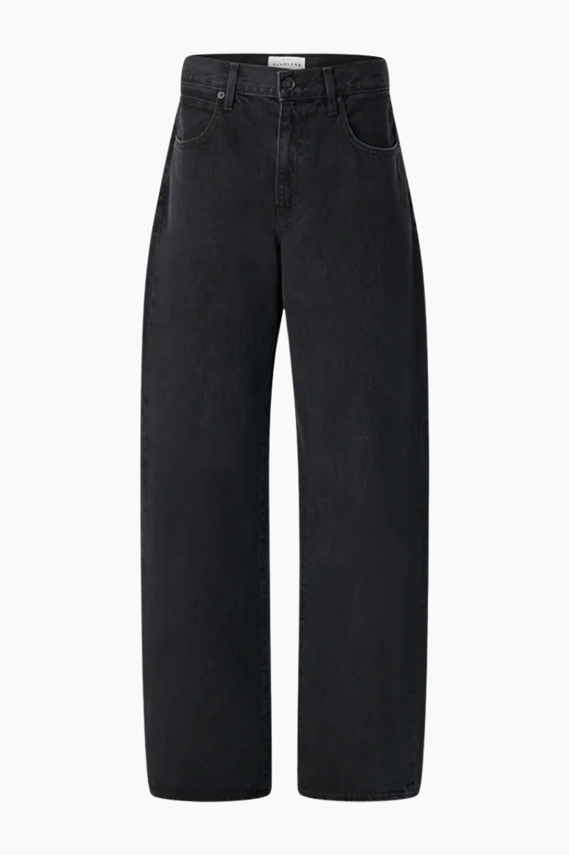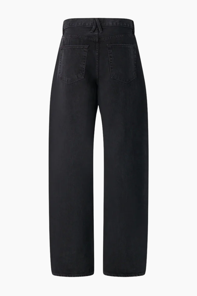 Jeans cut with a low-rise waist, with a boyfriend shape that curves at edges.