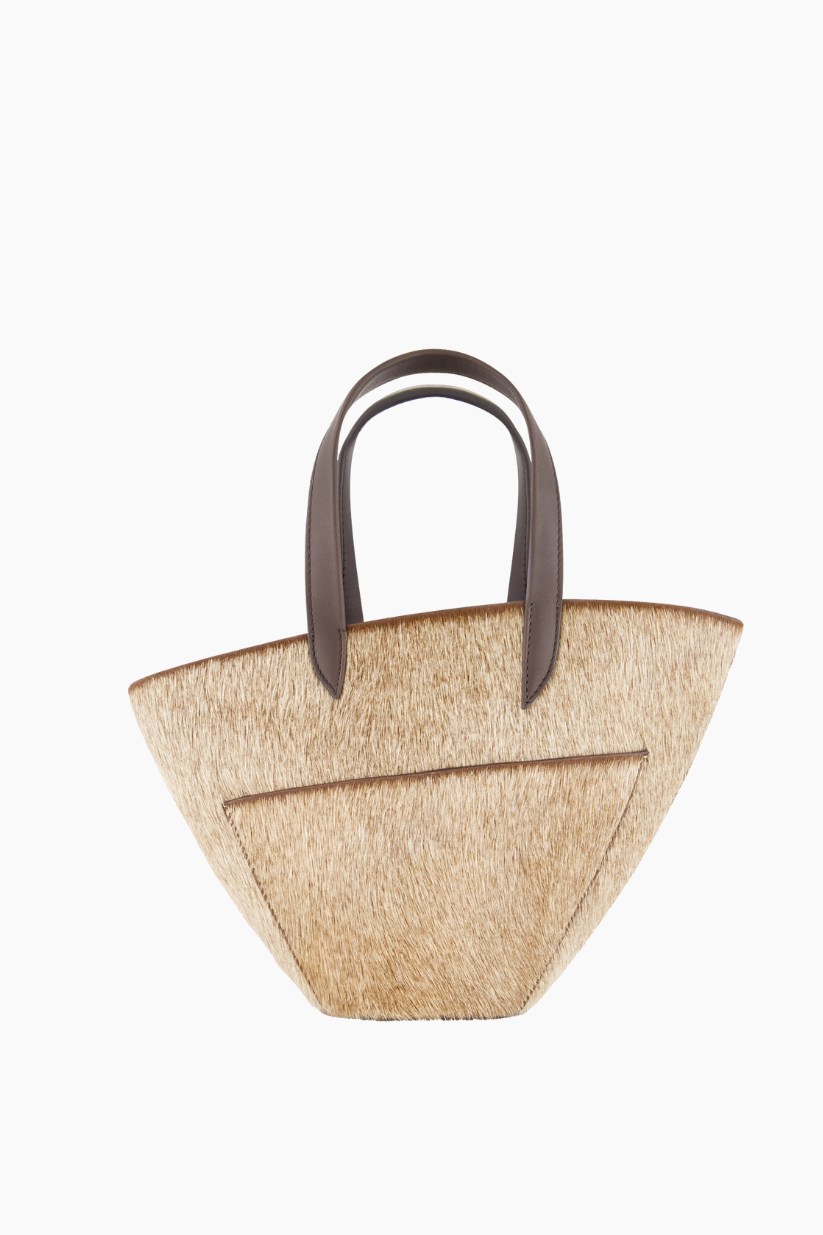 Handheld small tote with removable crossbody strap, as well as top handles. Asymmetric curve top edge.